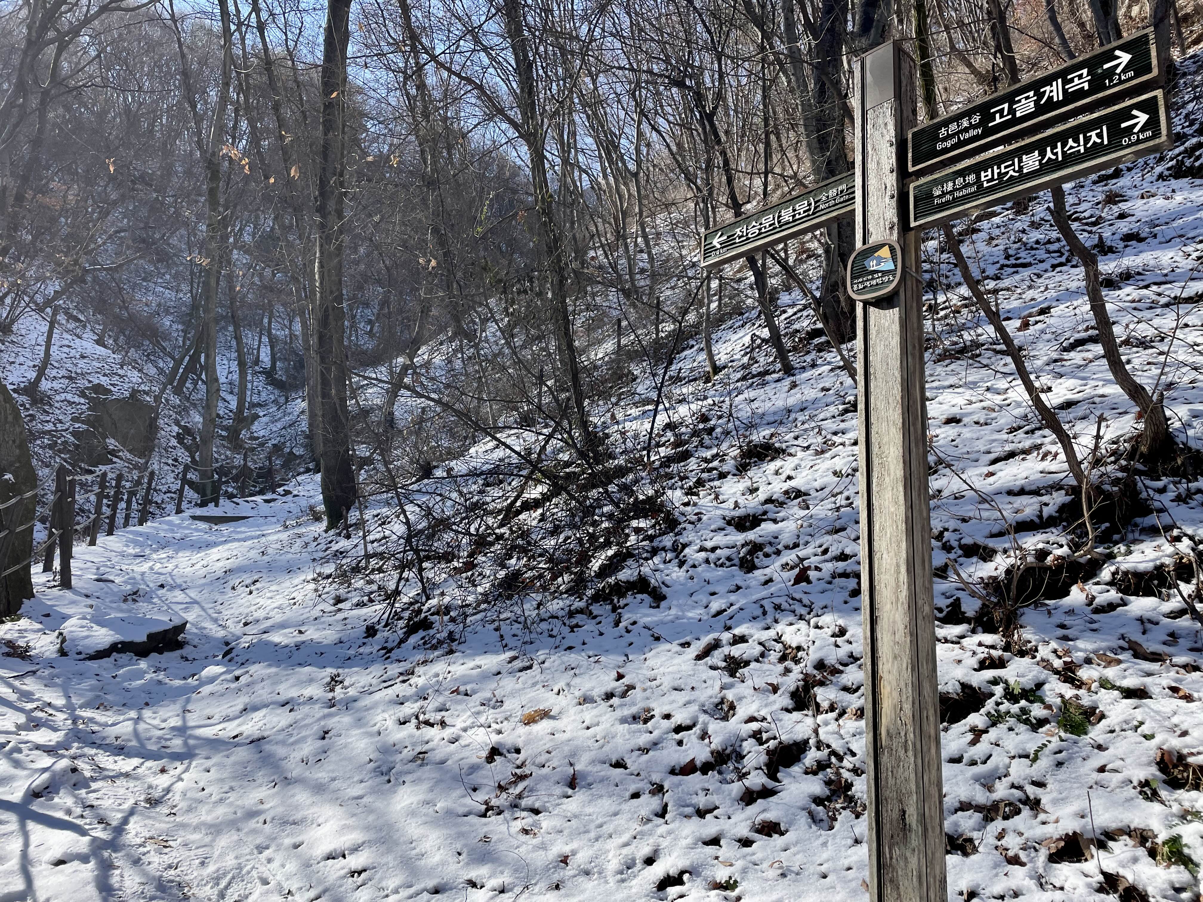 고골에서 시작하는 등로에는 그때와 다름없이 차가운 날씨에 녹지못한 눈이 덮여있다. 눈 아래는 풀린날씨에 녹아내린 눈이 얼어있어 걸음을 옮기기가 버겁다.