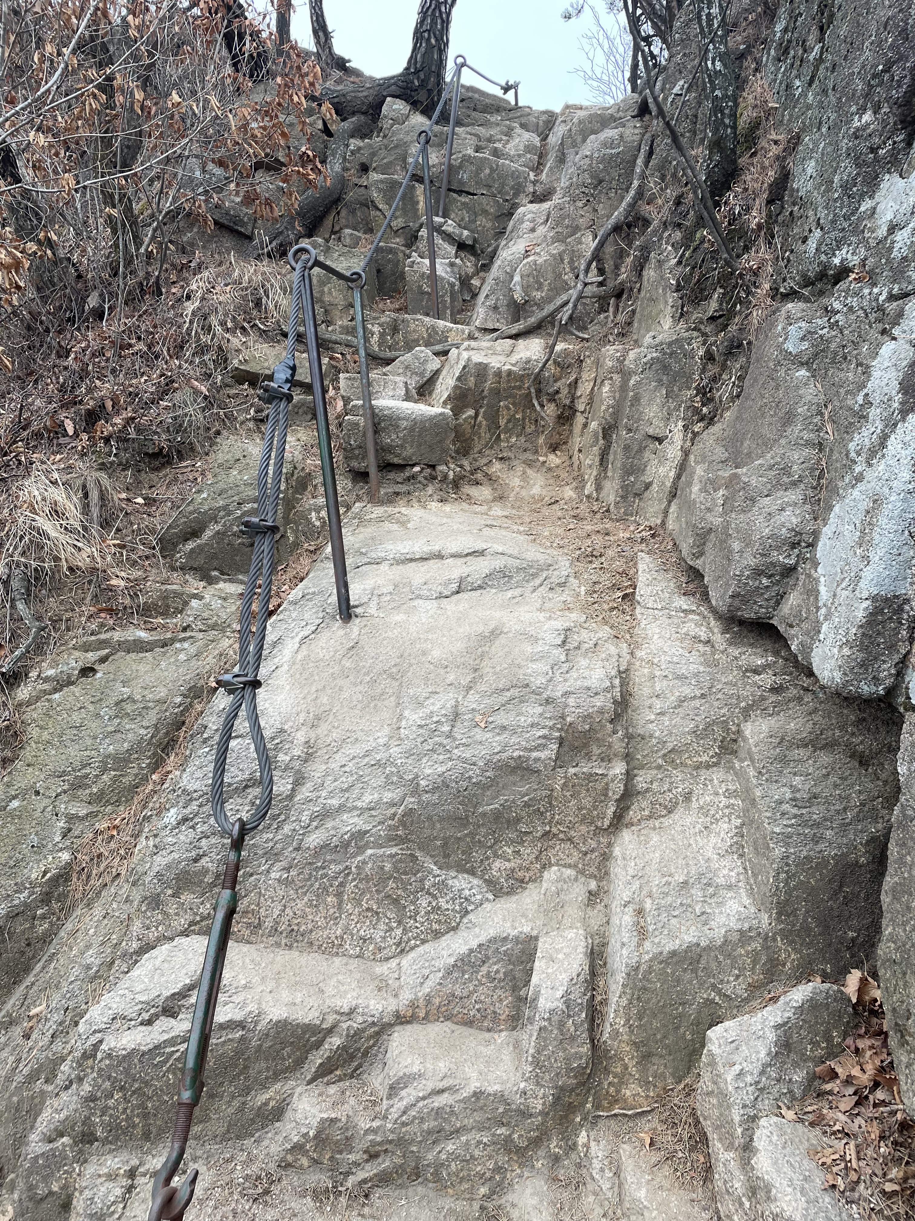 성체가 워낙 작은 규모에다 암벽지대는 여장마져 세워지지 않아 때로는 성안길로 걷다가 성안길이 여의치 못하면 성벽위를 걸어오른다. 암문에서 사뭇 평탄한 길을 오르다가 용출봉 자락 아래부터는 말 그대로 험난하다. 스틱을 한 손에 잡고 다른 한 손으로 바위에 설치된 쇠줄을 잡고 거의 기어올라가야 한다. 힘을 쏟으며 암벽 사이로 난 쇠줄을 잡고 한참 씨름하다보면 어느덧 정상이다. 잠시 숨을 고르고 이내 용혈봉으로 산행을 이어간다. 용출봉 암릉길을 내려오다 보면 각기 다른 형상을 하고 서있는 바위를 볼 수 있다. 누워있는 물개가 백운봉을 향해 머리를 들고 포효하는 모습처럼 보이는 바위 옆에는 위아래가 분리된 두 개의 바위가 서있다. 그 사이에 용혈봉으로 오르는 좁은 바위길 등로가 보인다.