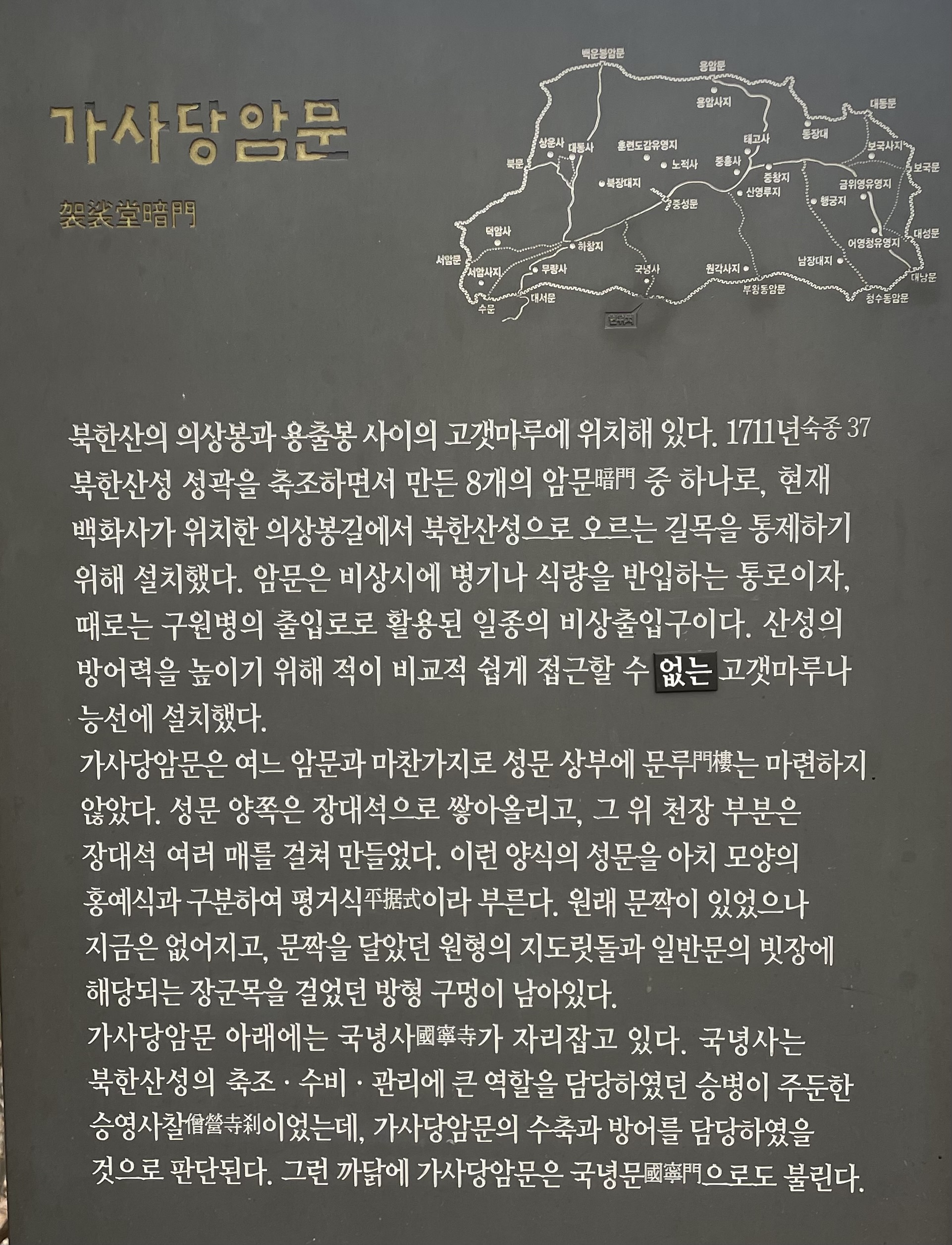 국녕사 좌불 뒤로 난 등로를 따라 10여분 오르니 의상능선에 세워진 세개의 암문 중 첫번째 성문, 가사당암문이 나온다. 북한산성 입구에서 바라볼 때 오른쪽에 날카롭게 사있는 의상봉에서 용출봉으로 이어지는 미릿한 고갯마루에 서있다. 암문은 비상시에 병기나 식량을 반입하는 통로이자, 때로는 구원병의 출입로로 활용되는 일종의 비상출입구이다. 산성의 방어력을 높이기 위해 적이 비교적 쉽게 접근할 수 없는 고갯마루나 능선에 설치하였다.