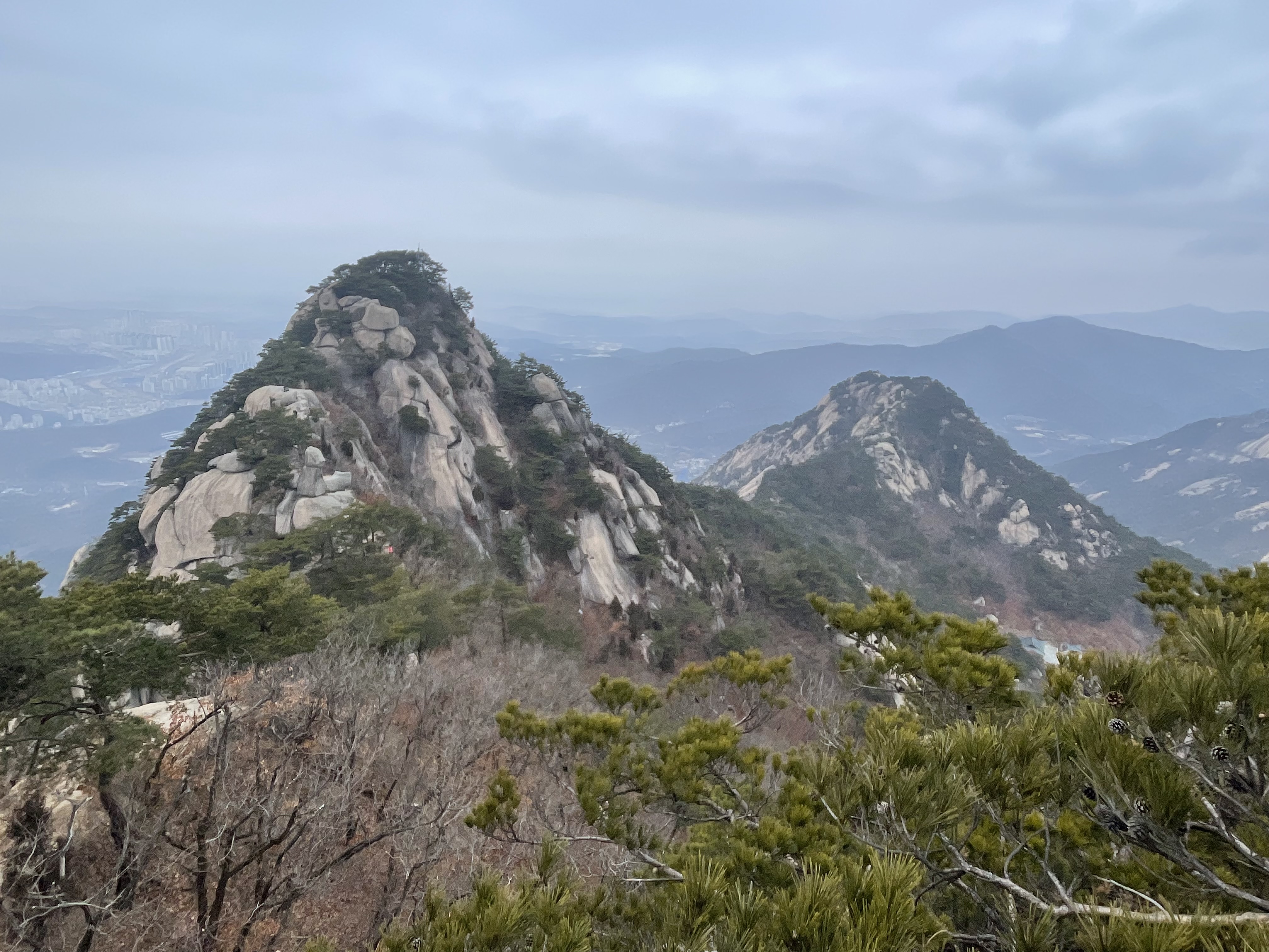 용혈봉에 올라 잠시 뒤를 돌아본다. 의상봉과 용출봉이 마치 이등변삼각형 두개를 세워놓은 것처럼 날카롭게 서있다. 그 사이에 가사당암문이 숨어있고 오른쪽에 가사당암문을 수비를 담당하던 승병이 기거하였다는 국녕사 법당 지붕이 살짝 보인다. 특히난 오를 때는 제대로 경사진 모습을 몰랐는데 여기서 보니 망루처럼 솟구쳐오른 용출봉이 예리하다. 봉우리 그자체가 단단한 천연성벽과 망루로서 손색이 없다. 누가 알려주지 않으면 북한산성 줄기라 알수 있을까?
