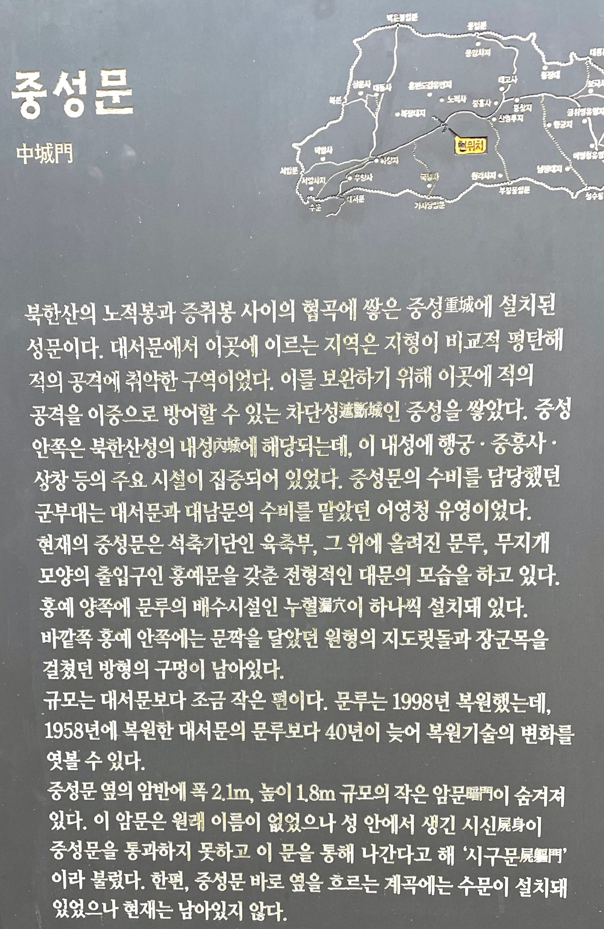 중성문은 북한산의 노적봉과 증취봉 사이의 협곡에 설치된 성문이다. 대서문에서 이곳에 이르는 지역은 지형이 비교적 명탄해 적의 공격에 취약한 구역이었다. 이를 보완하기 위해 이곳에 적의 공격을 이중으로 방어할 수 있는 차단성분인 중성 역할을 담당하였다. 중성문 옆의 암반에 폭 2.1m, 높이 18m 규모의 작은 암문이 숨겨져 있다. 이 암문은 원래 이름이 없었으나 성 안에서 생긴 시신통들이 중성문을 통과하지 못하고 이 문을 통해 나간다고 해 시구문이라 불리었다.