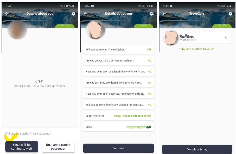 여권정보 확인을 마치면 환승객인지 방문객인지를 묻는다. "Yes, I will be coming to visit" 누르면 몇 가지 질문지를 보여준다. 뉴질랜드에 머물 것인지? 호주 영주권자인지? 범죄행위로 유죄판결을 받은 적이 있는지? 과거 뉴질랜드 혹은 다른 나라에서 추방된 사실이 있는지? 의료 혹은 치료 목적으로 뉴질랜드를 방문하는지 등을 물어보는데 해당 사항에 Yes 혹은 No로 답하면 된다.