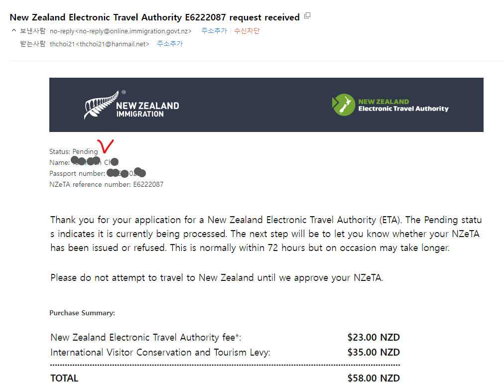 모바일이나 홈페이지를 통해 신청하고 결제까지 마치면 영수증과 함께 접수되었다는 메일을 보내준다. 수신 메일함에 도착하지 않았다면 스팸함도 함께 확인해줘야 한다. 때로는 스팸으로 처리되어 그쪽 함에다 넣는 경우도 있다. 메일을 열어보면 Status : Pending으로 표시되어 온다. 즉 처리 중이라는 의미이고 72시간 내에 발급할지 거절할지를 알려준다는 안내문을 동봉한다.