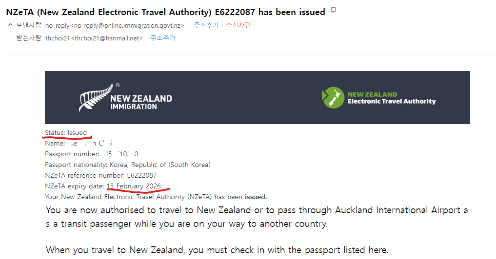 접수 메일을 받아 열어보고 있는데 발급되었다는 메일이 연달아 온다. 신청한 내용에 별 다른 사항이 없어선지, 아니면 이미 ABTC카드로 승인된 것이 있어서 그랬는지는 몰라도 곧바로 발급되었다는 메일을 받으니 기분마저 좋아지고 마치 뉴질랜드 여행 중에도 뜻밖의 행운이 올 것만 같다. NZeTA 유효기한은 발급일로부터 2년간이므로 이번에 받은 걸로 한번 더 가볼 수도 있을 거 같다.