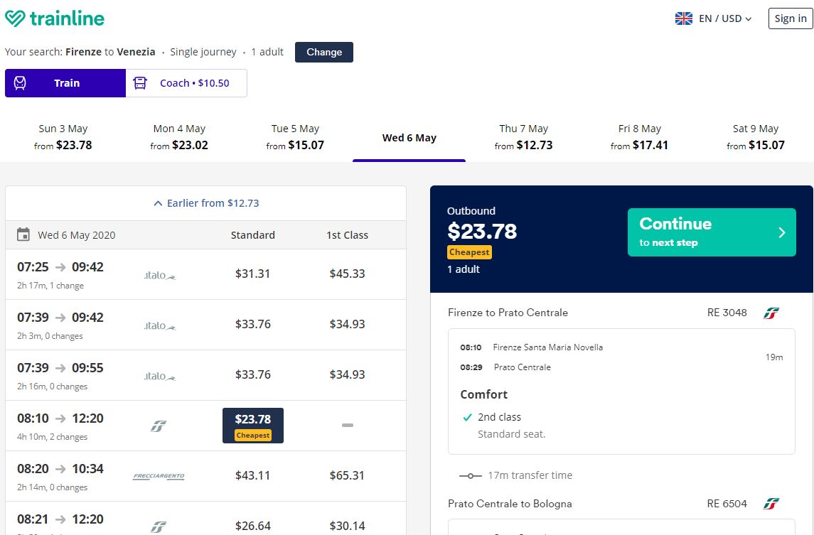 유럽내 여러나라를 여행할 경우 도시간 이동시 유레일패스(https://www.eurail.com/en)가 유용하다. 하지만 우리처럼 이태리 한나라만 이동할 경우 이동구간이 많지 않다. 로마에서 토스카나를 거쳐 피렌체까지는 렌터카가 싸고 편리하다. 이후 피렌체-베네치아와 베네치아-비엔나 구간은 편도로 이용하기 위해 열차예약을 하여야한다. 유레일패스 홈페이지를 이용하여 예약하는 방법도 있지만, 나는 트레인라인(https://www.thetrainline.com/) 과 독일열차홈페이지인 DBBahn을 ( https://reiseauskunft.bahn.de//bin/query.exe/en) 을 활용하여 예약을 진행하였다.