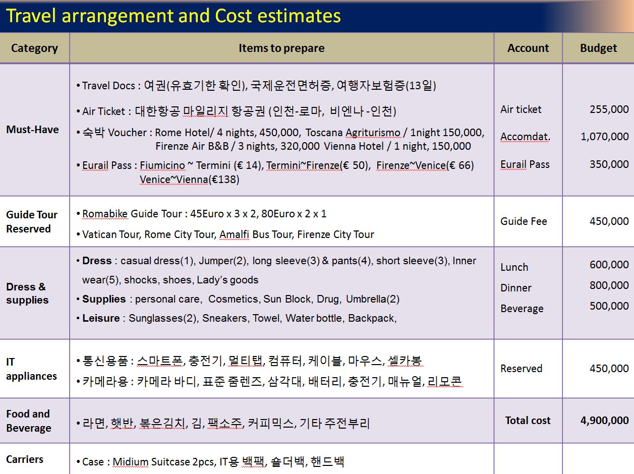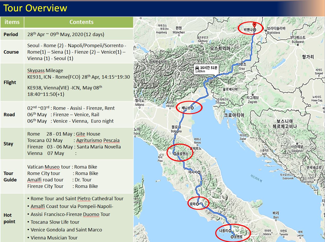 로마에서 4일간 머물면서 이태리 남부지역에서 최근 뜨고 있는 아말피가도를 당일치기로 다녀올 계획으로 포함하였다. 이어서 로마에서 차량을 렌트하여 프란체스코신부로 유명한 아시시를 방문하고 토스카나 농가호텔에서 느긋한 아침을 먹어보는 여유를 뒤로하고 르네상스의 고향, 피렌체로 이동 '냉정과 열정' 속으로 들어간다. 피렌체에서 이틀간 여행하고 베네치아에 반나절을 할애한 뒤 오스트리아 비엔나에서 전체 여행을 마무리하기로 하였다.