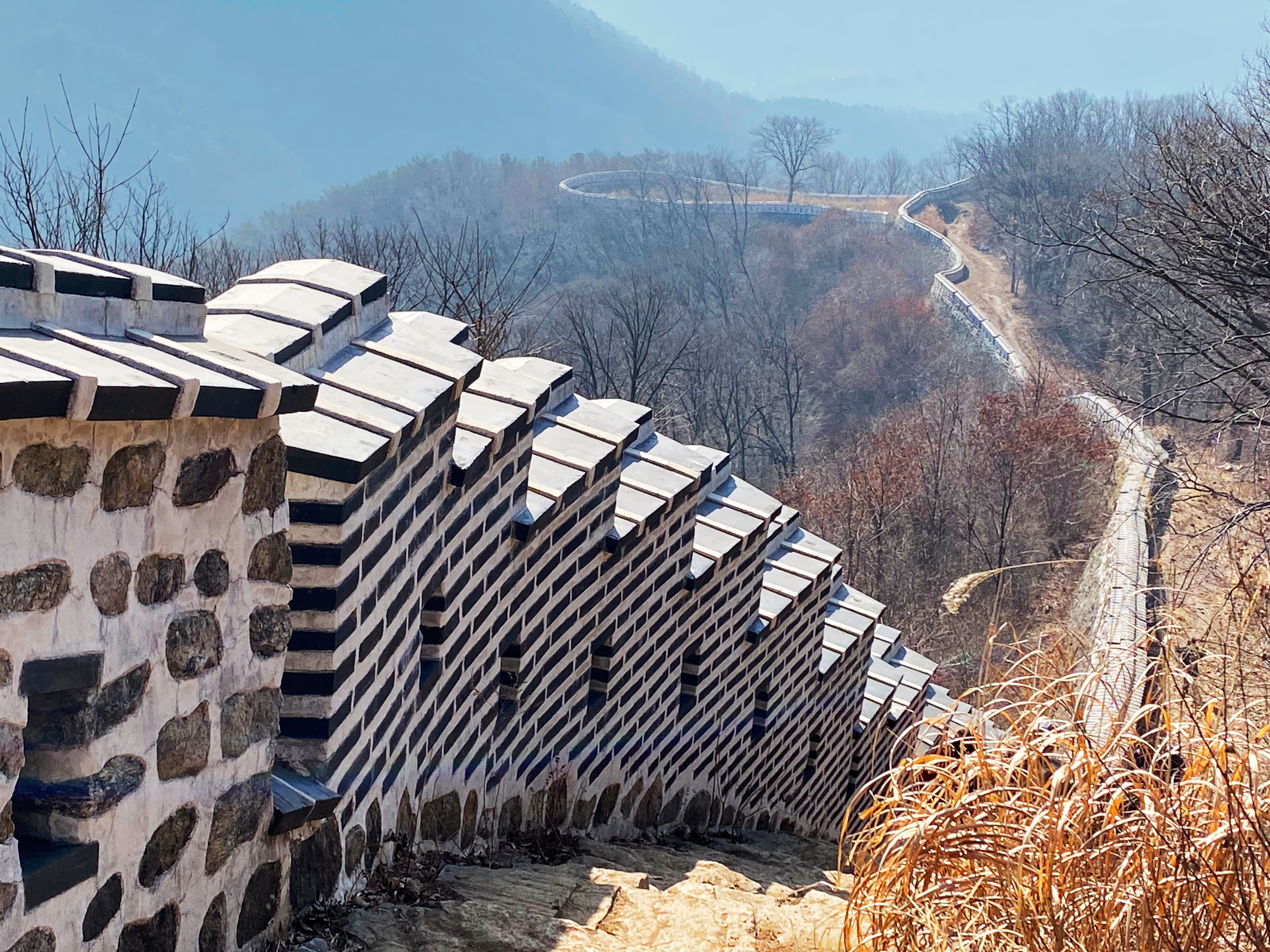 급경사로 치고 올라간 구간에도 성벽의 기초가 뒤틀리지 않았고, 급히 굽이진 구간이 오히려 가벼워 보였다. 성벽은 산의 높낮이를 따라 출렁거렸고, 성을 쌓은 자의 뜻에 따라 굽이쳤다. 성벽이 지형을 이끌고 나가면서 땅과 더불어 노는 형국이었다. 기울거나 주저앉거나 돌의 이빨이 빠진 자리가 없었다. 평탄한 구간에서는 바깥쪽으로 옹성을 길게 내밀어, 밖을 드러내면서 안을 감추었다. 성벽을 갑자기 휘돌려서 안에서 밖을 쏘는 사각을 넓게 했고, 이쪽 성첩에서 저쪽 성벽을 기어오르는 적을 쏠 수 있게 하였다. 여장의 기와 덮개도 모두 온전했고, 총안마다 구멍이 살아있었다.