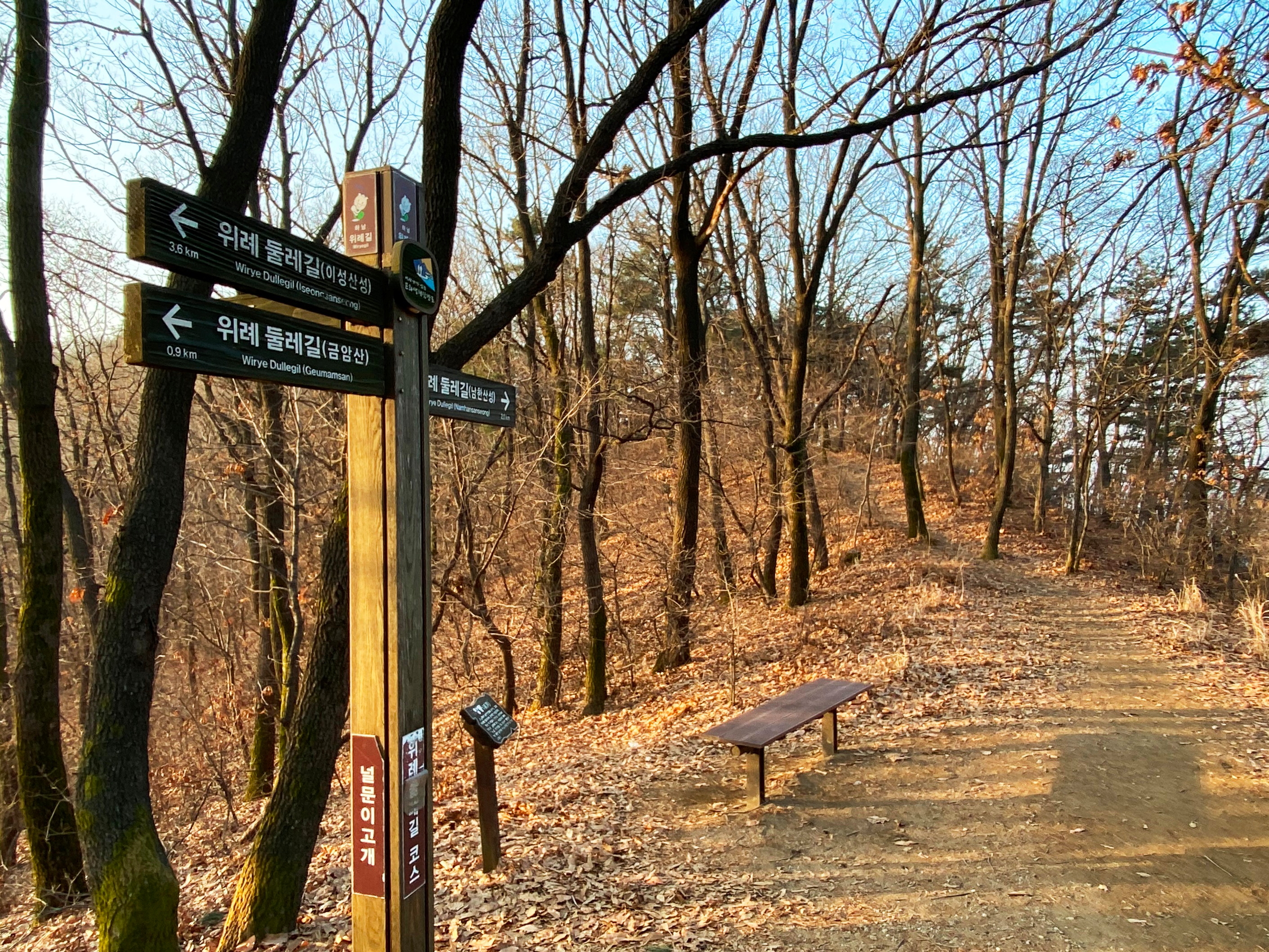 북문과 서문 산자락 아래 새로 들어서고 있는 신도시 아파트 단지를 산행 들머리삼아 출발한 발걸음 가볍다. 연주옹성에서부터 금암산까지 흘러내리는 능선 중간지점에 갈림길 표지가 서있고 옆에 산객이 숨을 고르며 쉬어가라고 의자가 마련되어 있다. 겨울 끝자락마져 꼬리를 감추었는지 추위는 물러간 자리에 햇살이 봄을 재촉한다. 하지만 임금이 남한산성으로 들어왔을 때는 겨울 한복판이었나보다. 소설 속에서 김훈은 겨울을 이렇게 말한다.