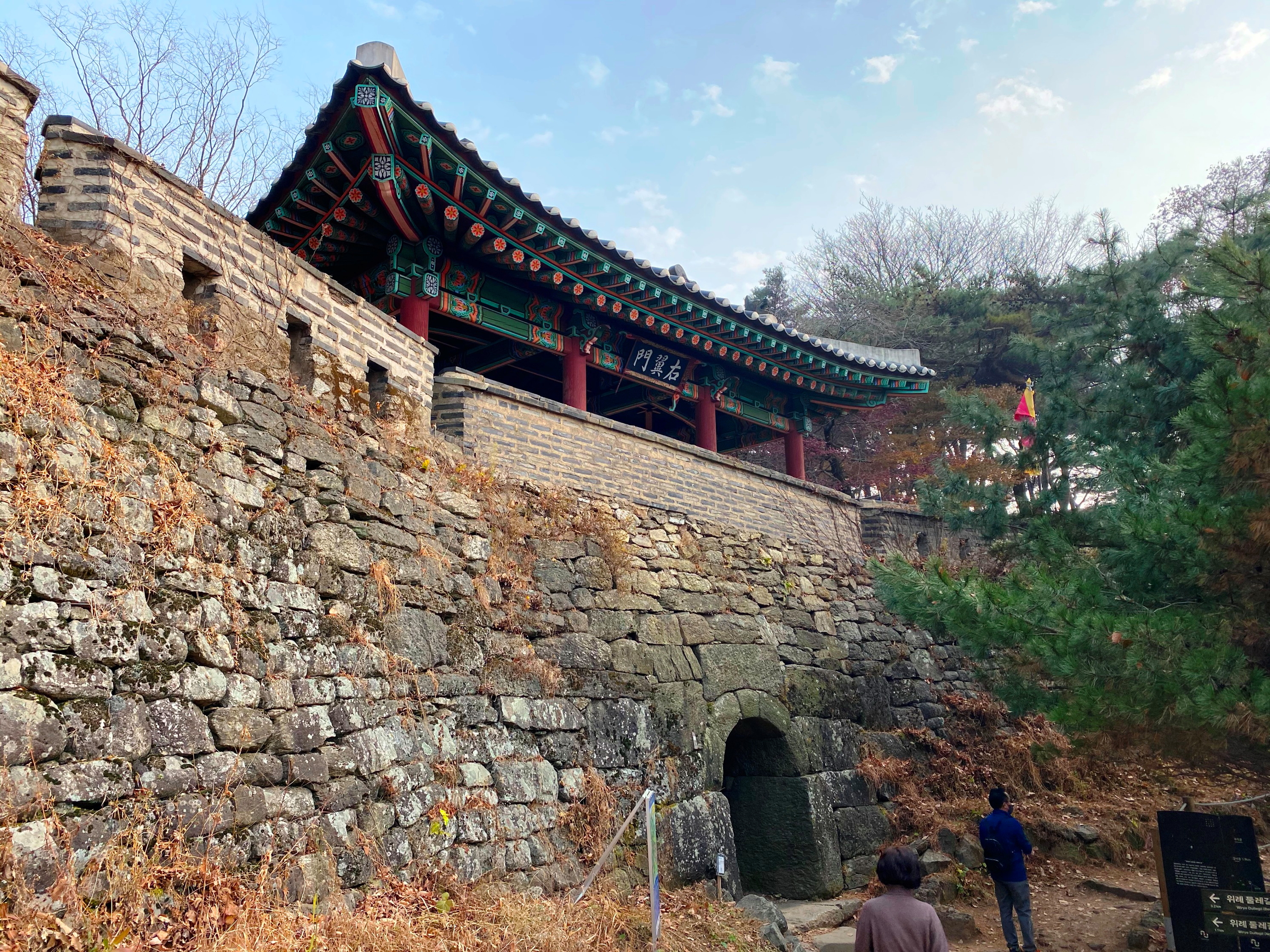 낮은 자세로 앉아있는 연주성 따라 언덕을 넘어서면 서문(우익문)과 북문(전승문)으로 각각 진행방향이 나뉜다. 남한산성에는 5개 옹성을 거느리고 있다. 옹성은 통상 성문을 보호하기 위해 성문 밖으로 한 겹의 성벽을 더 둘러쌓은 이중의 성벽을 말한다.