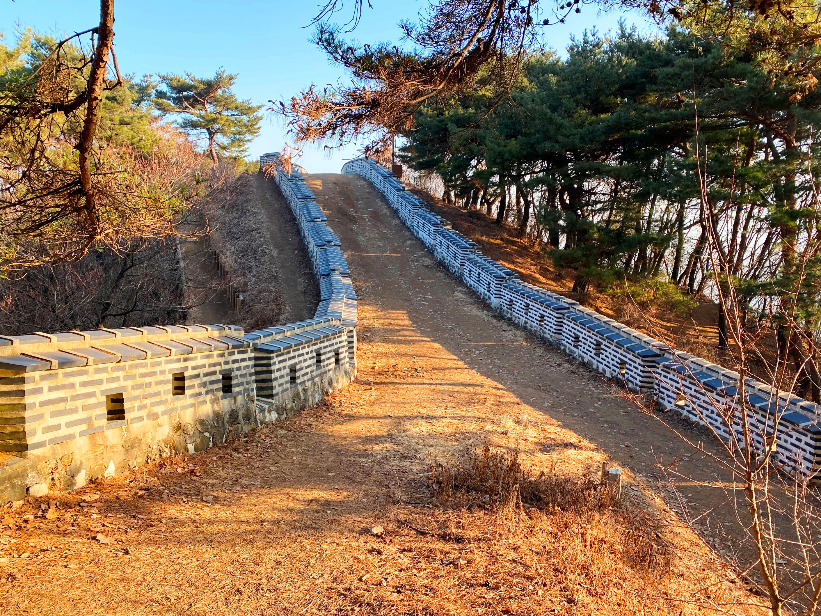 동문을 지나 남문으로 가는 길이 다시 가팔라진다. 동문에서 남문까지는 거의 직선에 이르는 성첩이 단단히 세워져 있다. 옹성도 세 개나 설치되어 있다. 동장대 부터 급하게 내려오던 길을 되짚어 보니 오히려 느리고 길게 에둘러 보인다. 봄 햇살이 따갑게 느껴질 정도로 강하게 내리쬐는 음력 초이틀날,