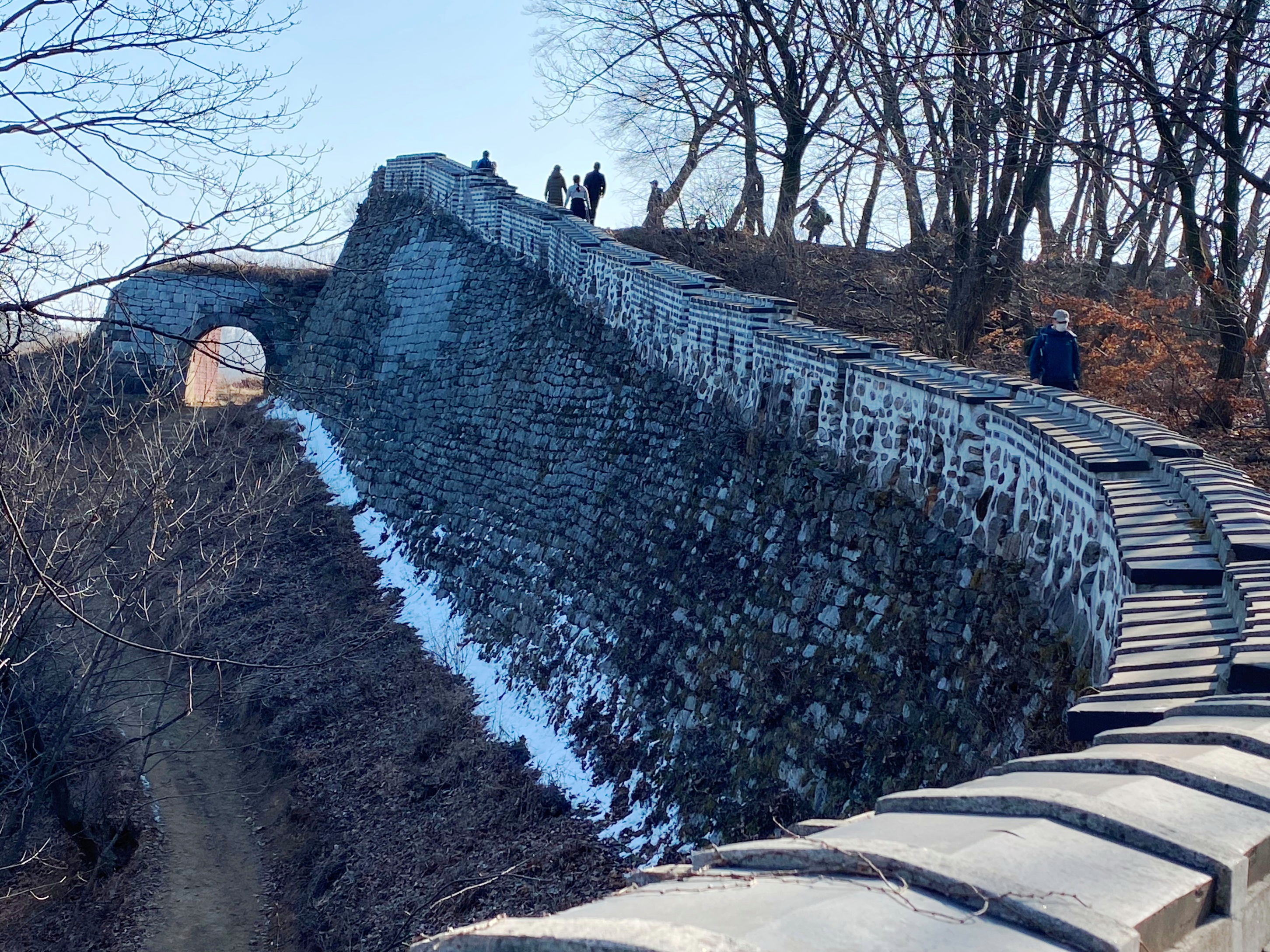 북문방향으로 길을 잡는다. 연주옹성에서 북문으로 가려면 성 밖으로 나있는 길을 따라 내려가야 한다. 봄햇살을 받아 얼어있던 땅이 부풀어 오르면서 질척이기도 한다. 내가 걷고 있는 성첩을 멀리서 바라보던 청장 용골대와 역관 정명수에게 남한산성은 이렇게 보였다.