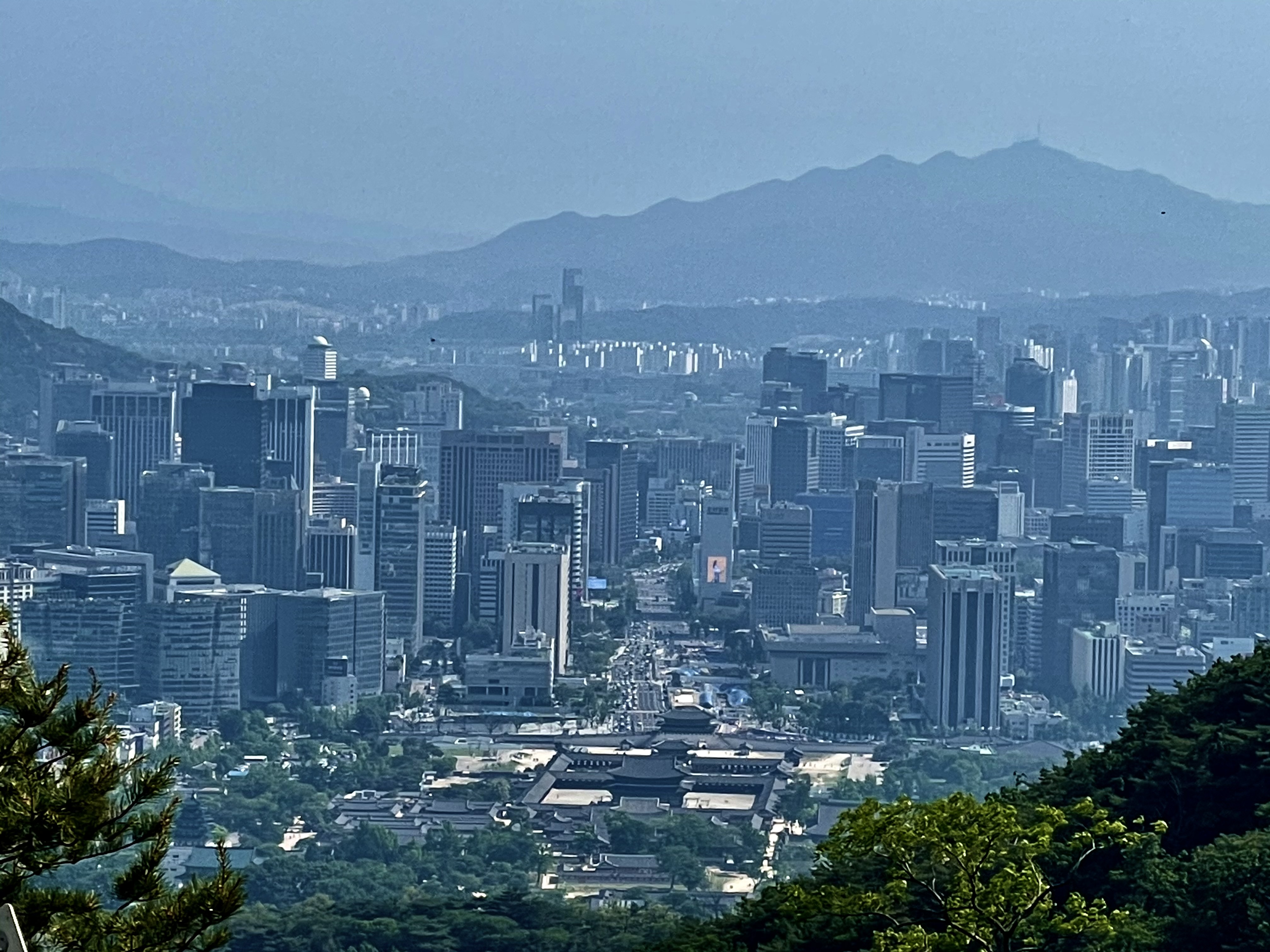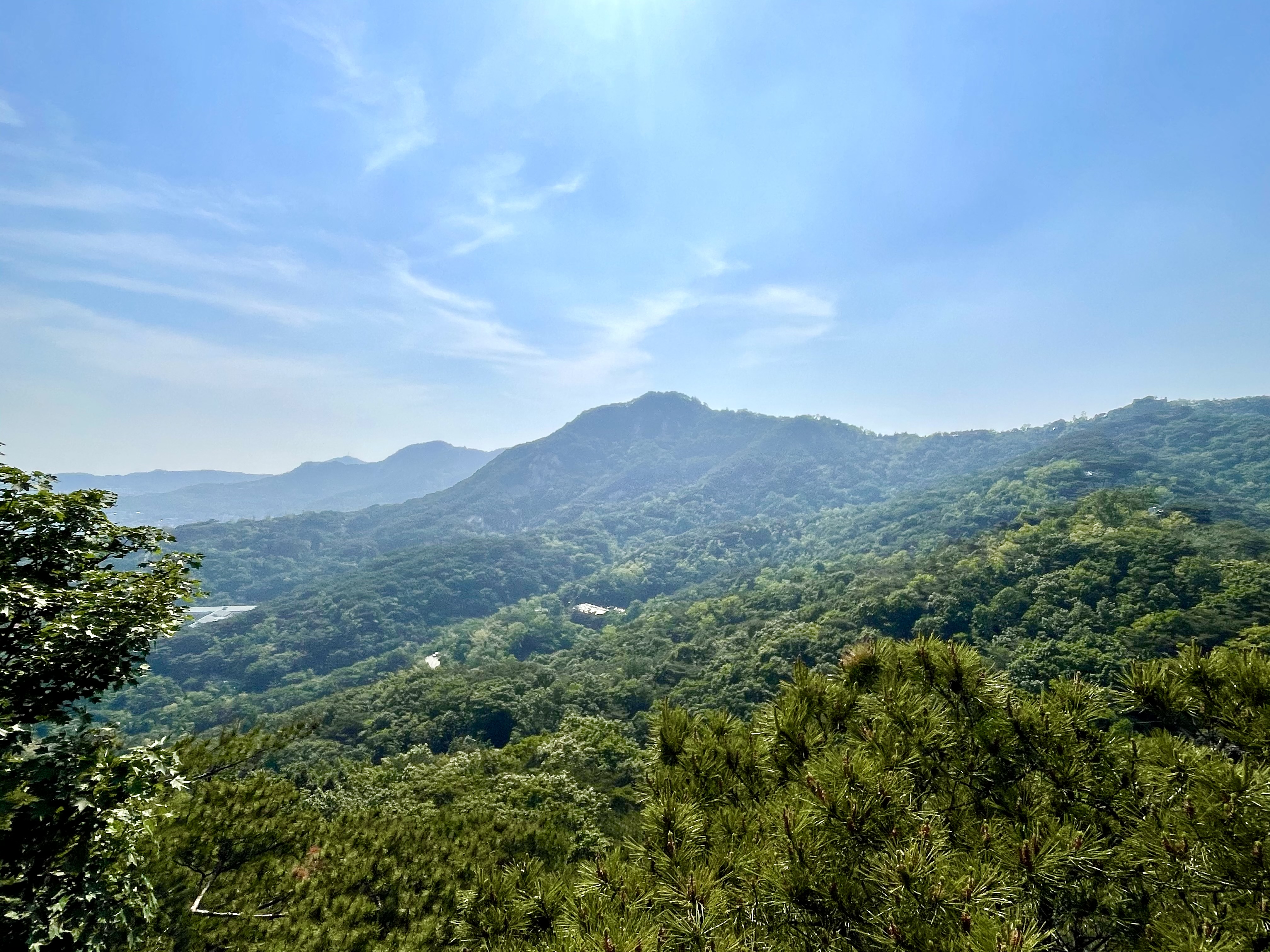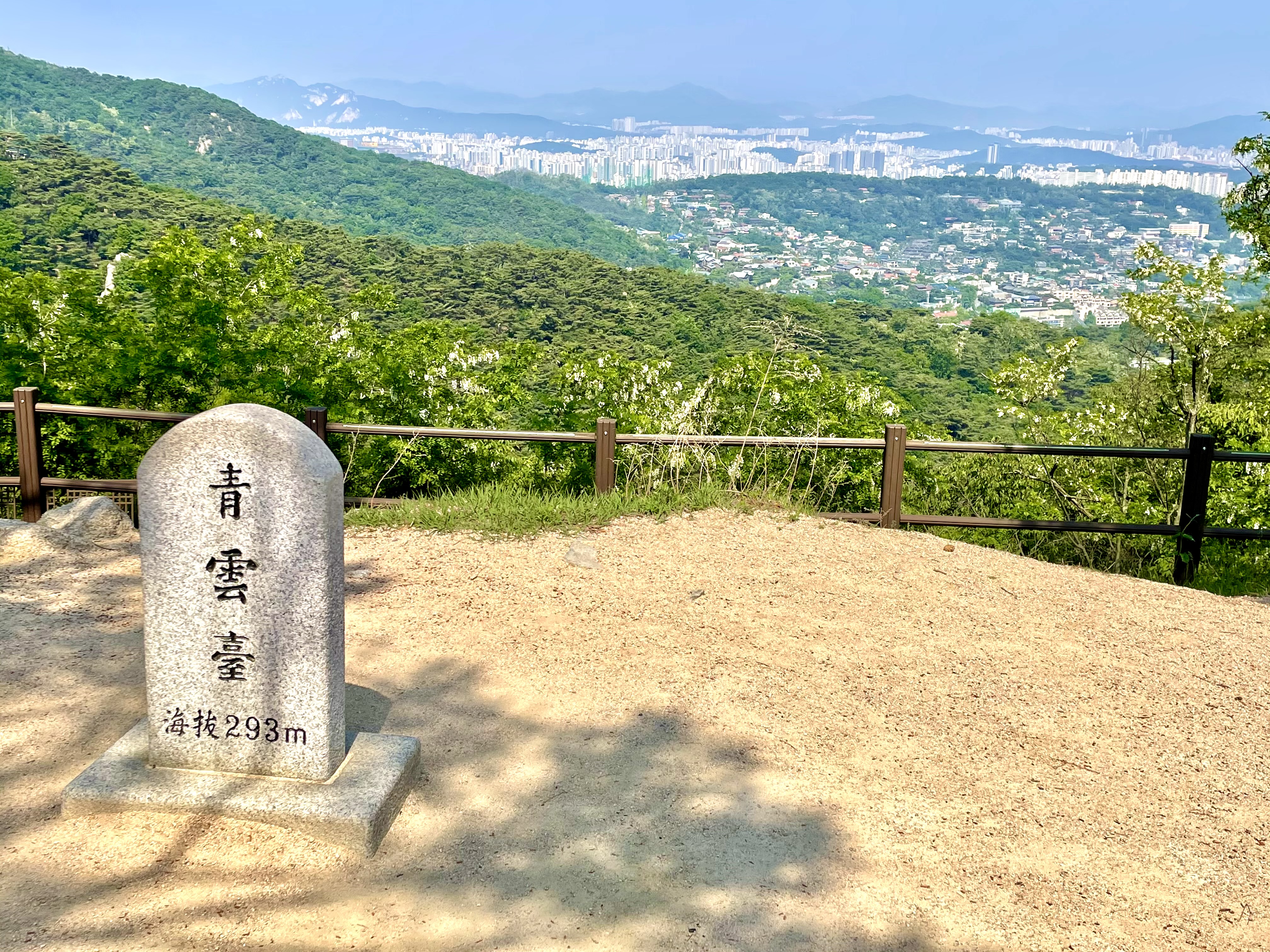 1.21소나무를 지나 평평한 오솔길을 잠시 걷다보면 너럭바위로 된 널직한 공터가 나오고 한쪽에 청운대 표지석이 서있다. 청운대에서 음료수로 목을 축이고 도심으로 눈을 돌려본다. 발아래 경복궁이 굽어보이고 멀리 남산 위에 우뚝하니 서있는 남산타워가 마주서 있다.