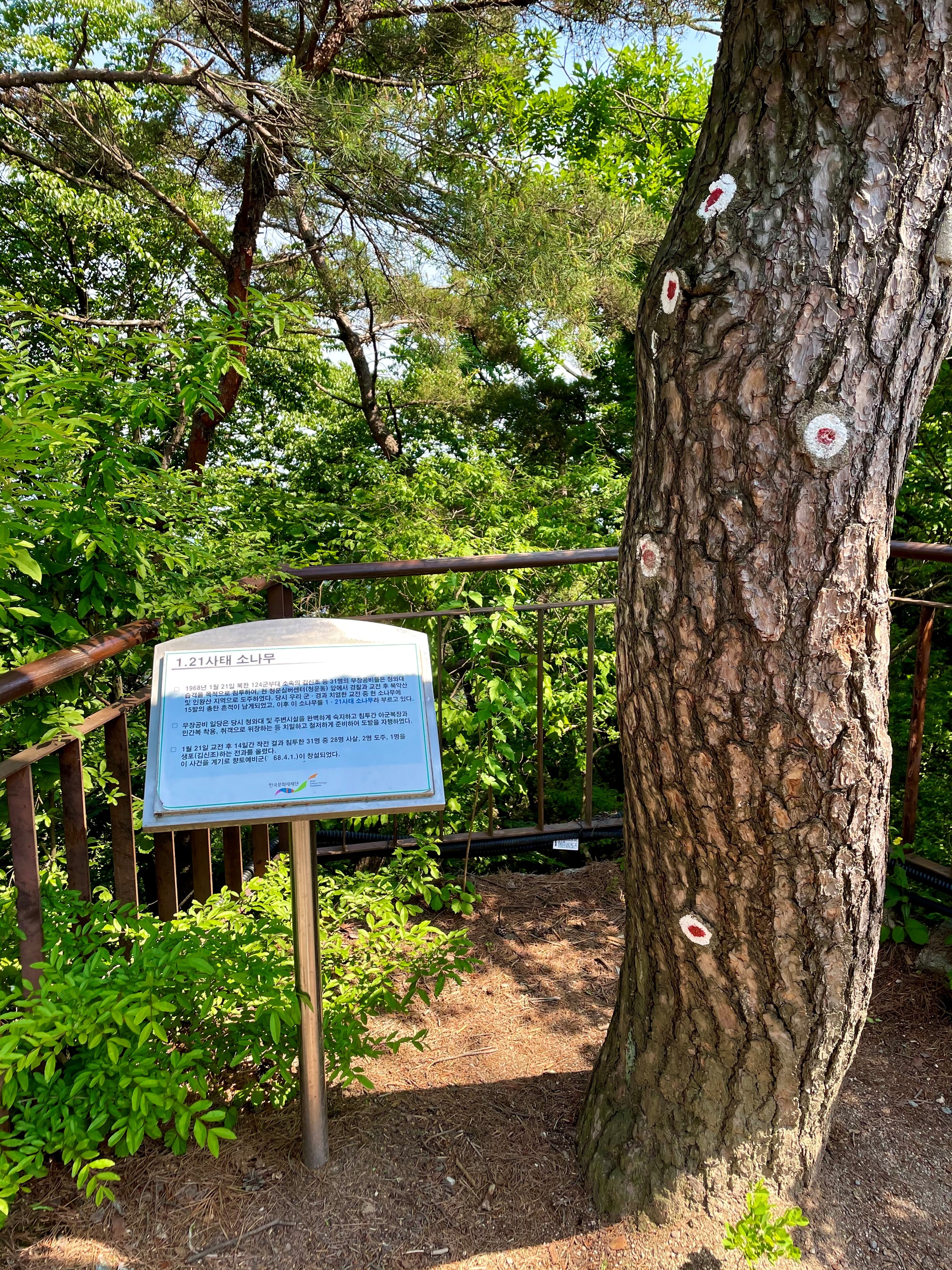 백악마루를 내려와 오솔길을 걷다보면 온 몸에 총탄을 맞고도 굳건히 서있는 소나무를 만나게 된다. 북한의 124특무대가 '청와대를 깨려고' 내려왔다가 총격전을 벌인 곳이라는 걸 온 몸으로 변증하듯 소나무는 굳건히 서있고, 총탄이 박혀있는 곳을 표식으로 보여준다. 총알을 하나도 아니고 십수발을 맞았는데도 당당히 서있는 모습이 오늘의 대한민국을 보는 것처럼 위세가 등등하다.