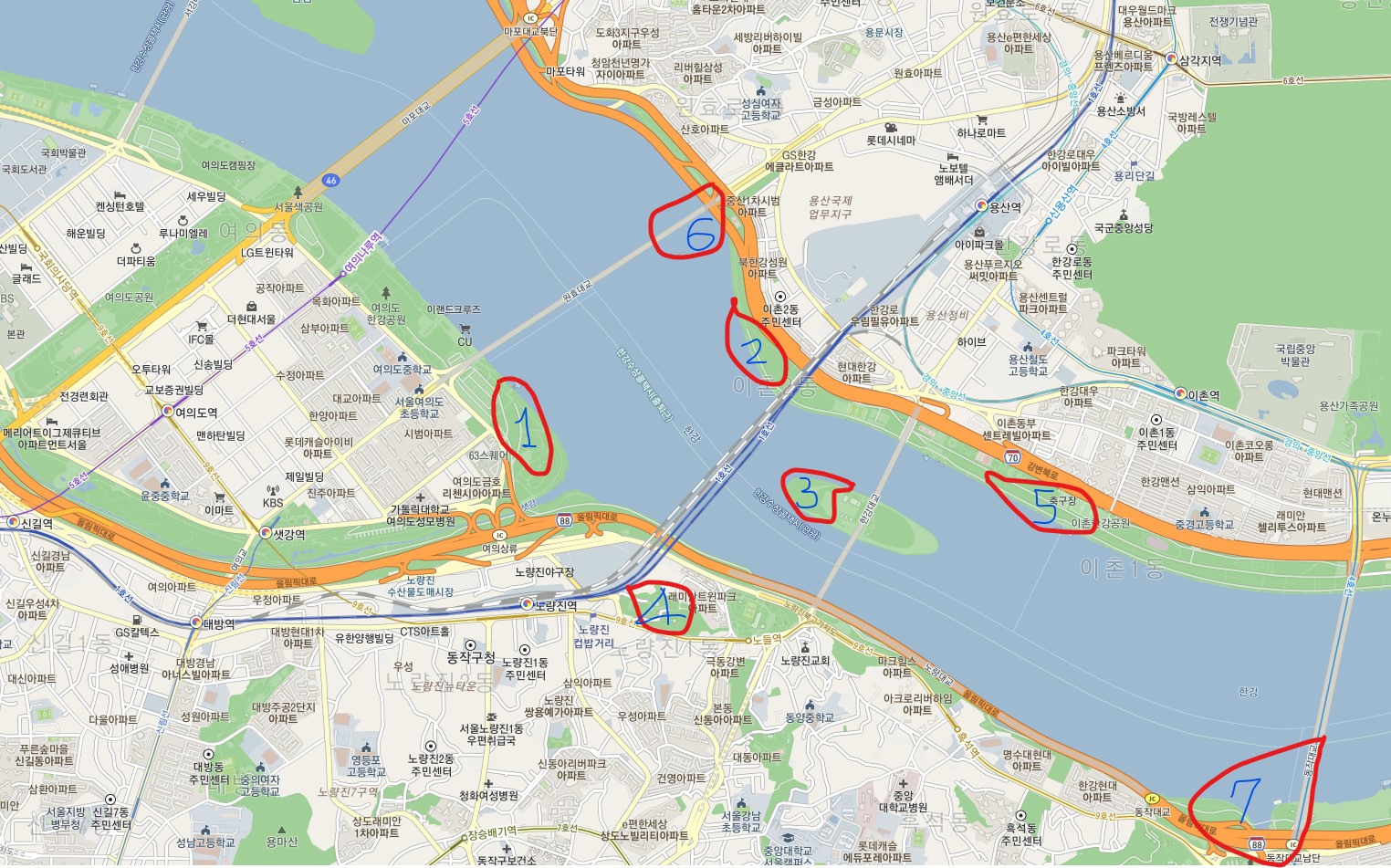 이외에도 노량진수산시장이나 학원가 옥상도 추천할 수 있으나 출입에 제한이 있어 이를 극복할 수 있으면 도전해볼만한 장소다. 동작대교를 건너 동부이촌동앞 한강공원을 지나갈 즈음 시계를 보니 오후 세시를 지나고 있다. 산책로 위에 돋자리를 펼치고 불꽃을 기다리는 인파로 걸어가는 게 더디어진다.