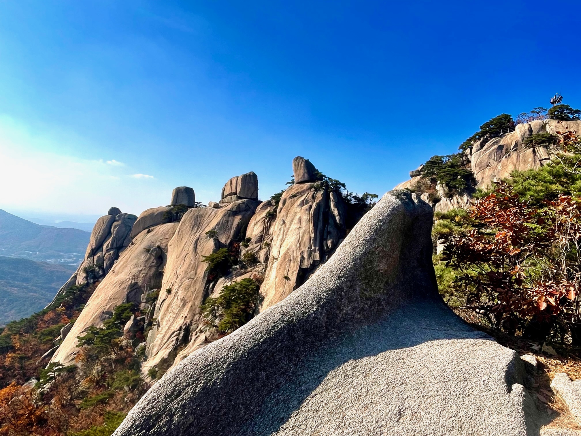 여성봉 정상에 오르면 오봉이 손에 잡힐 듯이 가까이에 서있다. 다섯 개 바위로 된 봉우리가 연이어 서있다. 마치 암반 위에 커다란 암석을 탑을 쌓아올리듯이 서있다. 오래 전에 여길 왔을 때는 암벽등반을 즐기는 매니아가 봉우리와 봉우리 사이에 줄을 매고 건너는 모습을 본 적이 있는데 오늘은 그와 같이 도전하는 분들이 보이질 않아 아쉽다.