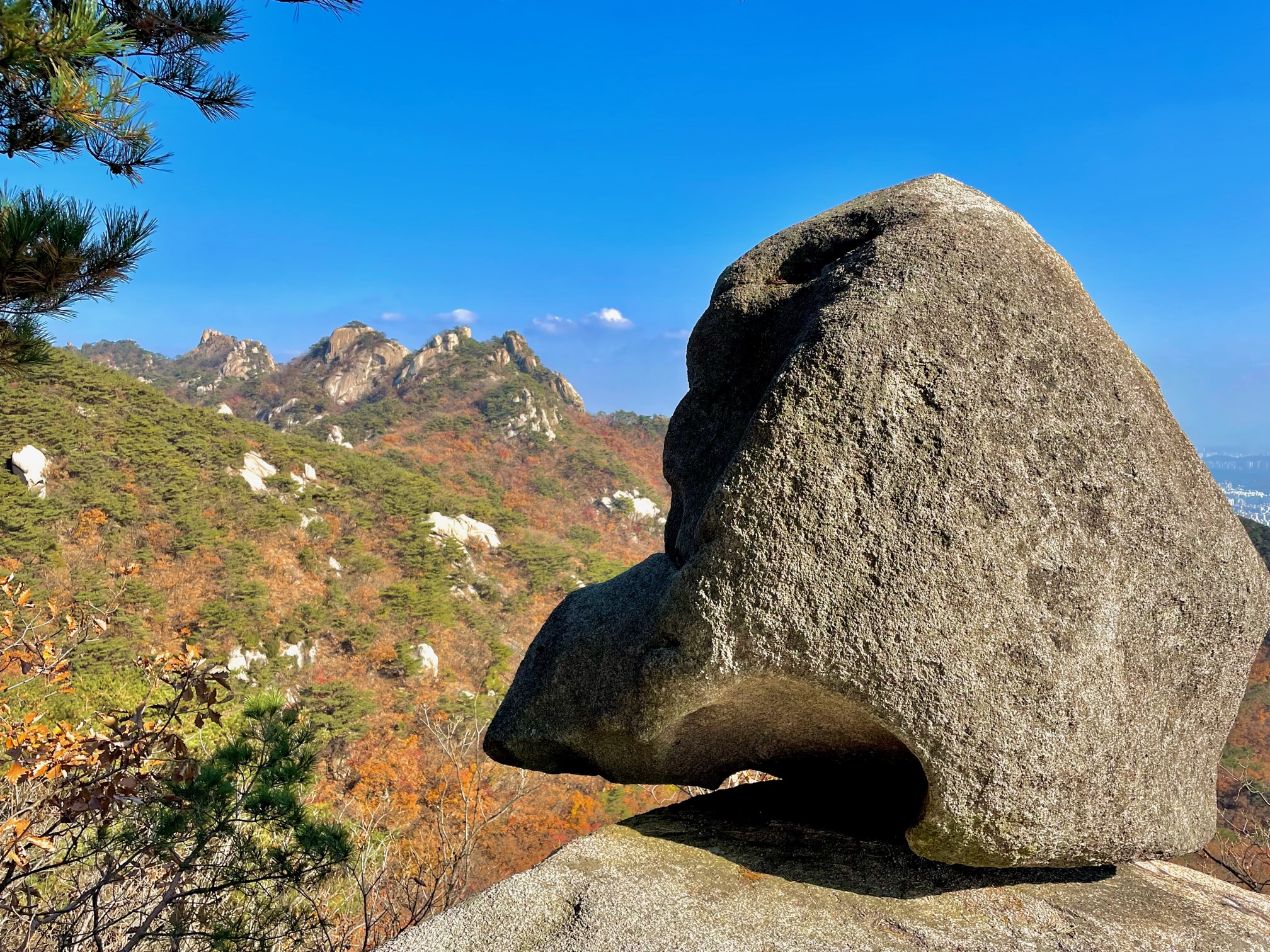 오봉삼거리에서 살짝 내려오니 혼자 산행을 즐기는 분이 폰카로 사진을 찍고 있다. 우리도 주변을 둘러보며 그 분이 찍는 방향으로 시선을 잡아보았다. 커다란 바위가 덩그렇게 앉아있고 그 뒤로 도봉산 정상 봉우리군이 보인다. 사실 자운봉으로 가는 길도 그다지 오르내림이 심하지 않아 보여 다시 오봉삼거리로 올라가 자운봉 방향으로 갈까 망설였다.