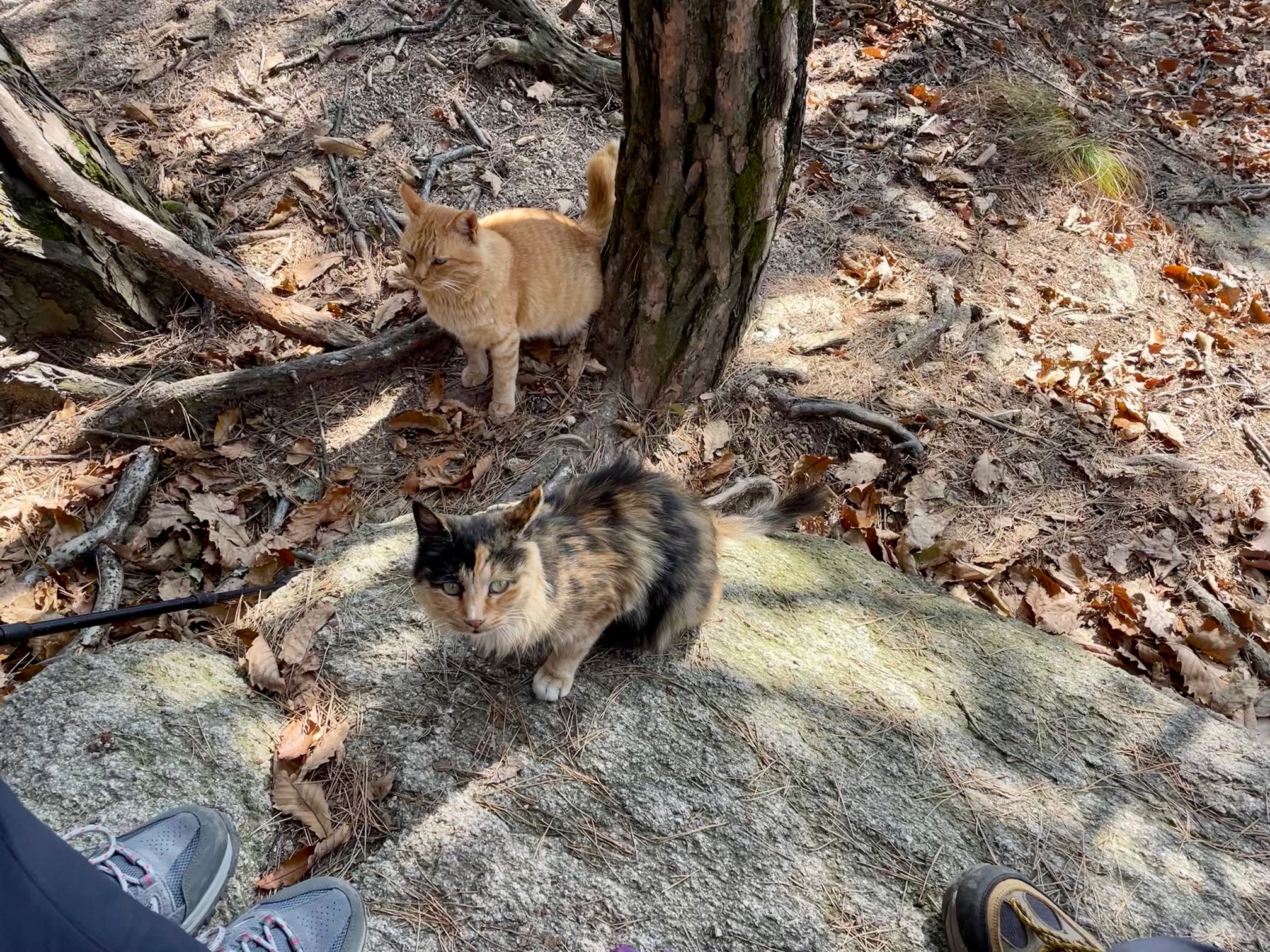 여성봉 앞에 마련된 데크에 앉아 가져와 귤과 사과를 먹으며 땀을 들이고 있는데 고양이들이 다가와 앉아 먹을 것을 달라고 한다. 준비한 것이 과일뿐이어서 녀석들에게 줄게 없다. 이럴줄 알았으면 육포라도 가져올껄 그랬나보다. 사실 육포는 우리집에서 환영받지 못하는 주전부리다. 이를 손상할 수도 있어서 금기 품목이다. 녀석들은 우리가 줄 게 없는 걸 알면서도 갈 생각을 하지 않는다. 몸피를 보니 굶은 것 같지는 않은데.. 오히려 어제 저녁과 아침을 부실하게 먹은 내가 더 고프건만...