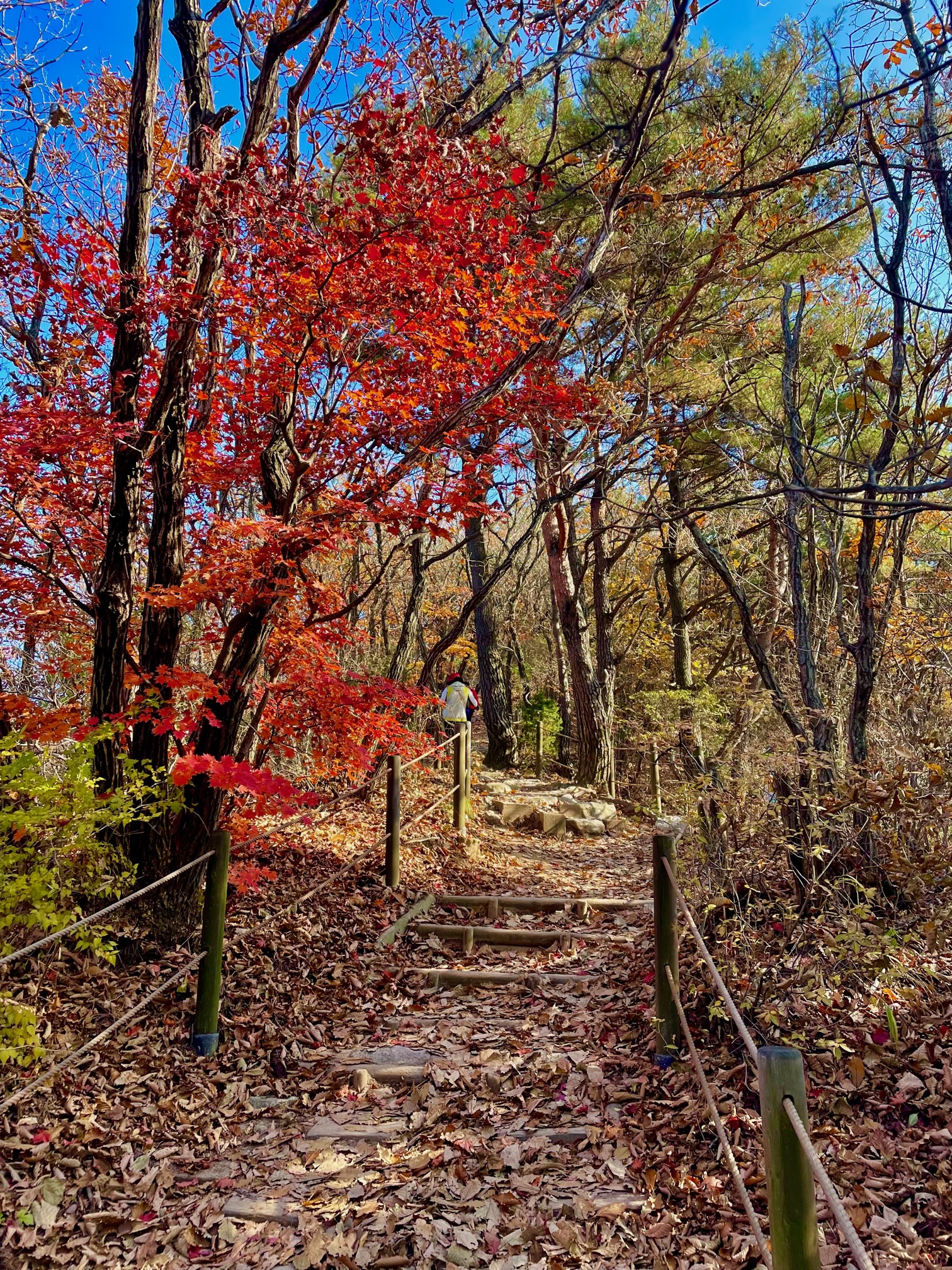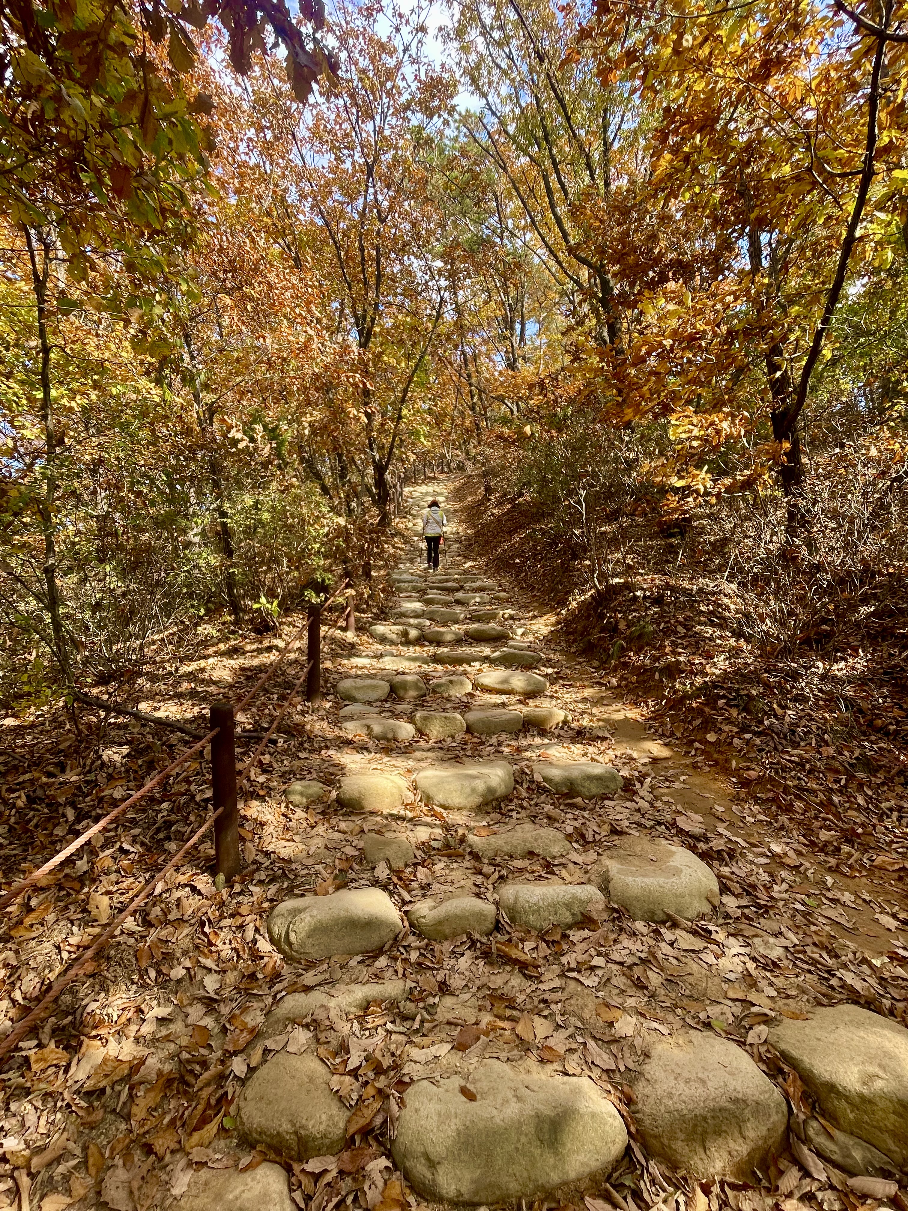 대부분의 등산복 차림들이 북한산성입구에서 내리니 버스에는 몇분의 등산객밖에 없고 그나마도 밤골정류장에서 내린다. 밤골은 북한산에서 가장 멋진 숨은벽능선길로 이어지는 산행코스 출발점이다. 우리는 송추유원지에서 내려 오봉탐방지원센터로 10분가량 걸어 당도하였다. 스틱을 꺼내 길이를 잡고 산행들머리로 들어선다. 등산로에는 여름내 푸르던 잎들이 가을색으로 탈색되어 길을 덮고 있다. 단풍도 절정이 꺾여 막다름으로 가고 있다. 평평한 오솔길이 조금씩 고도를 높여가더니 한양도성 성돌로 쓰기에 알맞은 크기로 맞춘 돌층계가 이어진다.