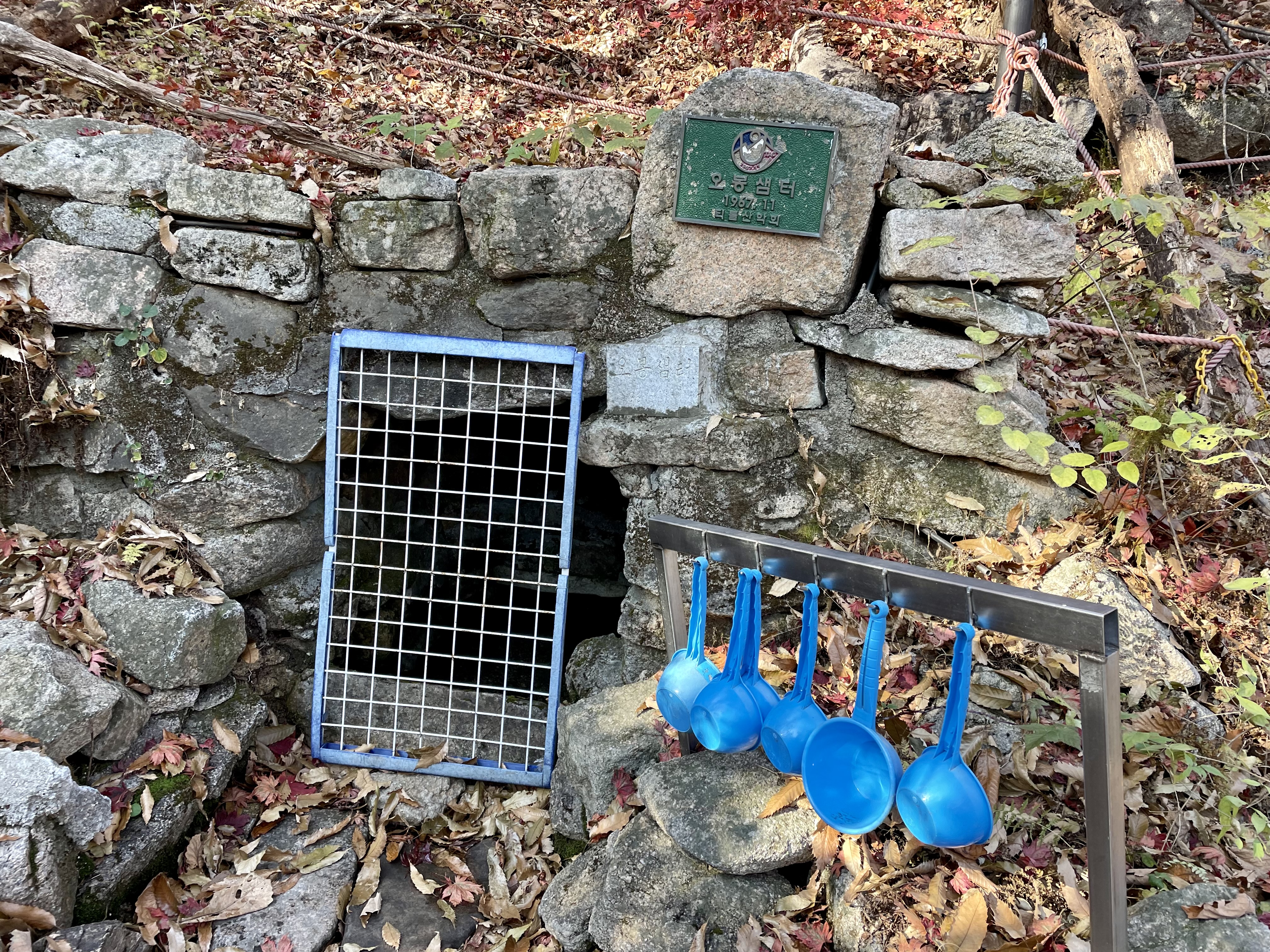 하산길을 재촉하여 허기진 배를 채울 요량으로 계곡으로 이어진 길을 내려가는데 샘터가 나온다. '오봉샘터' 라는 표지까지 있고 샘터 안을 들여다보니 약간의 물도 고여있다. 옆에는 플라스틱이나마 표주박도 준비되어있는데 철망으로 막아놓았다. 수질검사에서 음용할 수 없다는 판정을 받았나보다. 주변에 오염원이 없을 것으로 보이는 산속의 옹달샘마져 먹을 수 없을 정도로 오염이 되어서일까? 하는 안타까운 마음이 든다.