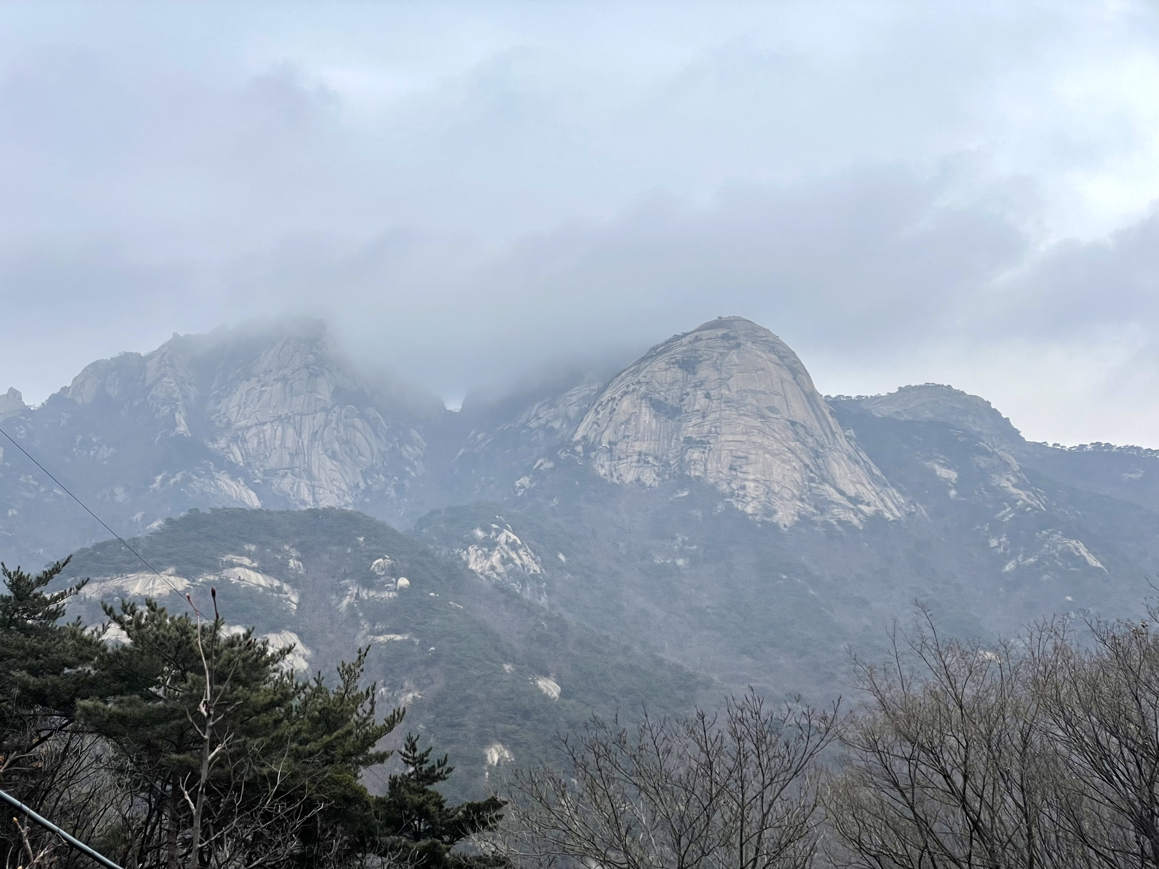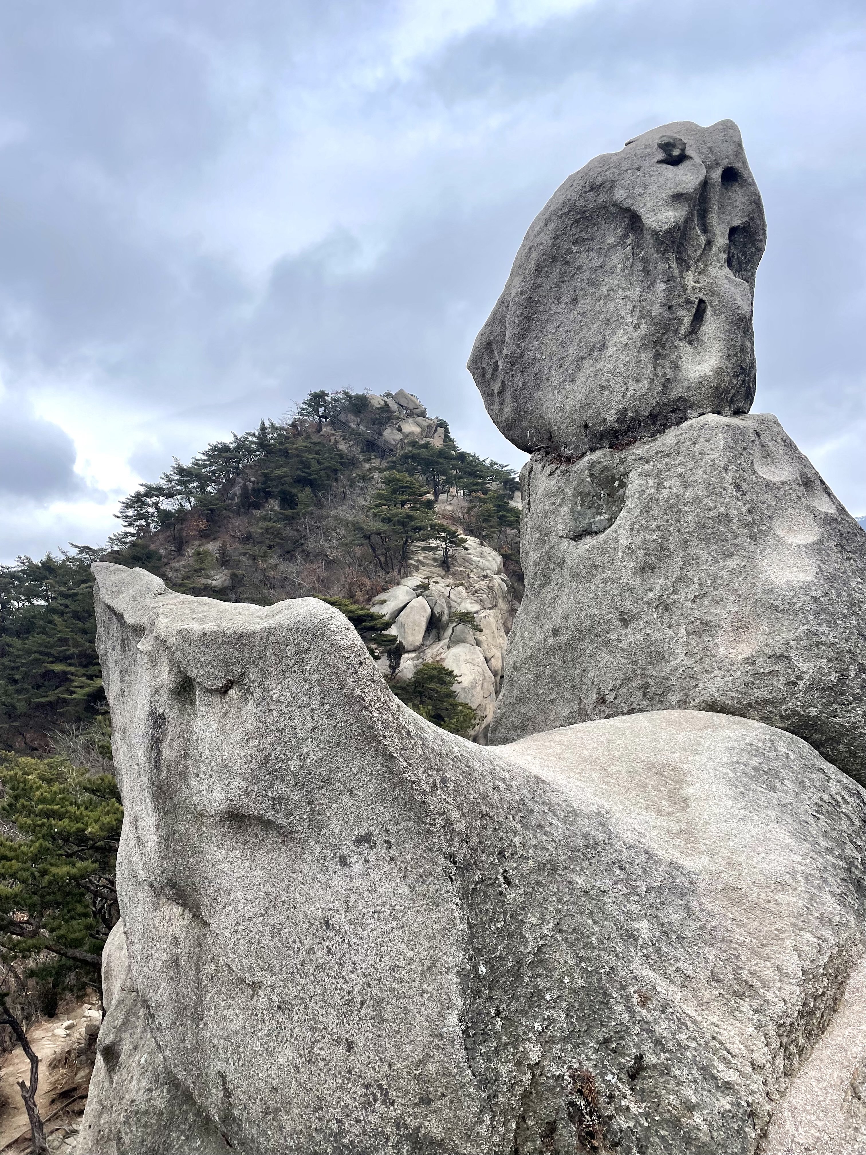 용혈봉에 올라 잠시 뒤를 돌아본다. 의상봉과 용출봉이 마치 이등변삼각형 두개를 세워놓은 것처럼 날카롭게 서있다. 그 사이에 가사당암문이 숨어있고 오른쪽에 가사당암문을 수비를 담당하던 승병이 기거하였다는 국녕사 법당 지붕이 살짝 보인다. 특히난 오를 때는 제대로 경사진 모습을 몰랐는데 여기서 보니 망루처럼 솟구쳐오른 용출봉이 예리하다. 봉우리 그자체가 단단한 천연성벽과 망루로서 손색이 없다. 누가 알려주지 않으면 북한산성 줄기라 알수 있을까?