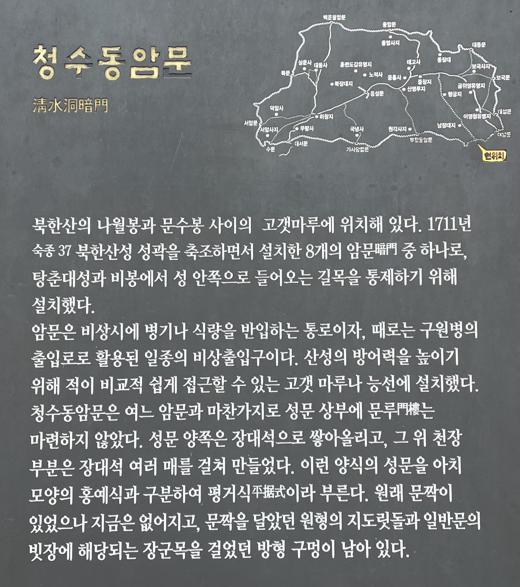 의상능선에 숨은 세 개의 성문 중 마지막 성문에 도착했다. 가사당암문을 출발해 2.2키로가량 되는 거리를 한시간 반만에 도착했다. 청수동암문은 한양도성과 연결되는 문이다. 인왕산구간에서 기차바위를 따라 내려오면 탕춘대성과 이어진다. 상명대학교를 뒤를 두르고 이어지는 탕춘대성은 비봉으로 연결되어 비봉능선 마지막 봉우리 문수봉으로 오른쪽으로 끼고 오르면 바로 청수동암문이다. 주말에 북한산을 오르면 으례 비봉과 사모바위를 거쳐 문수봉 암벽으로 기어오르거나 계곡길로 오르면 청수동암문을 거치게 되어 자주 만나던 성문인데 오늘은 의상봉으로 올라 만나게 되었다. 대남문에서 백운동암문까지 이어지는 길은 거의 평지 수준의 성안길이다. 북한산성 종주의 하이라이트를 지나왔으니 내쳐 마무리 하자.