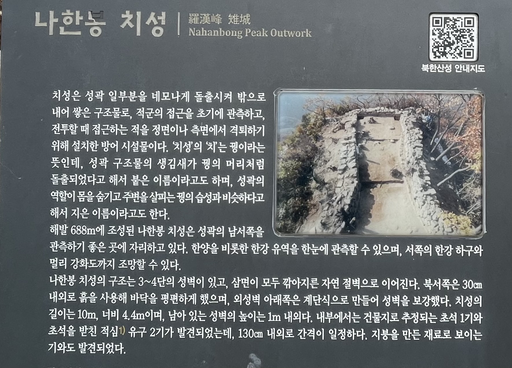 나월봉을 비켜오르면 이내 나한봉에 이른다. 예전에는 나월봉에서 곧바로 남장대로 올라 청수동암문으로 가다보니 그냥 지나치던 봉우리였다. 그때의 기억으로 그냥 지나치려고 하는데 성체가 돌출된 모습 위로 산객들이 제법 보인다. 우회로로 가는 걸 접고 곧바로 나한봉으로 오른다. 나한봉 정상은 치성이 복원되어 있고 안내판이 치성에 대해 설명해준다.