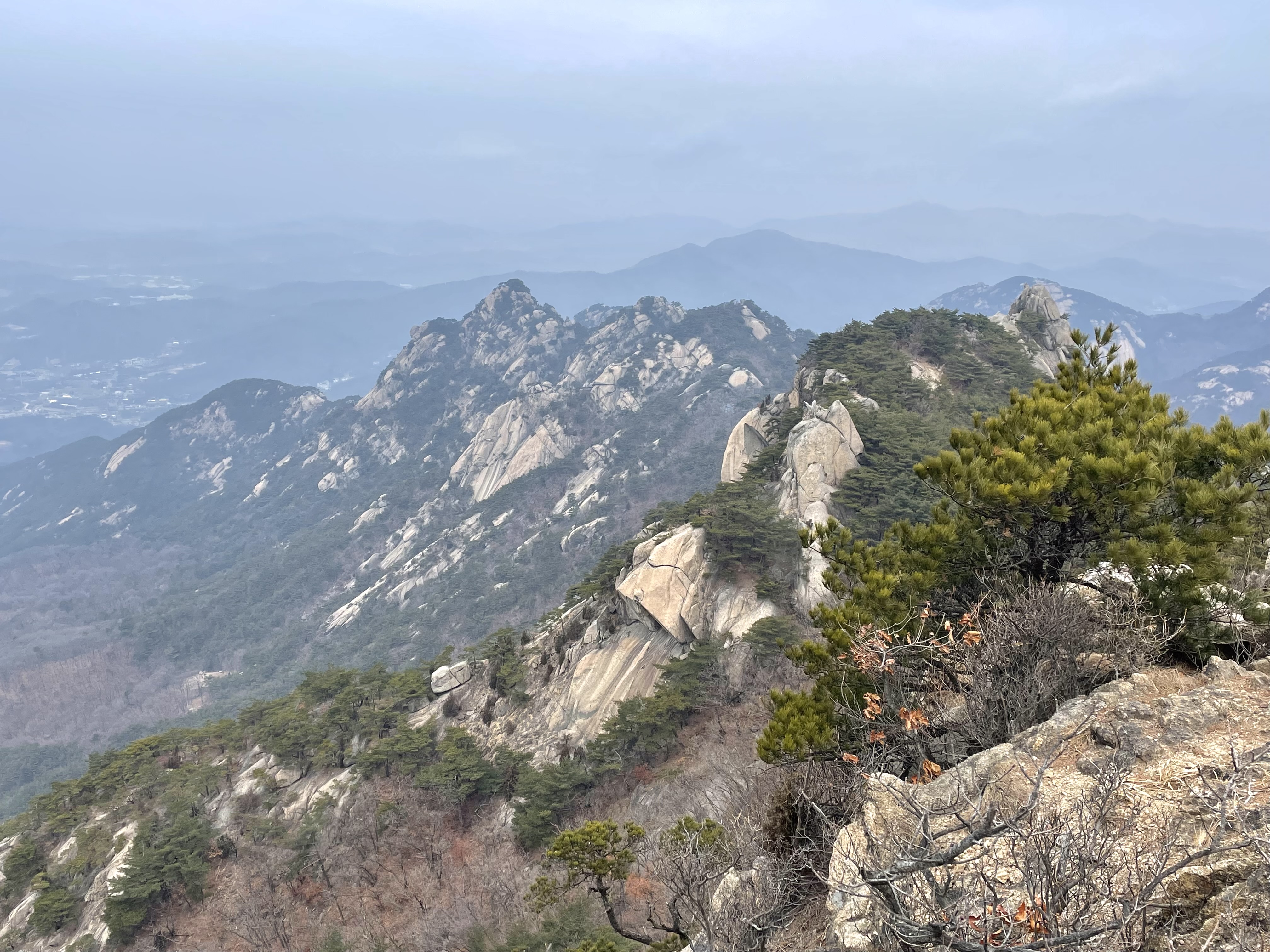 나한봉에서 내려와 마주보이는 남장대까지 짧은 암릉을 오르면 의상능성에 솟아있는 봉우리를 가감없이 조망할 수 있다. 마치 무너지고개에서 바라보는 설악산 공룡능선처럼 누런 이빨을 드러낸 암봉이 연이어 서있다. 능선 끝자락의 의상봉이 예서 보니 오히려 밋밋하게 보인다.