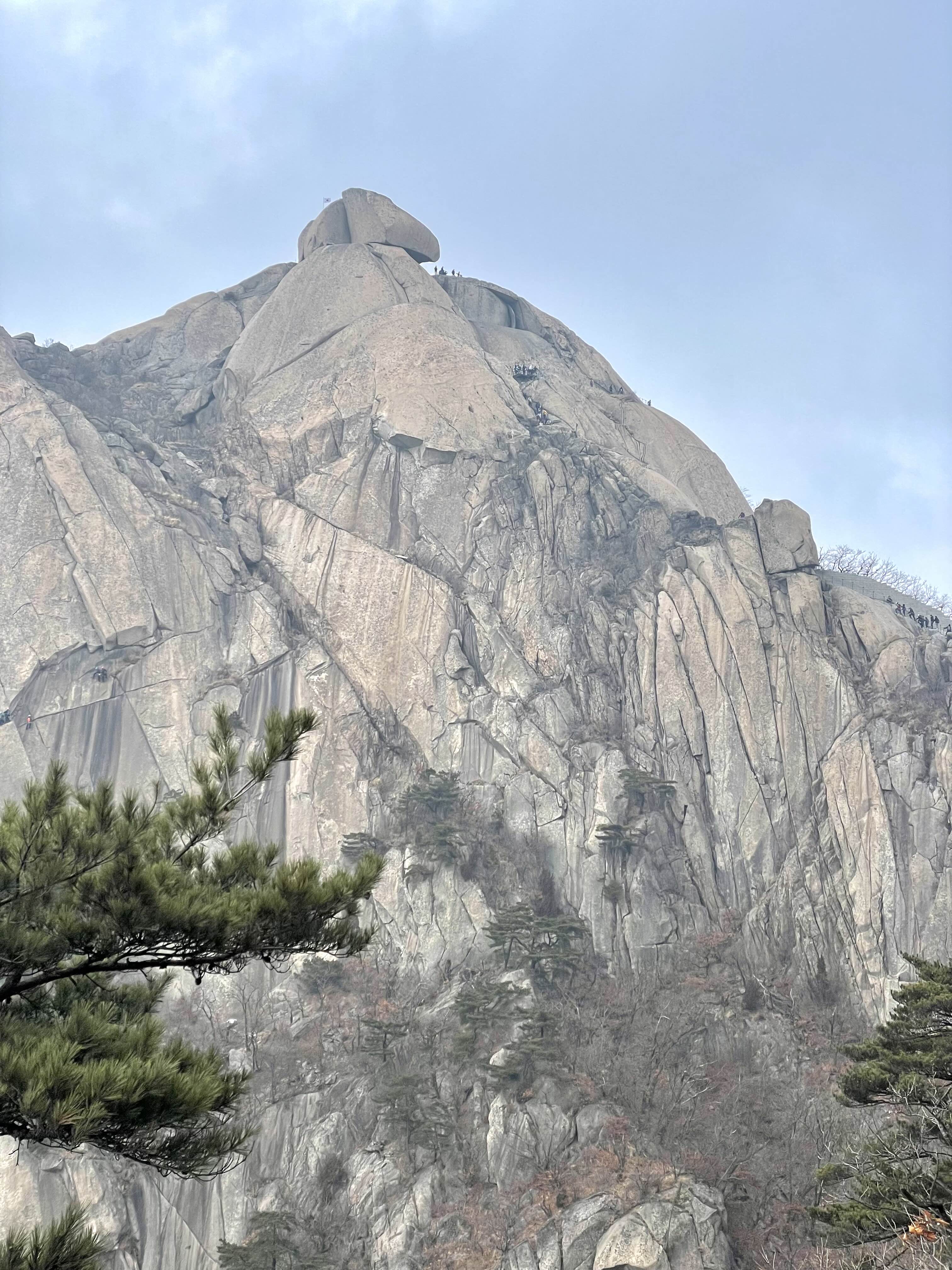 이번엔 북한산 정상이 서있는 백운대로 눈을 돌리니 자못 웅장한 암봉이 거침없이 시야를 꽉 채운다. 정상에는 태극기가 휘날리며 정상인증을 개념해주고 정상을 향해 오르는 산객들이 오른쪽 암벽에 줄지어 있다. 산성종주를 할 때마다 맞딱뜨리는 고민이 다시 고개를 쳐든다. 백운대까지 찍고 내려오면 시간과 체력을 감당할 수 있을까? 백운봉암문에서 백운대 정상을 찍고 내려오려면 적어도 한시간 가량을 투자해야 한다. 시간이 넉넉하더라도 체략이 문제가 된다. 이따금 왼쪽 허벅지에 스멀스멀 쥐가 오르기도 하는 마당에 산성에서 비껴서있는 백운대를 교통체증까지 빚고 있는데 굳이 줄지어 올라야 하나?