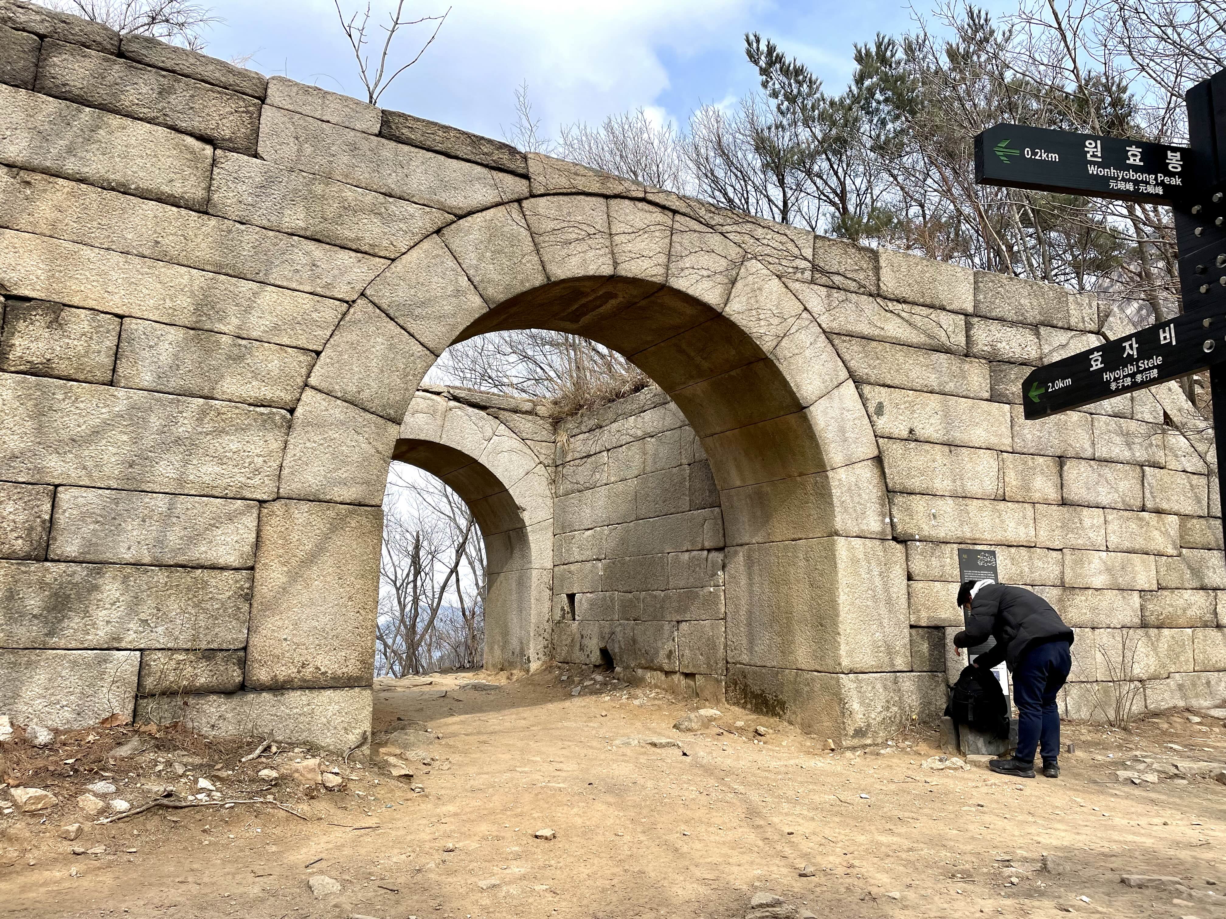 장쾌한 조망에 취한 나머지 오늘은 한번도 풀샷으로 찍은 사진이 없어 산객에게 조심스레 사진 한장을 부탁해 본다. 7개 암문 중에서 마지막 암문을 찍으면 오늘 산성 종주를 완성하기에 발길을 원효봉이 잡아둘 수가 없다.