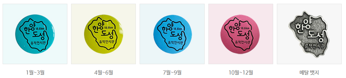 한양도성길 20키로 전구간 완주하면 한양도성박물관에서 완주인증서와 뱃지를 받을 수 있다. 뱃지는 계절별로 색깔을 달리하여 제공하는데, 4계절을 모두 완주하면 메탈로된 뱃지를 준다.