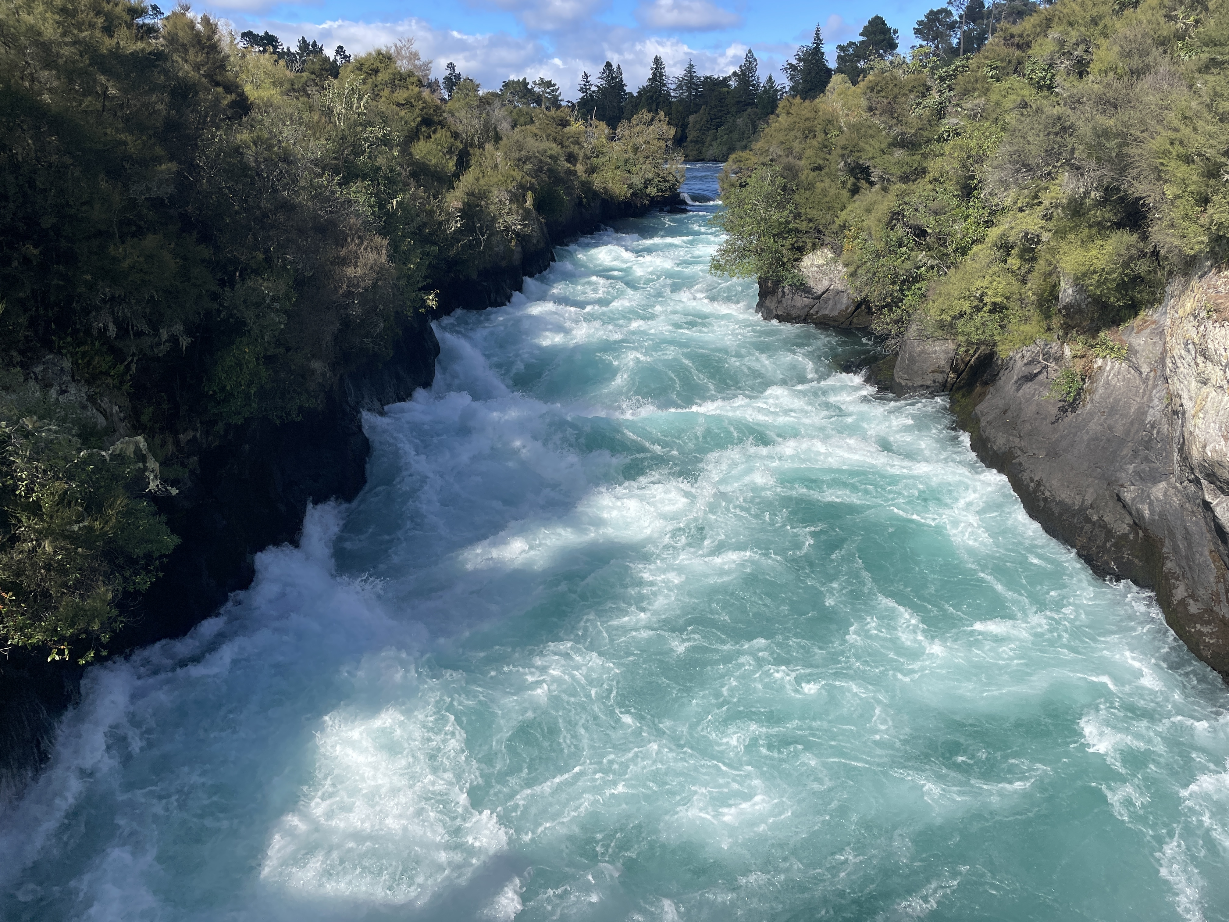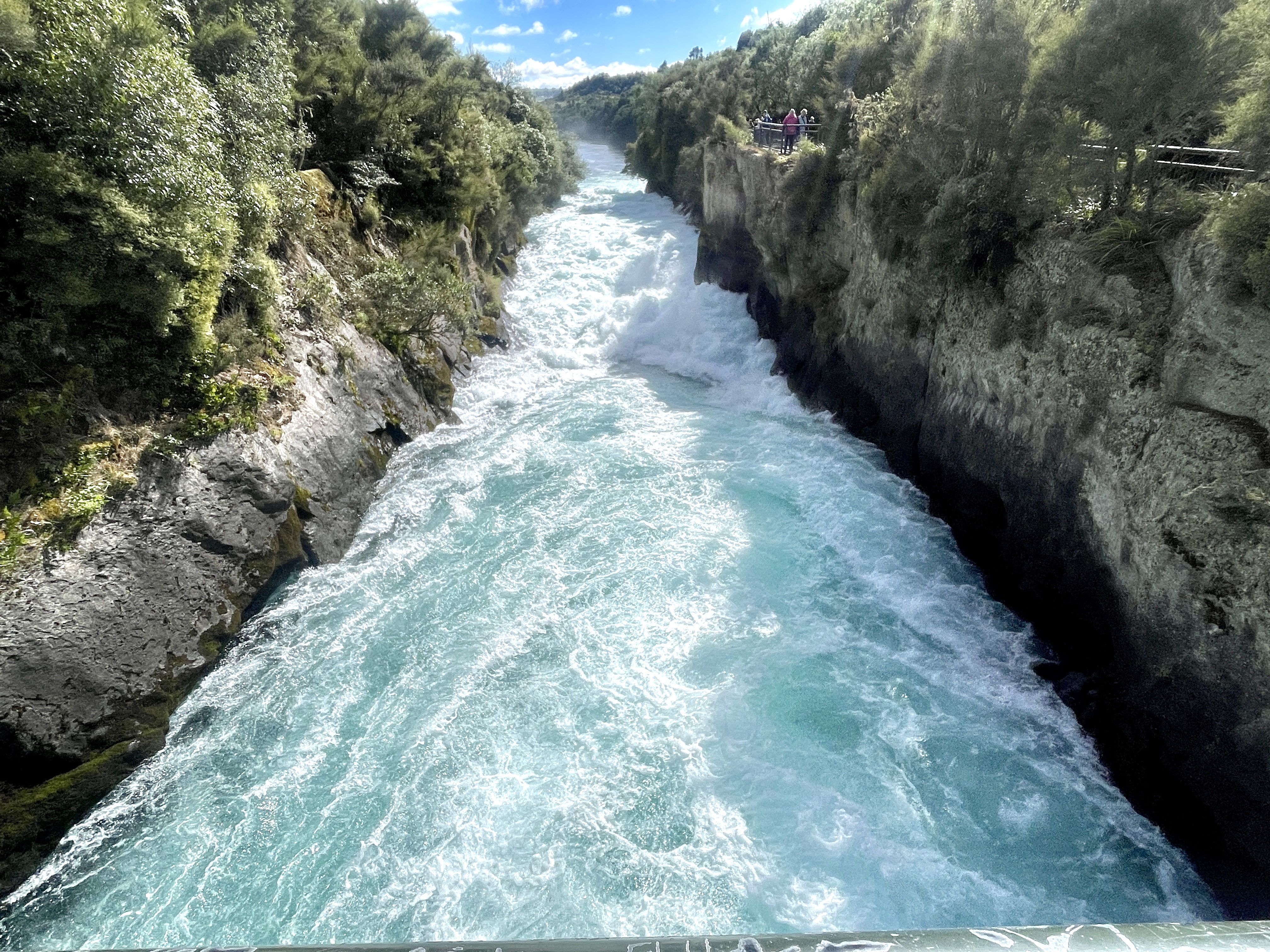 타우포를 들어가기 못미처에 있는 후커폭포에 도착한다. 주차장까지 따로 마련되어 있는데 입장료를 받지 않는다. 차에서 내리는데 물이 파도치며 흐르는 소리가 들려온다. 흘러내리는 강줄기가 급하게 좁아지면서 마치 폭포가 되어 쏟아질 듯 흘러내린다. 높은 절벽에서 쏟아지는 일반적인 폭포가 아닌 강물이 쏟아지는 진풍경이다.