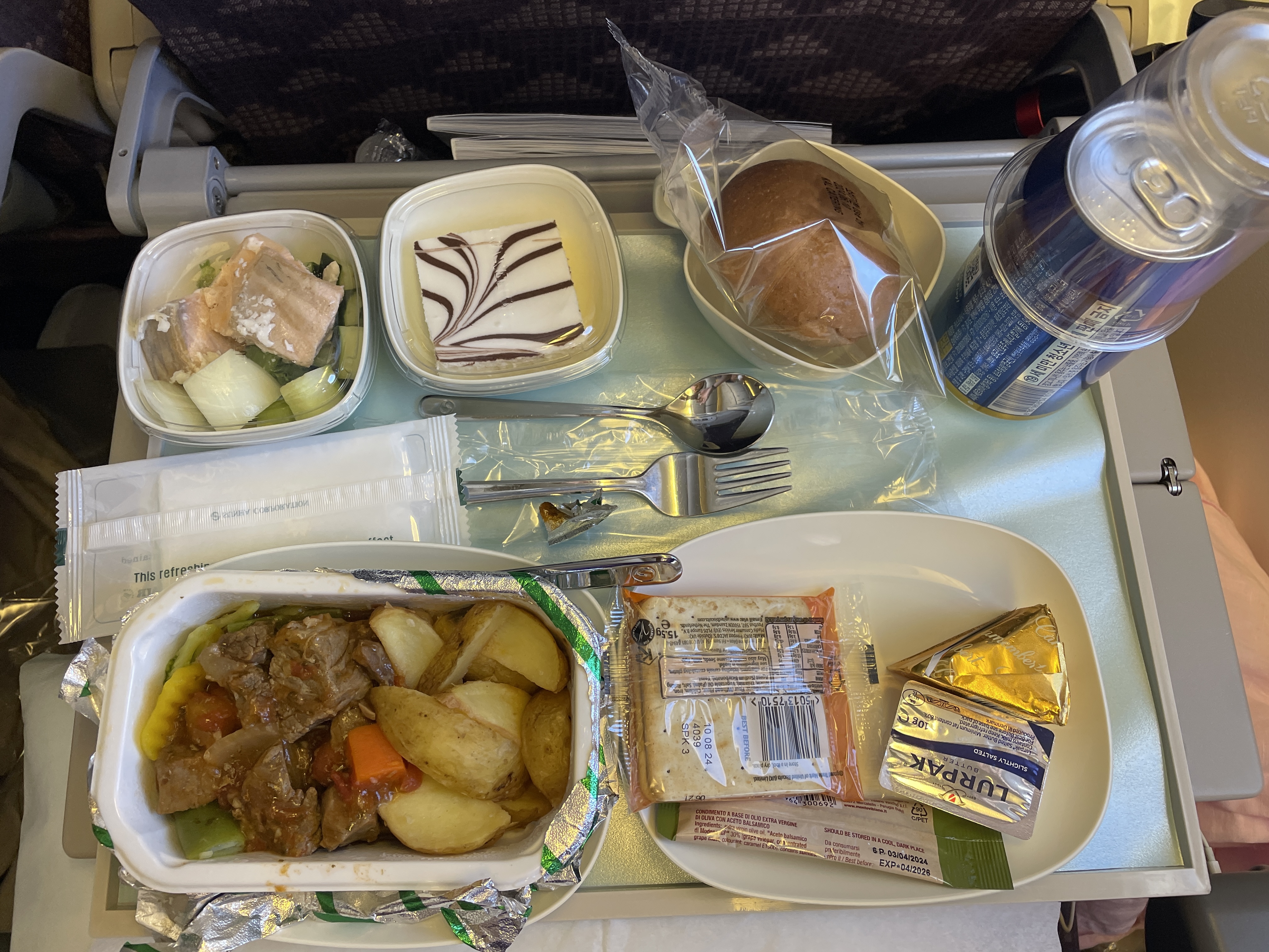 역시나 이륙한 지 30분가량 지나면 비행기는 정상궤도에 진입하고 승무원들 손길이 무척 바빠진다. 기내식을 제공되는 순서가 왔다. 우리는 라운지에서 배고픔을 이미 지우고 올라왔지만 해외여행을 할 때마다 갖는 첫 번째 순서가 기내식이니 그냥 패스를 할 수 없지 않은가. 우리는 제공되는 메뉴 중에서 한식과 양식을 각각 하나씩 주문하여 나눠먹기로 한다.