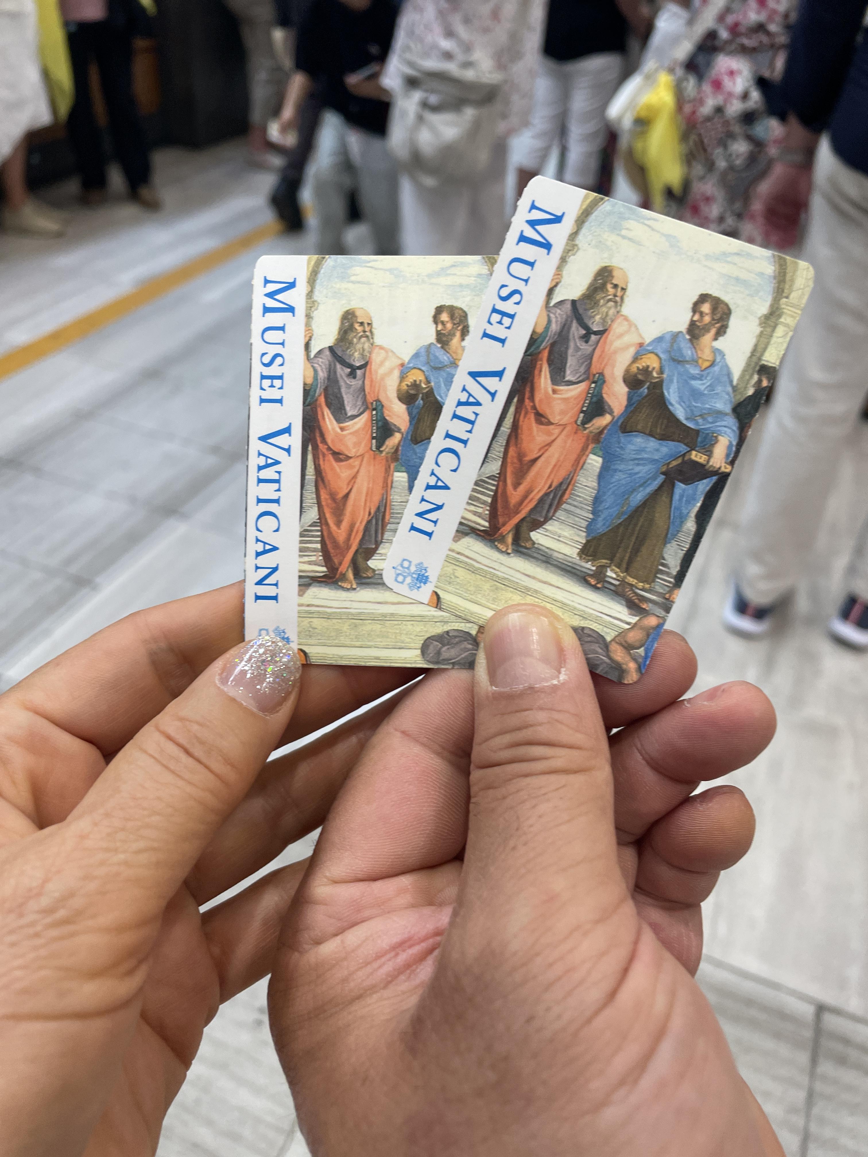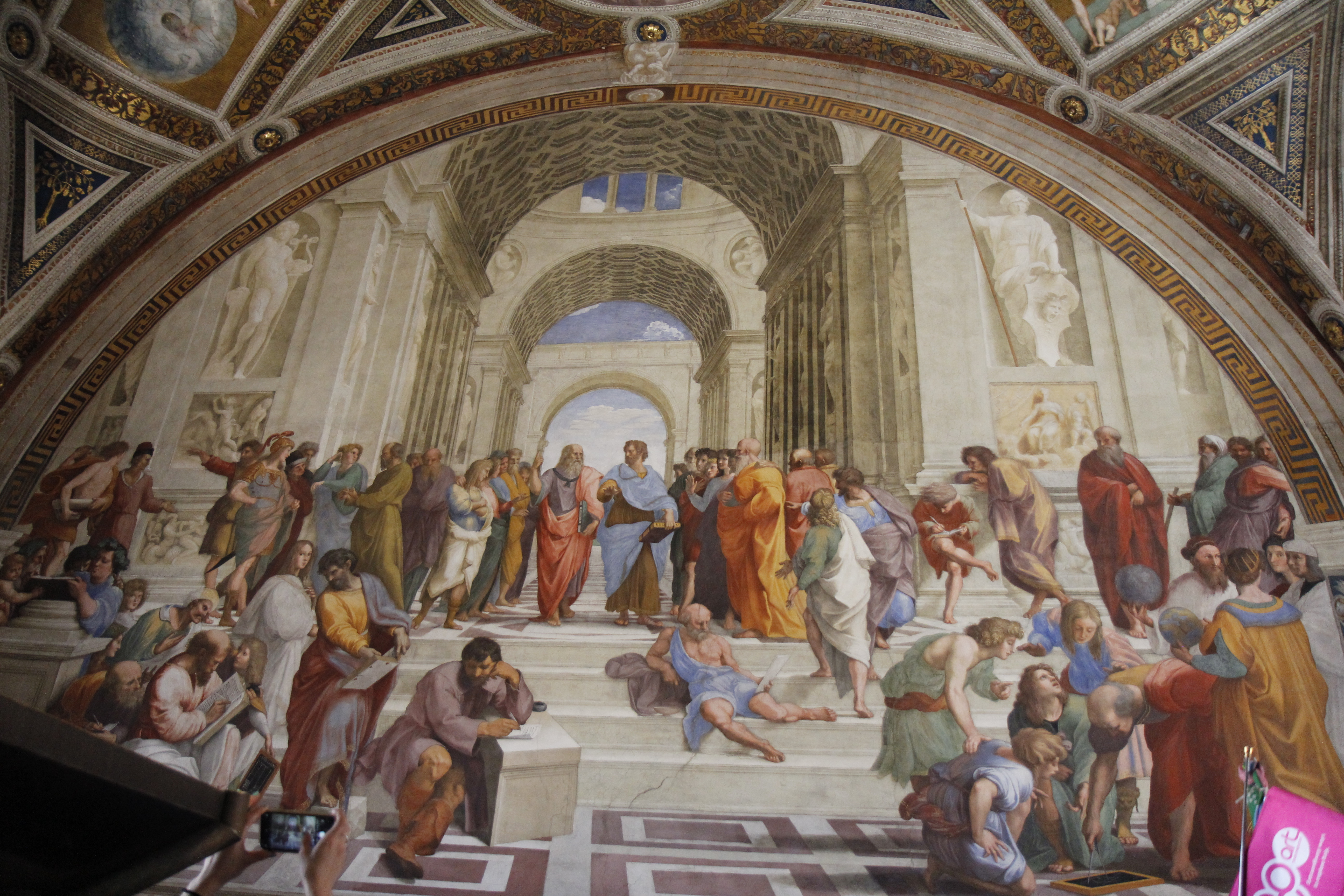 서명의 방에 있는 ‘아테네 학당’ 그림 속에 플라톤과 아리스토텔레스 두 현인의 모습만 따와 박물관 입장권을 넣다보니 박물관을 입장하는 대부분 관광객이 바로 이 그림 앞에서 사진과 같이 인증샷을 찍기 위해서다. 그리고 그림 속에서 소크라테스, 헤라클레이토스, 피타고라스, 에피쿠로스, 알렉산드로스, 디오게네스 그리고 라파엘로 자신의 모습을 찾아보는 것도 하나의 재미다.