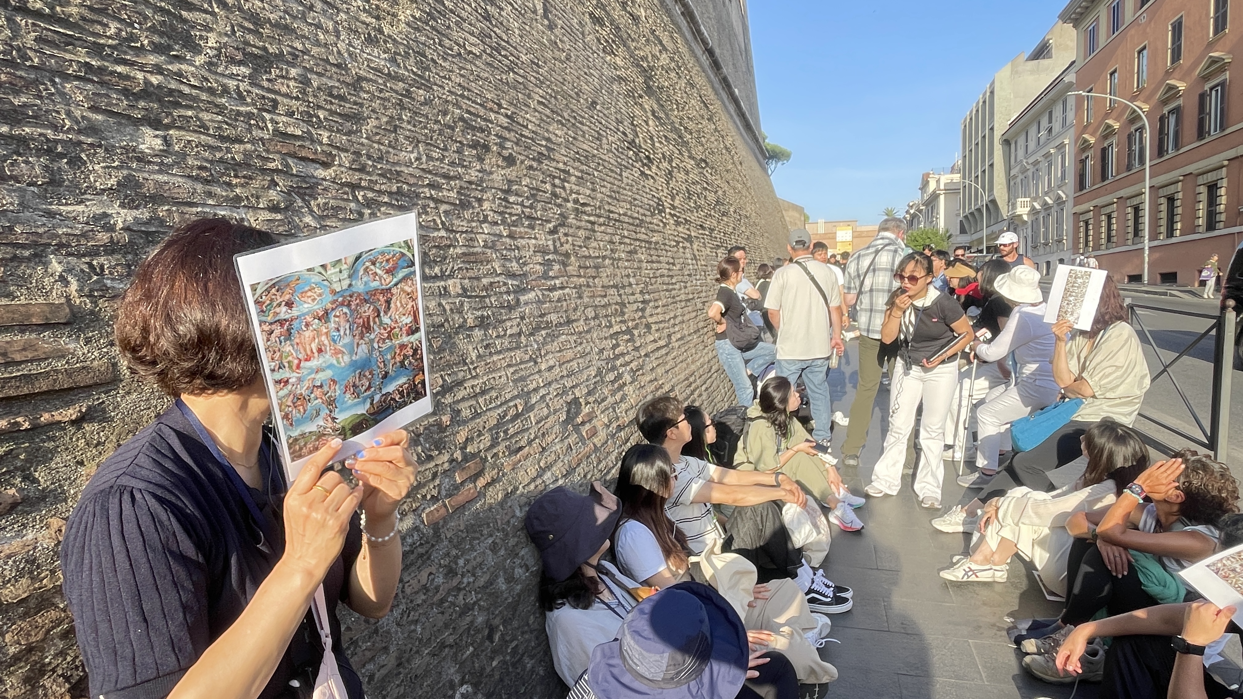 7시도 되기 잔에 박물관에 도착했다. 8:30 개장시간까지 한참 남아있다. 패스트트랙입장권을 구매하지 않은 일반입장객은 박물관 매표소가 열릴 때까지 이렇게 바티칸시티 담벼락에 앉아 길게 줄을 서야 한다. 무료하게 대기하는 시간을 활용하는 묘수를 지식가이드회사는 십분 활용한다.