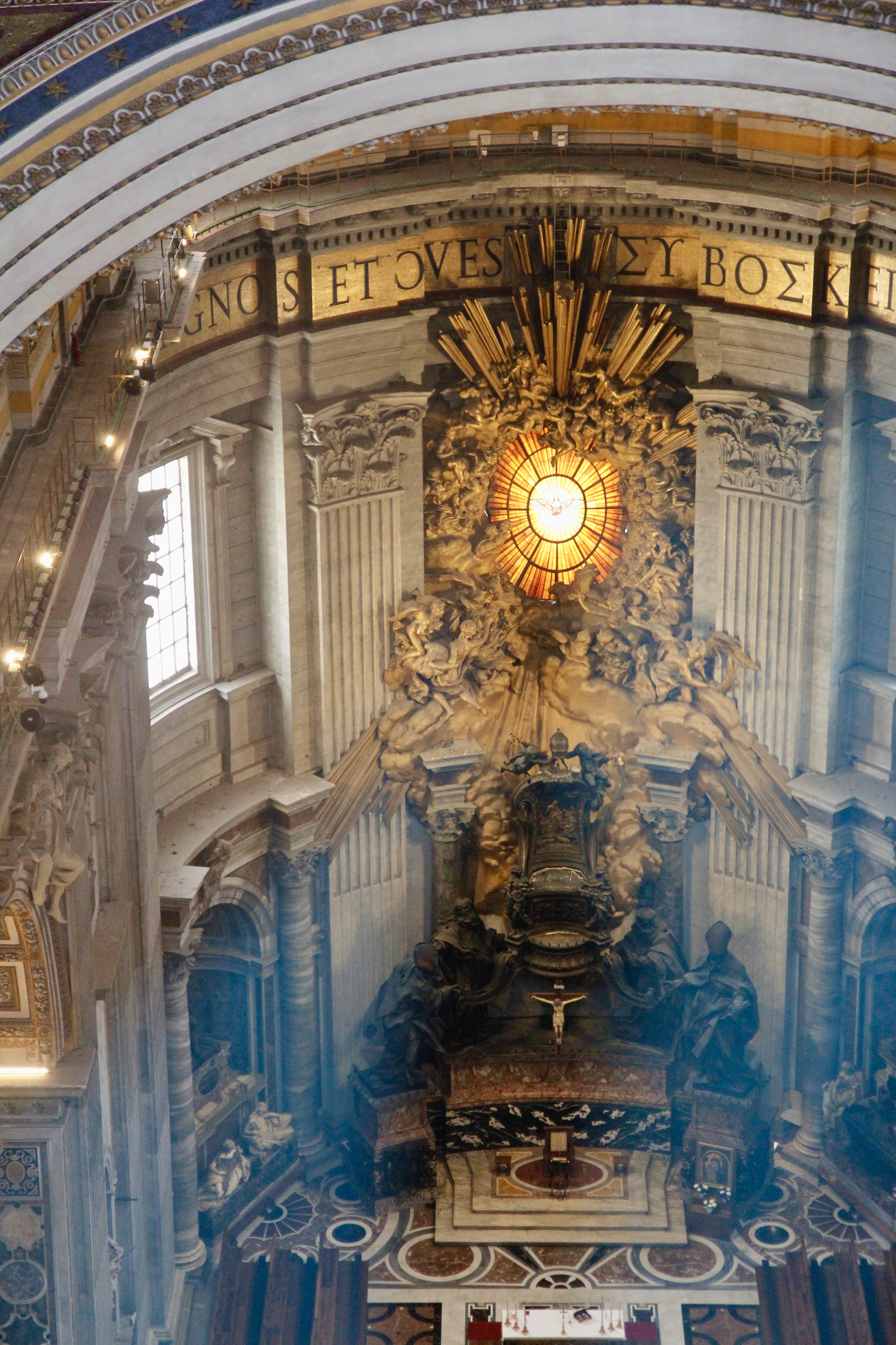 그리고 공사중이라 장막에 가리워진 베드로의 의자를 내려다볼 수 있다. 의자 뒤로 빛이 새어 들어오는 대리석 창이 보이고 대리석 창에는 12제자를 상징하는 12 개선과 삼위일체를 뜻하는 세 개의 원, 성령을 의미하는 비둘기가 있다.