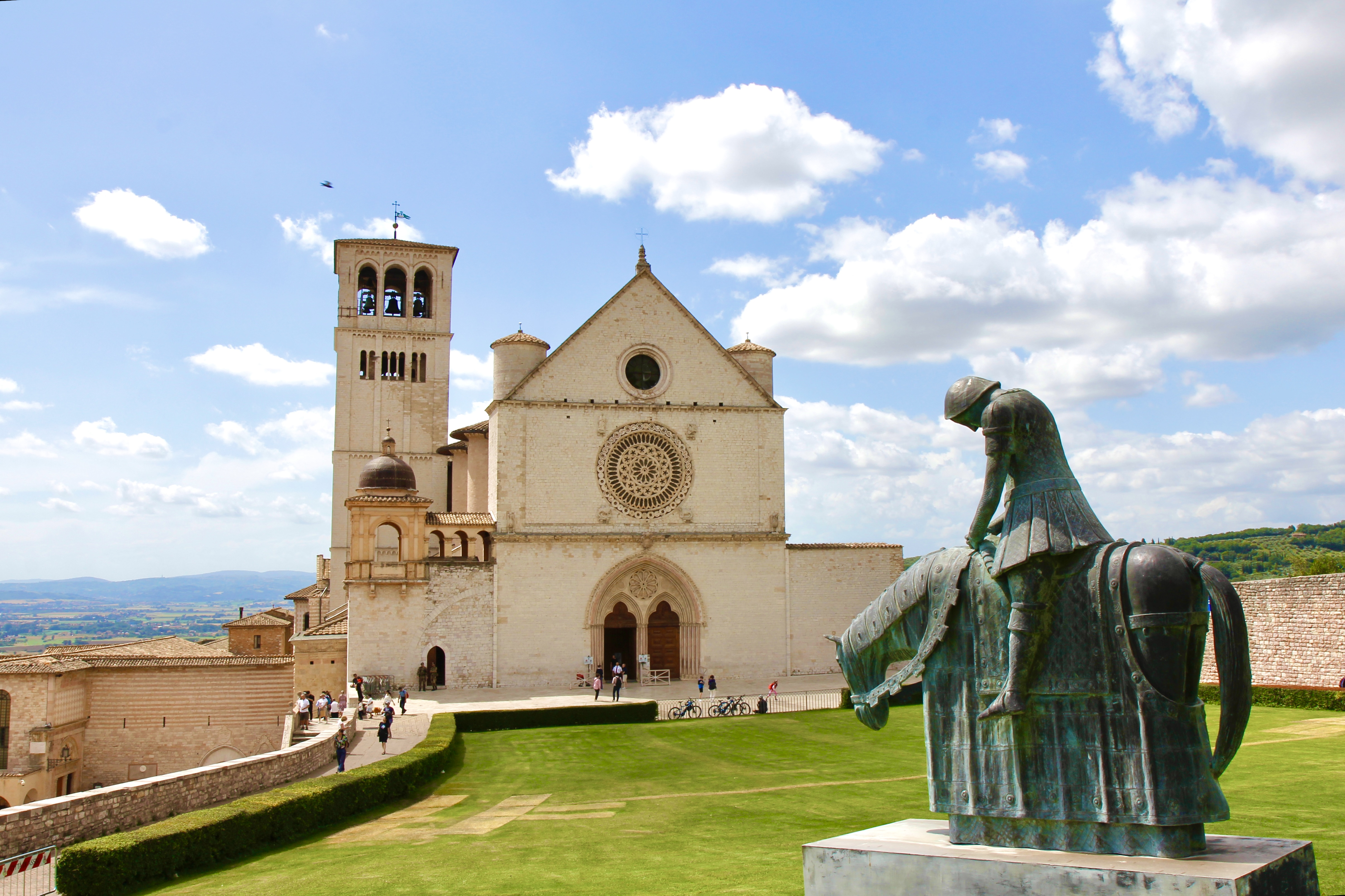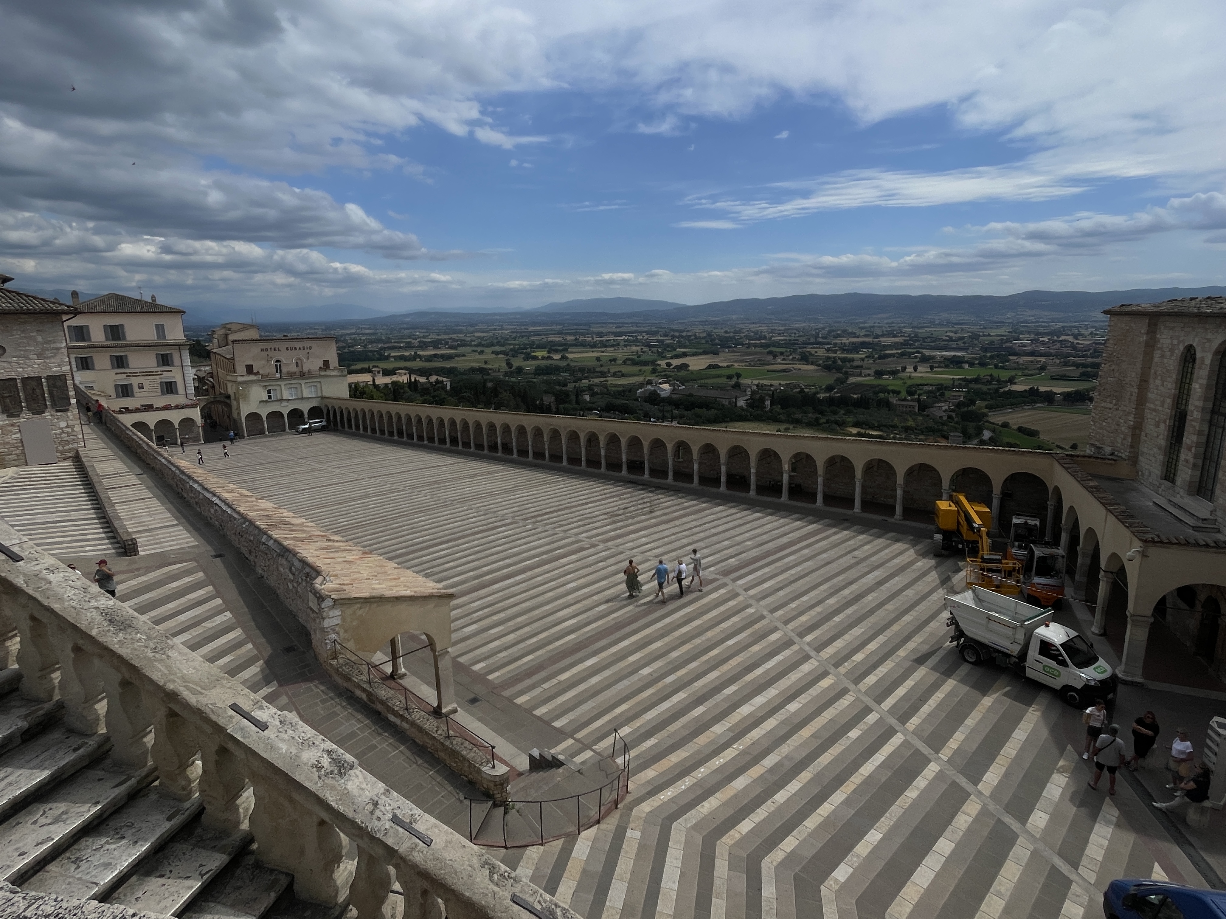 정원에서 내려다보이는 하부성당 앞에 긴 회랑과 그 뒤로 넓게 펼쳐진 아씨시평원이 시원스런 조망을 선사한다. 평원에서 언덕으로 치고 올라오는 바람마저 상쾌하다. 성당을 벗어나 코뮤네 광장으로 걸어가는 길 양 옆으로 고풍스러운 건물들이 줄지어 서있다.