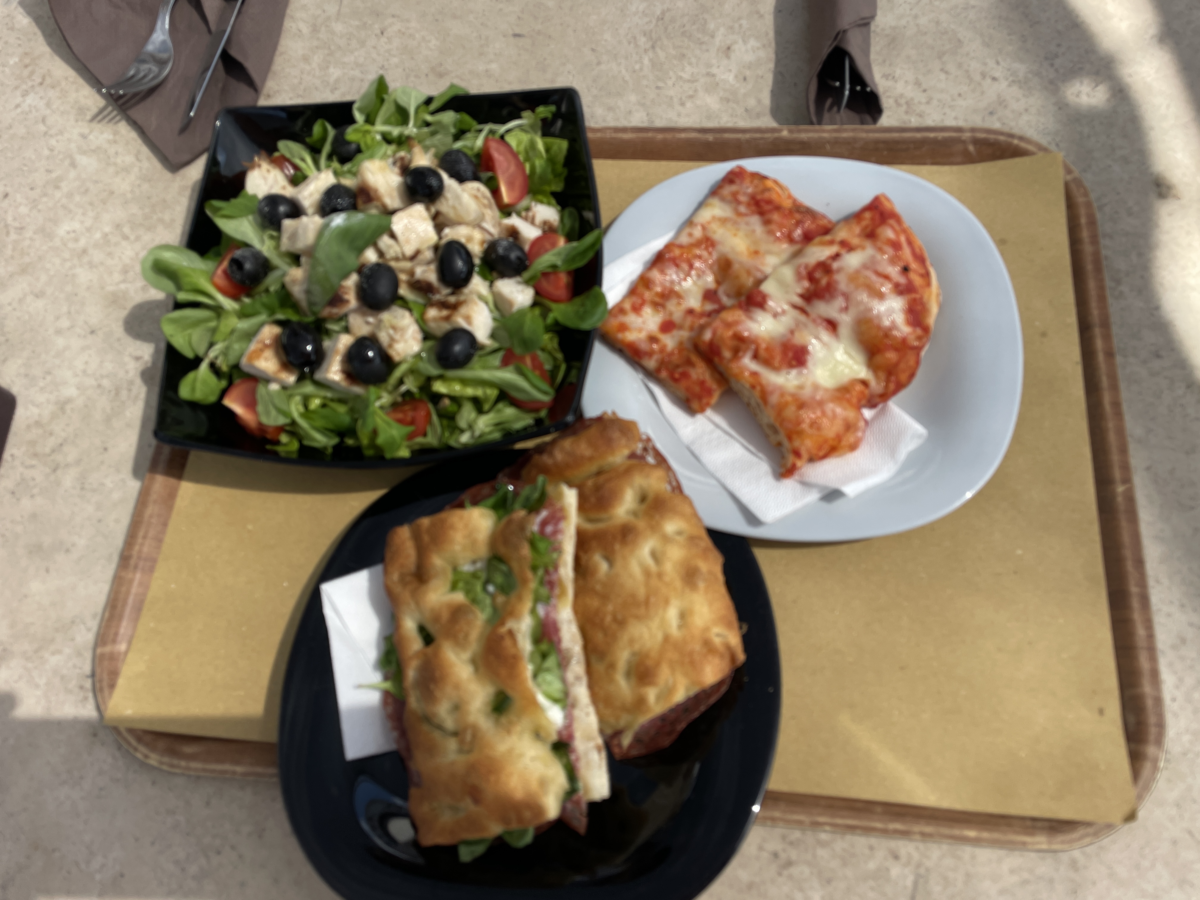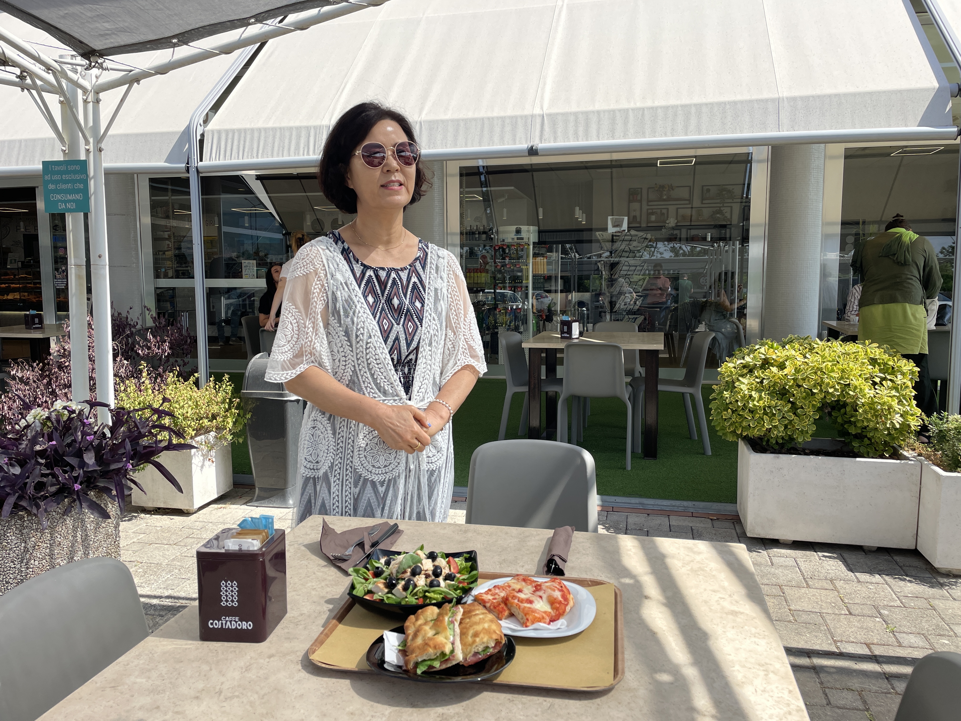 배정된 차는 오펠사의 준중형 Mokka 모델인데 출시한 지 1년도 되지 않은 새 차다. 카플레이어가 자동으로 연결되니 모니터에 휴대폰 검색 지도가 그대로 표시되니 걍 운전만 하면 된다. 이젠 이탈리아에만 적용되는 ZTL(Zone Traffic Limited)만 조심하면 된다. ZTL을 미리 알려주는 WAZE 어플을 구글맵을 대신해 장착했다. 로마를 벗어나 고속도로로 올라서서 달리는데 휴게소가 나온다. 우리나라 휴게소에 비하면 지극히 소박한 수준이어서 간단한 음식과 주유 그리고 쉼터가 고작이다. 늦은 아침 겸 점심으로 샌드위치, 피자 그리고 샐러드를 주문해 야외 식탁으로 가져왔다.