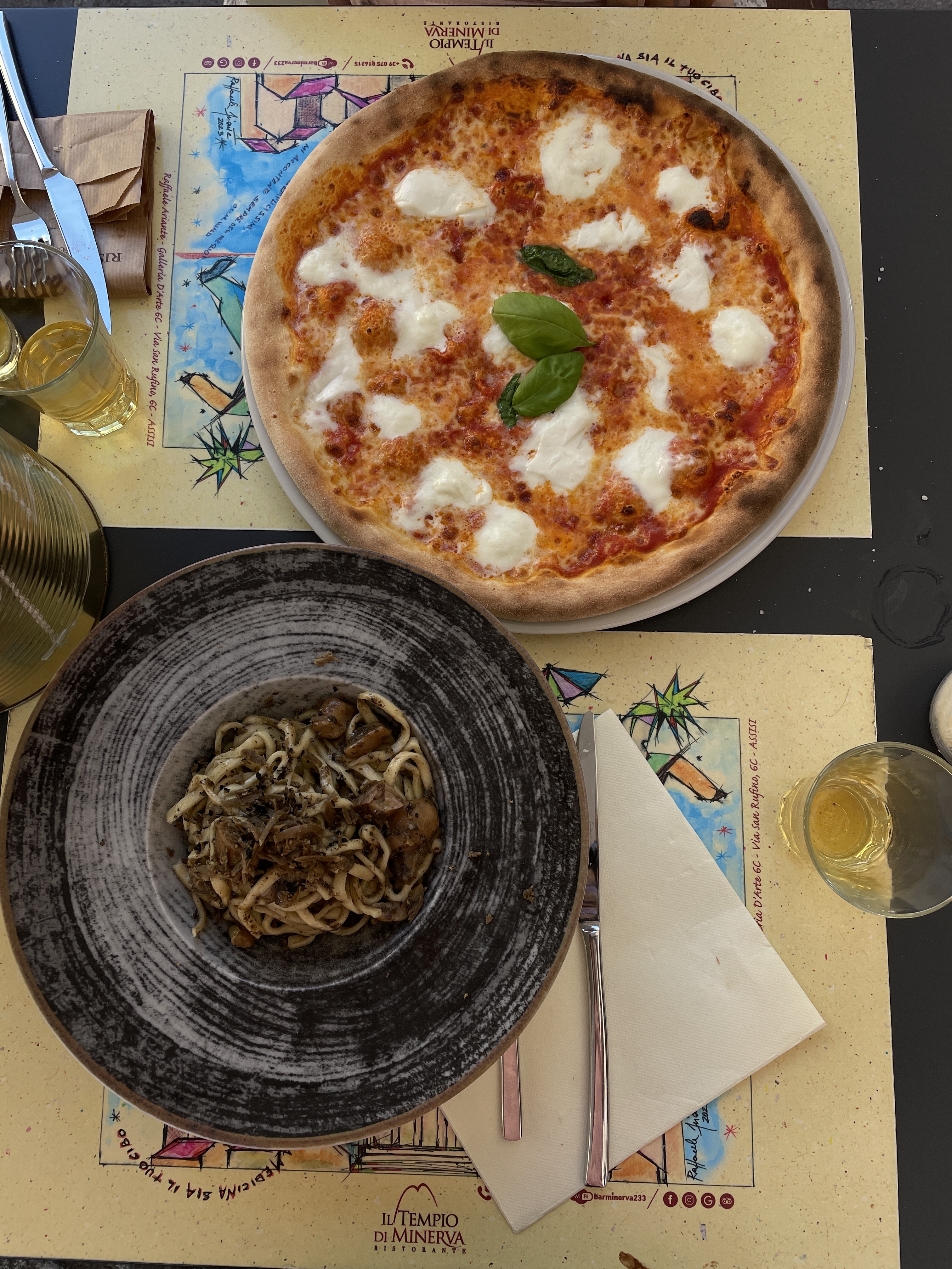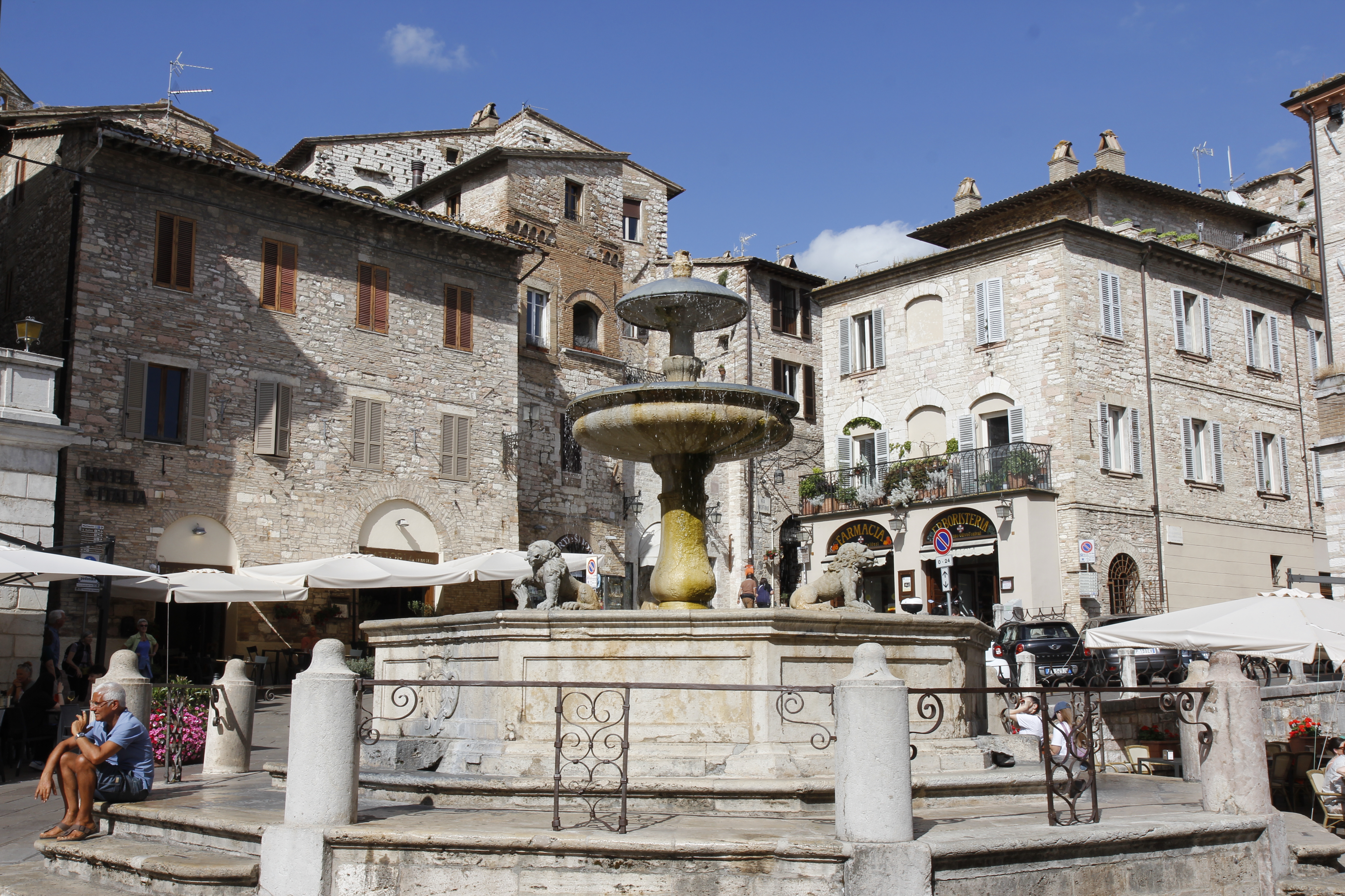 성당에서 코뮤네광장까지 도보로 10여분 거리다. 광장에는 세 마리 사자가 지키고 서있는 분수대가 서있고 그 주변으로 식당과 시청사 건물 그리고 미네르바신전이 자리잡고 있다. 늦은 아침을 먹은 지 시간이 많이 지나선지 배가 고파온다. 우리는 야외에 파라솔이 있는 자리에서 이른 저녁을 주문한다.