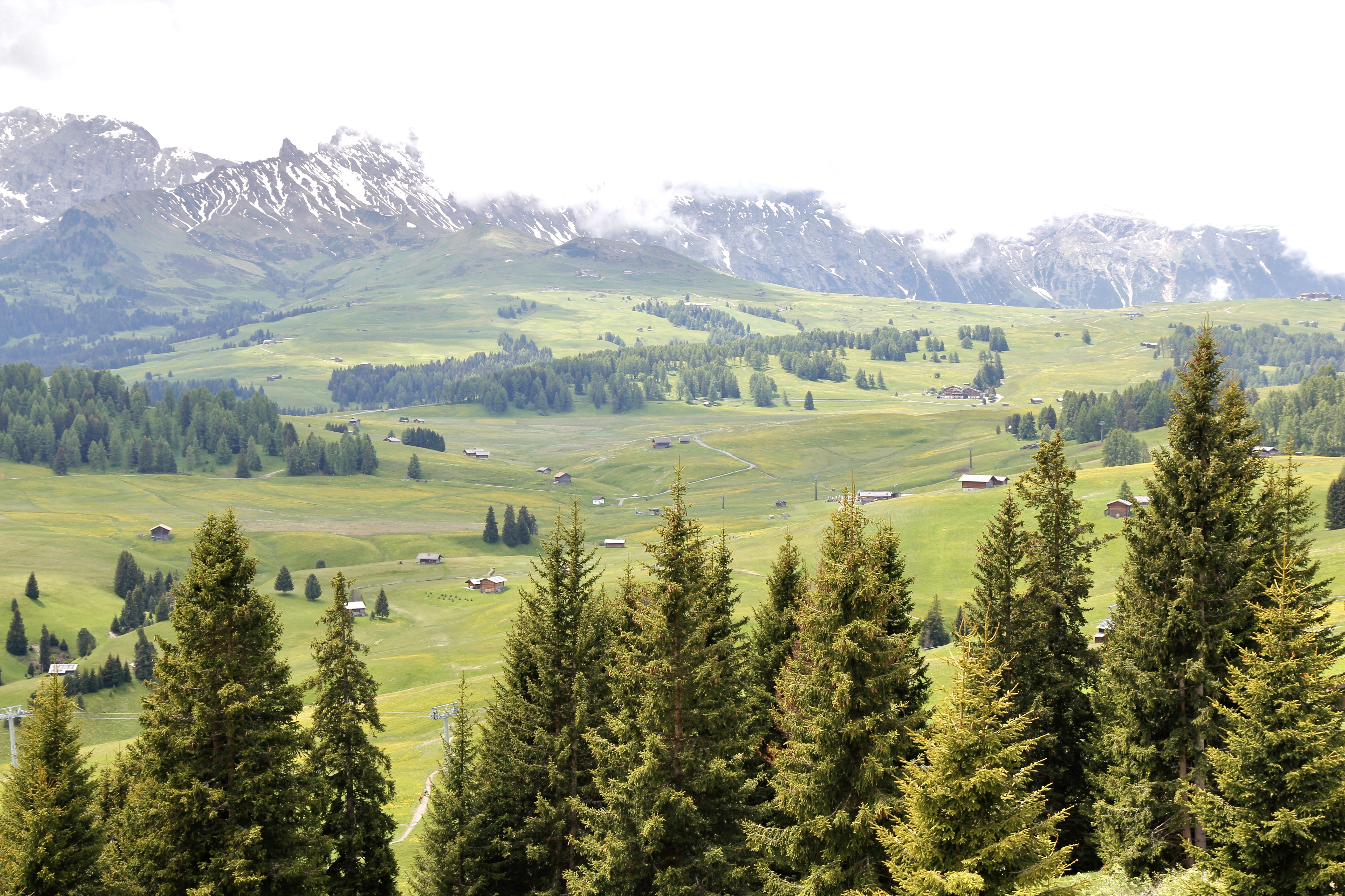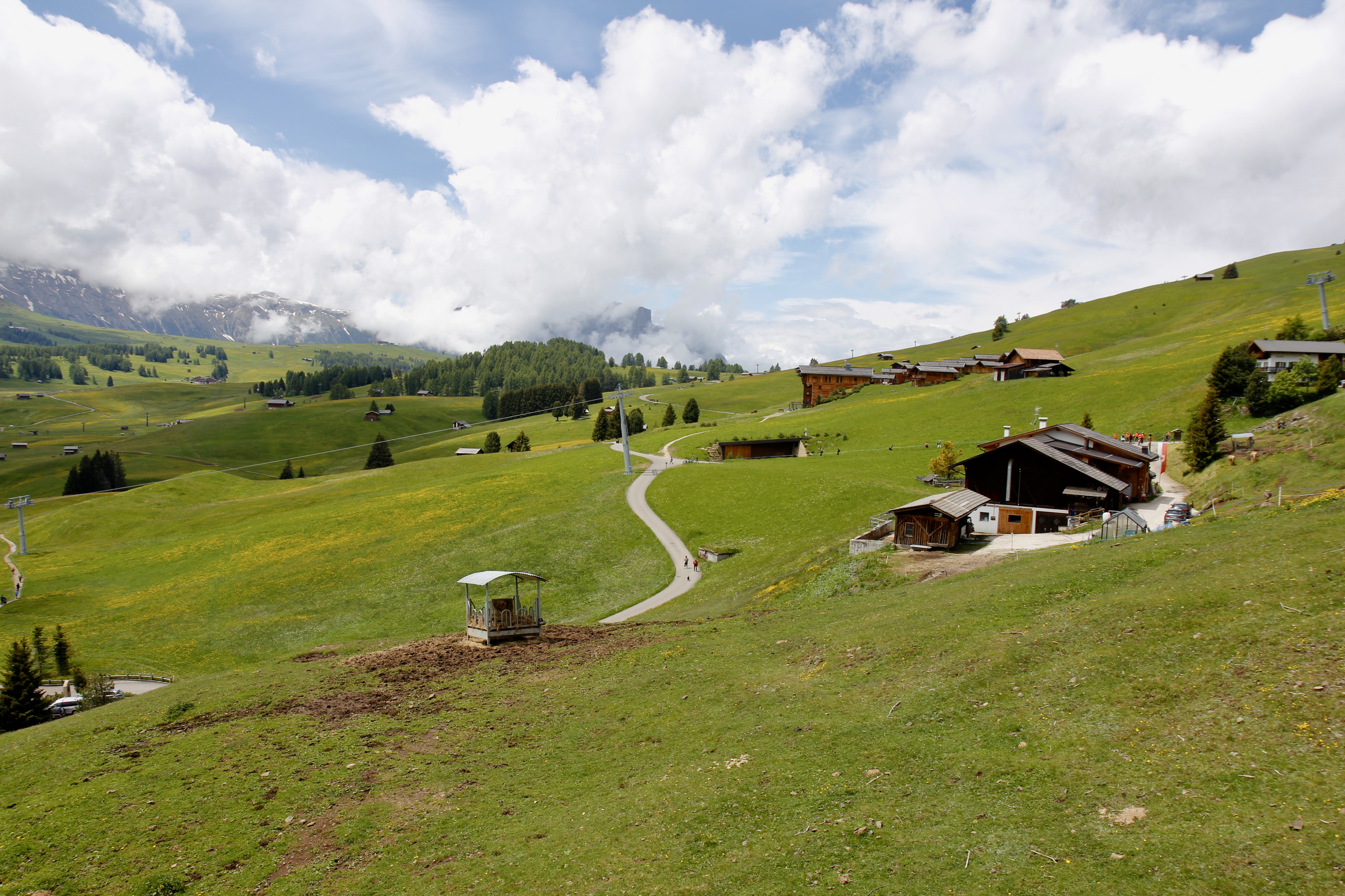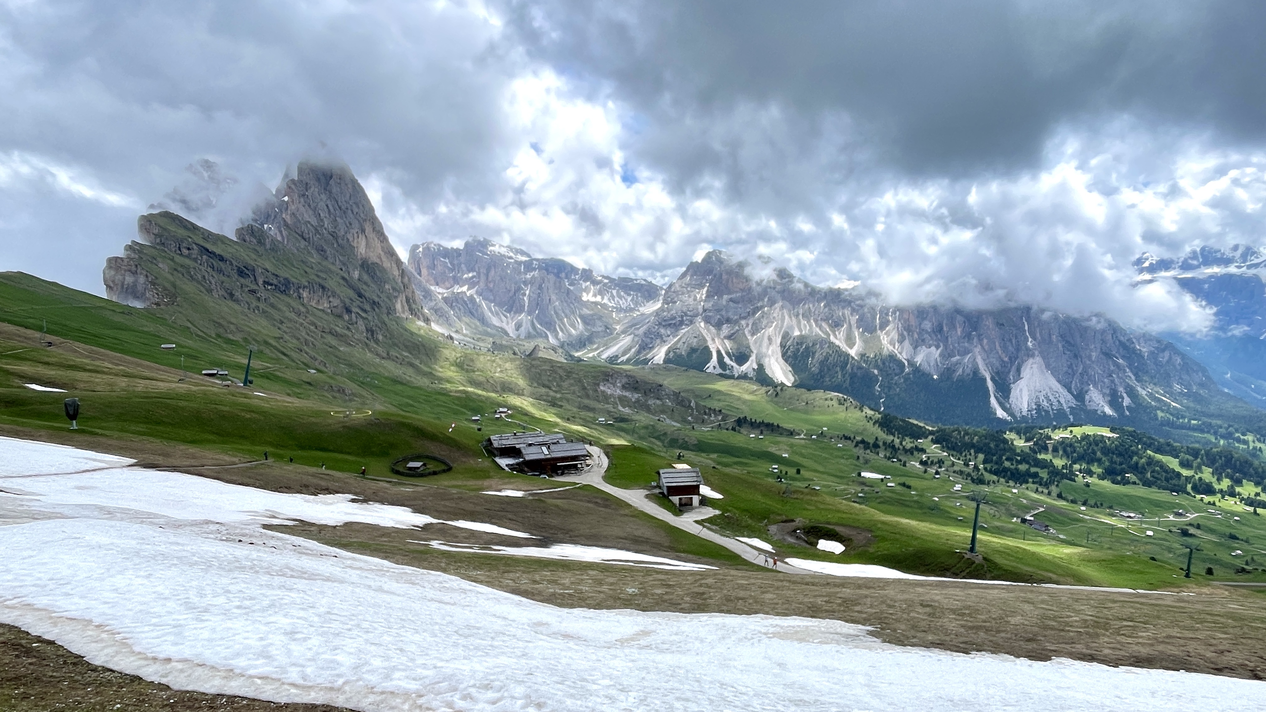 몽트섹에서 리프트를 내리니 그림같은 알페 디 시우시 푸른 초원이 눈앞에 펼쳐진다. 트레킹을 몽트섹부터 시작할 수 있지만 시간이 한정되어 리프트를 타고 Sonne sole까지 다시 내려간다. 여전히 뾰족이 솟아있는 산봉우리엔 구름들이 감고 있다. 드넓은 초원 끝자락에 서있는 봉우리 기슭엔 미처 녹지 못한 눈이 덮여있다.