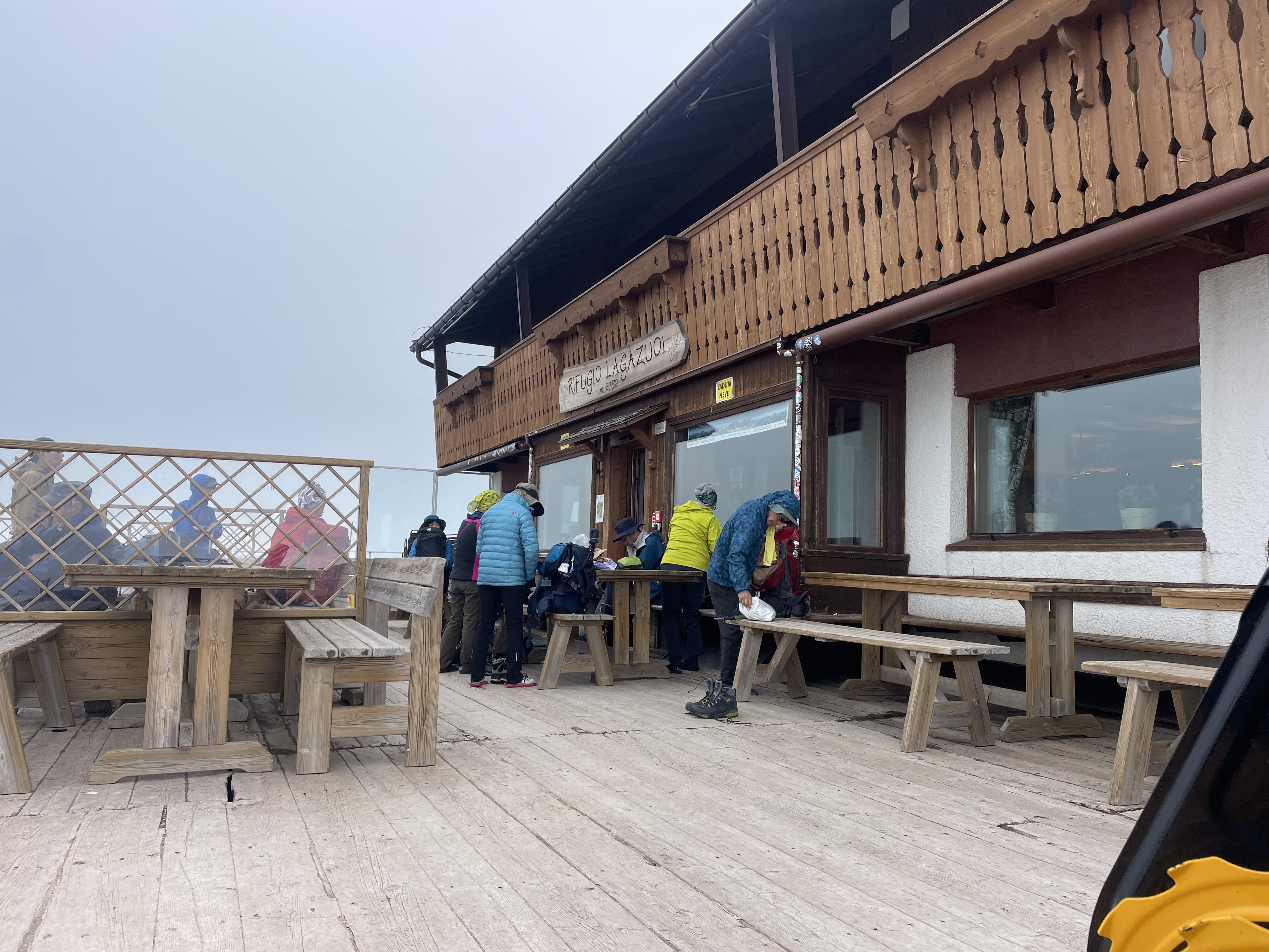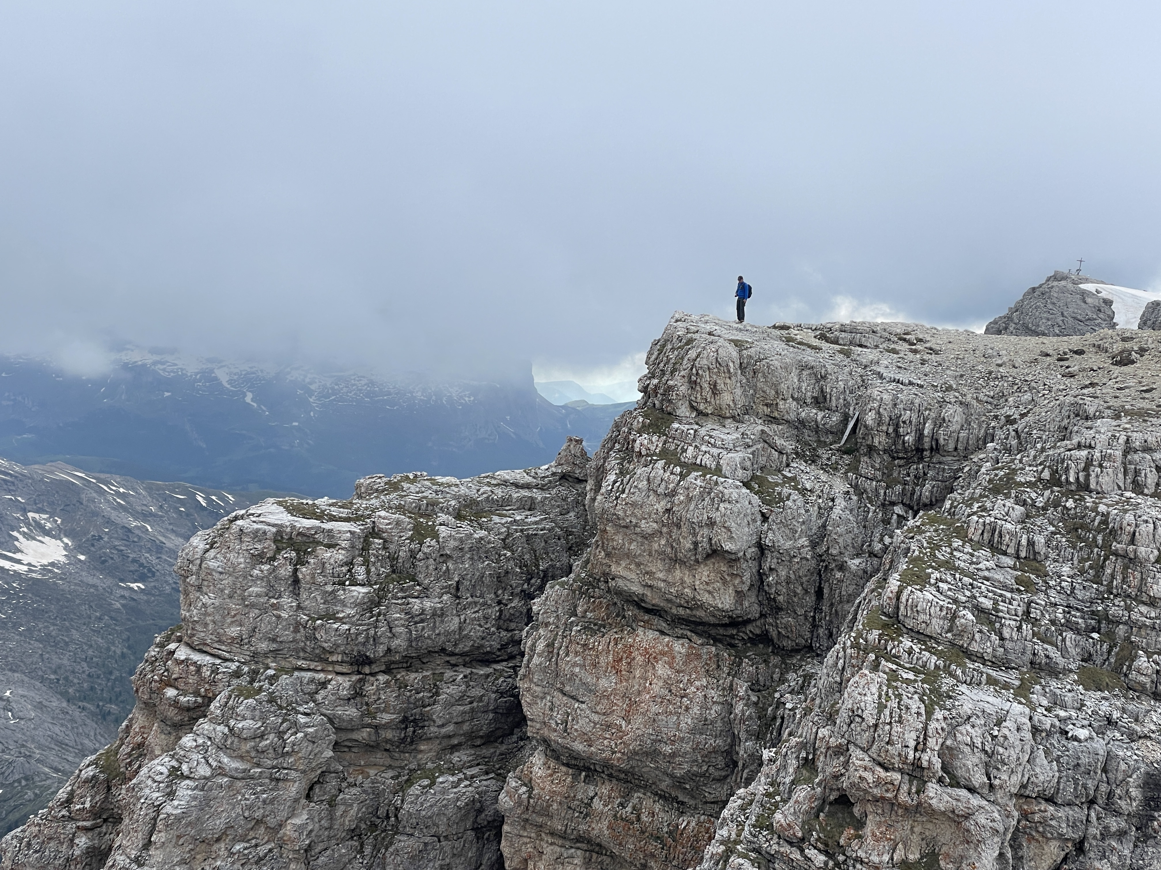 표고 2117m 파소 팔자레고는 돌로미티를 동편과 서편으로 나누는 분기점이다. 이 분기점에서 올라온 라가주오이에서는 돌로미티를 구성하고 있는 셀라산군, 오들레산군 그리고 피츠 보에 산군을 360도로 돌면서 일안조망이 가능하다. 산장 뒤로 이어지는 트레일을 따라 걸어 올라가 이들 산군을 직접 눈으로 확인해 본다. 절벽 끝에 서있는 어느 산객의 모습이 아찔한 데 그 뒤로 십자가가 보인다.