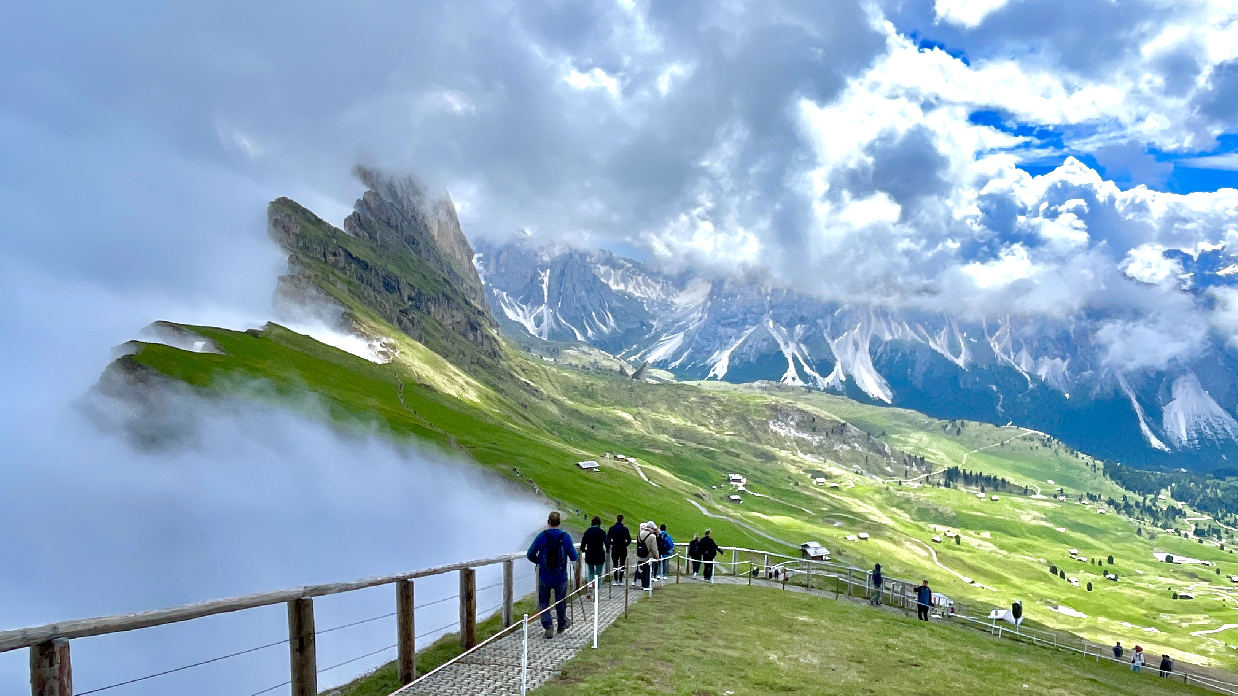 하루에 여러 곳을 가보려니 세체다에서 겨우 한 시간 트레킹하고 내려가야 한다. 아쉬움을 뒤로하고 케이블카 승강장으로 돌아온다. 올라올 때만 해도 낮게 깔린 구름들이 산봉우리를 얼르고 있었는데 우리가 내려가려니 서서히 걷히고 있다. 세체다 맞은편에 광활한 초원을 이루는 알페 디 시우시로 가기 위해 하산길에 오른다.