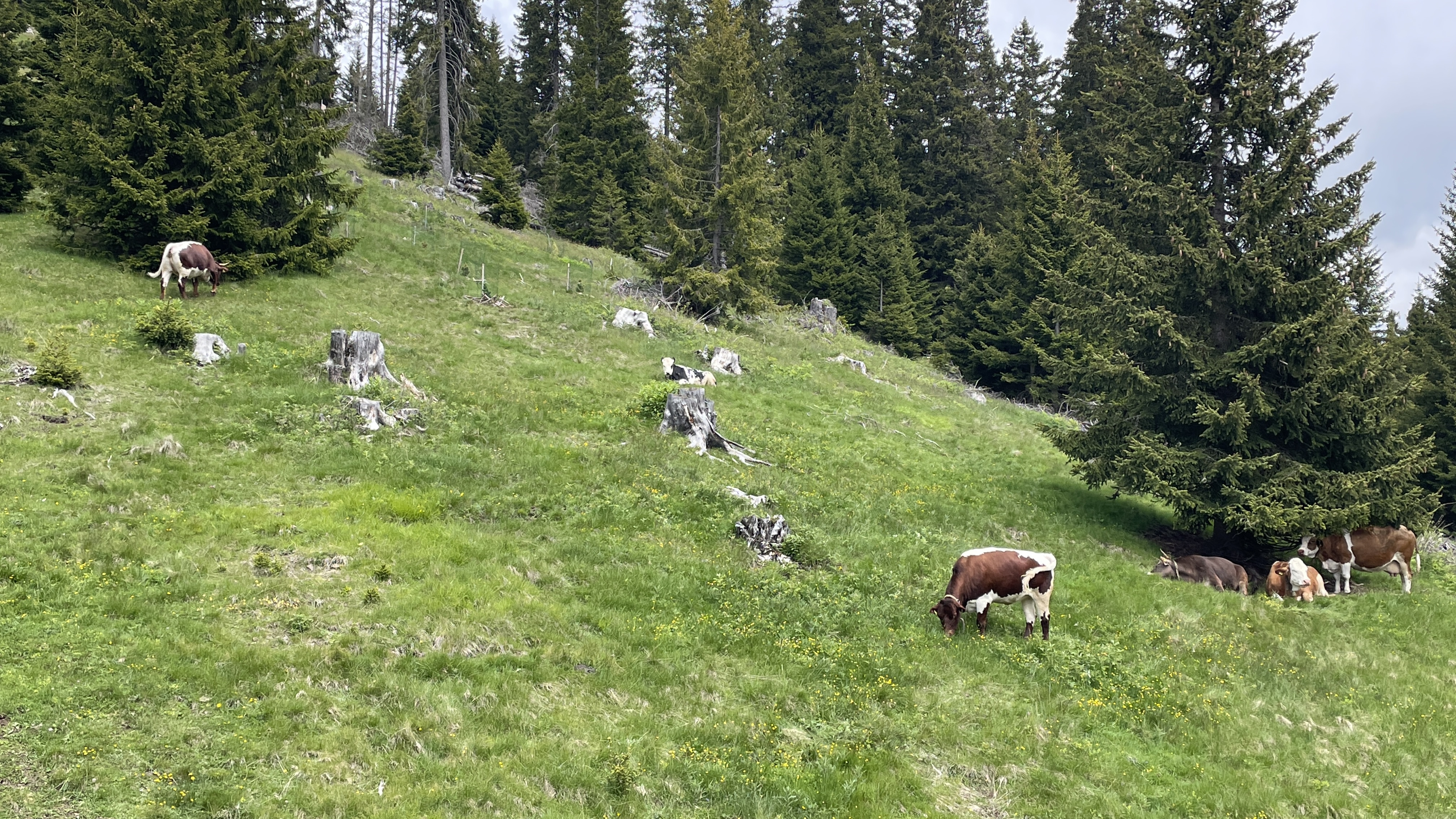 마치 노란 융단이 끝없이 펼쳐진 초원길을 느릿한 발갈음으로 걷고 있으니 세상 부러울 게 없는 듯한 세상에 들어선 거 아닐까. 초원에서 사진도 찍고 오전에 올랐던 세체다 첨봉이 서있는 곳을 바라보니 봉우리를 감고 있던 구름은 사라지고 대신 하늘에 드리운 구름을 이고 있다. 시간이 되어 다시 리프트를 타고 몽트섹으로 오르는데 커다란 요령을 목에 단 젖소들이 발아래서 풀을 뜯고 있거나 나무 그늘에 앉아 쉬고 있다.