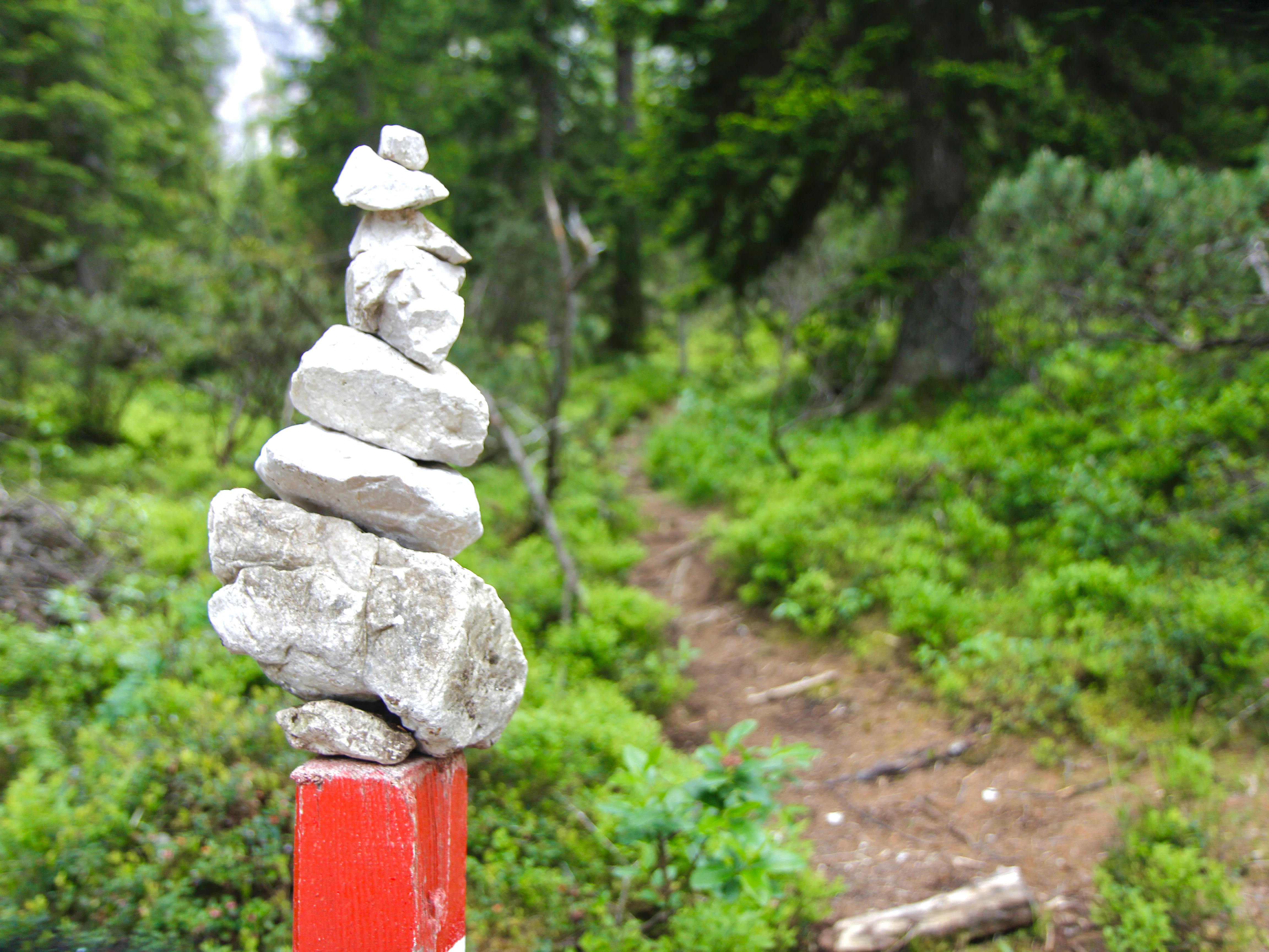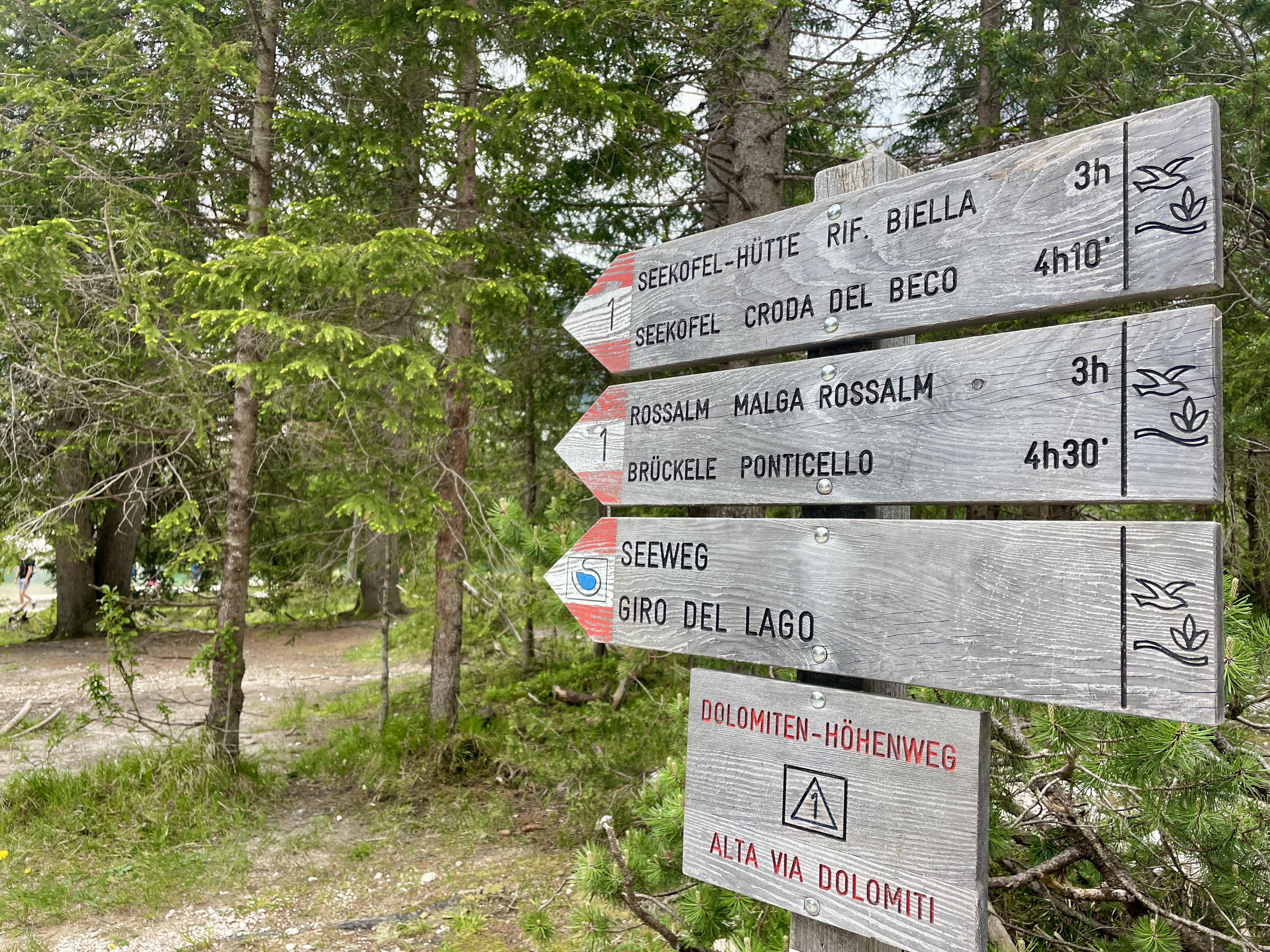 그다음부턴 평평한 오솔길 그 자체다. 트레일코스를 절반 가량 지난 지점이 호수 끄트머리다. 그 꼭짓점에 Alta Via 1 시작점이 있다. Alta Via 1은 돌로미티의 전문 트레킹 코스로서 산장과 산장을 이어서 계속 걸어가는 길이다. 뒤에 있는 숫자가 올라갈수록 트레킹 난이도가 올라간다고 한다. 마치 백두대간 종주길처럼 한 구간이 끝나는 지점에 있는 산장에서 숙식을 하고 다음날에 그 지점에서 다시 새로운 구간을 시작하듯이...