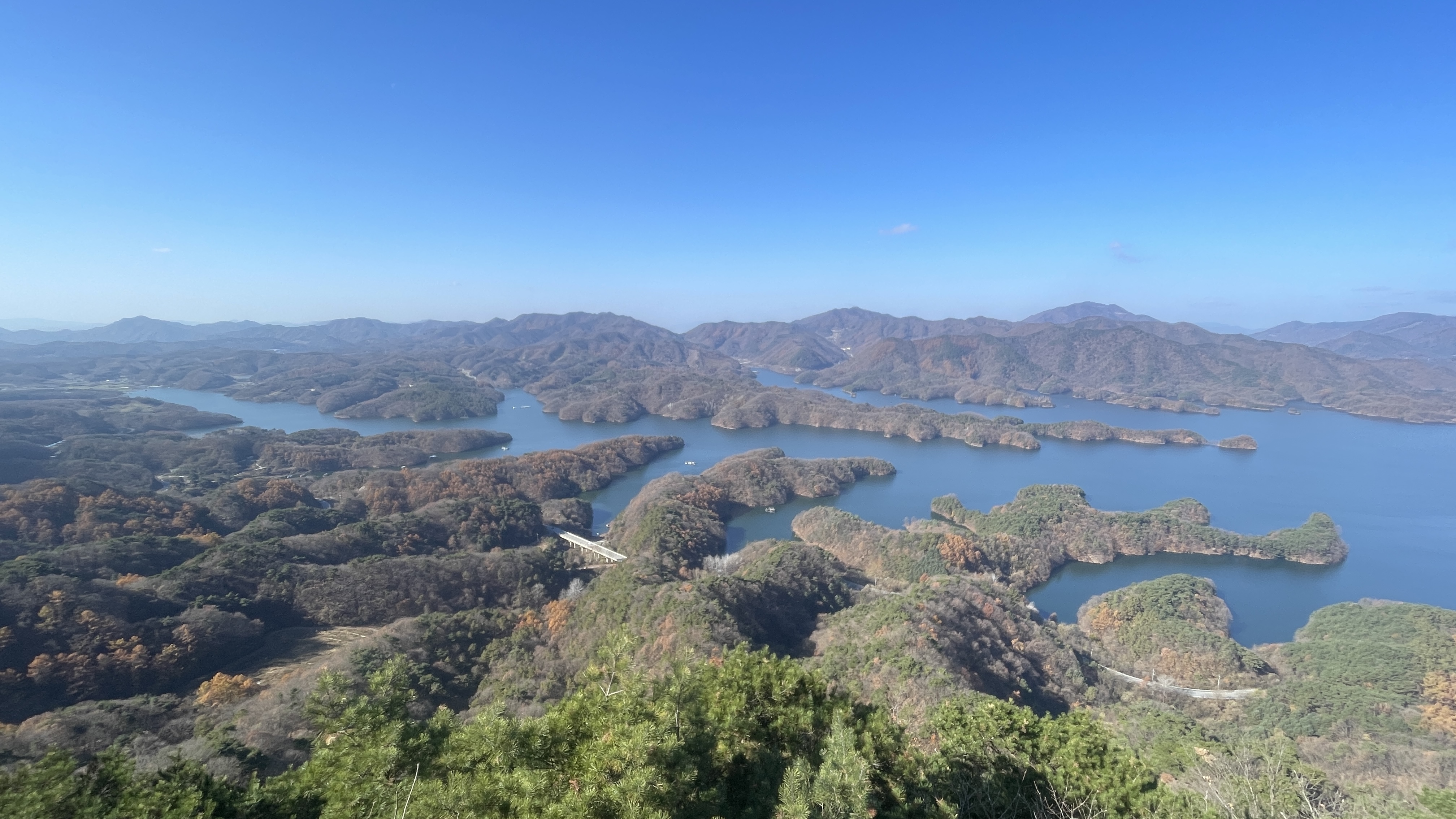 이정표에서 불과 10여 미터 걸어가니 이내 전망대가 나온다. 전망대에서 내려다보는 경치는 가히 Incredible!!! 호수 본류를 가로지르는 붉은색 옥순교와 지류를 건너는 출렁다리가 걸쳐있다. 푸른 하늘빛이 호수면에 내려앉아 하늘과 땅이 푸른빛으로 채워지고 그 옆으로 피톤치드를 발산하는 수목들로 채워져 있는 산줄기가 끊어질 듯 이어지고 있다. 아이들에게 찍은 사진을 보내니 ‘유럽 어디 유명한데 같아요!’ 한다.