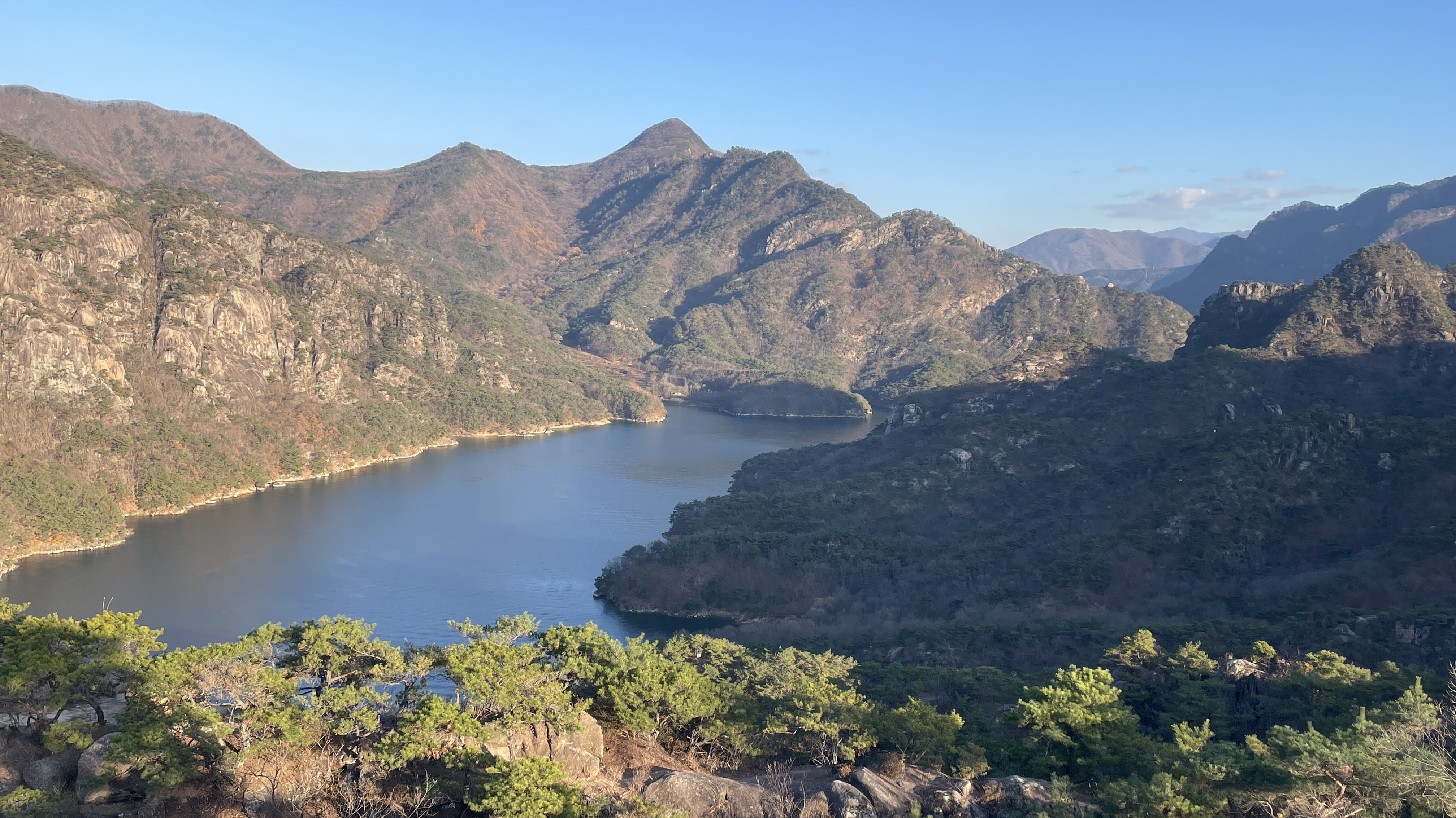 악어봉 구간 7부 능선쯤 오르니 시계가 탁 터진다. 악어가 호수로 들어가듯 몽글몽글한 산자락들이 한눈에 들어온다. 내려오던 어느 산객이 ‘여기서 보는 경관이 더 좋네’ 하는 소리에 연신 사진을 담아본다.