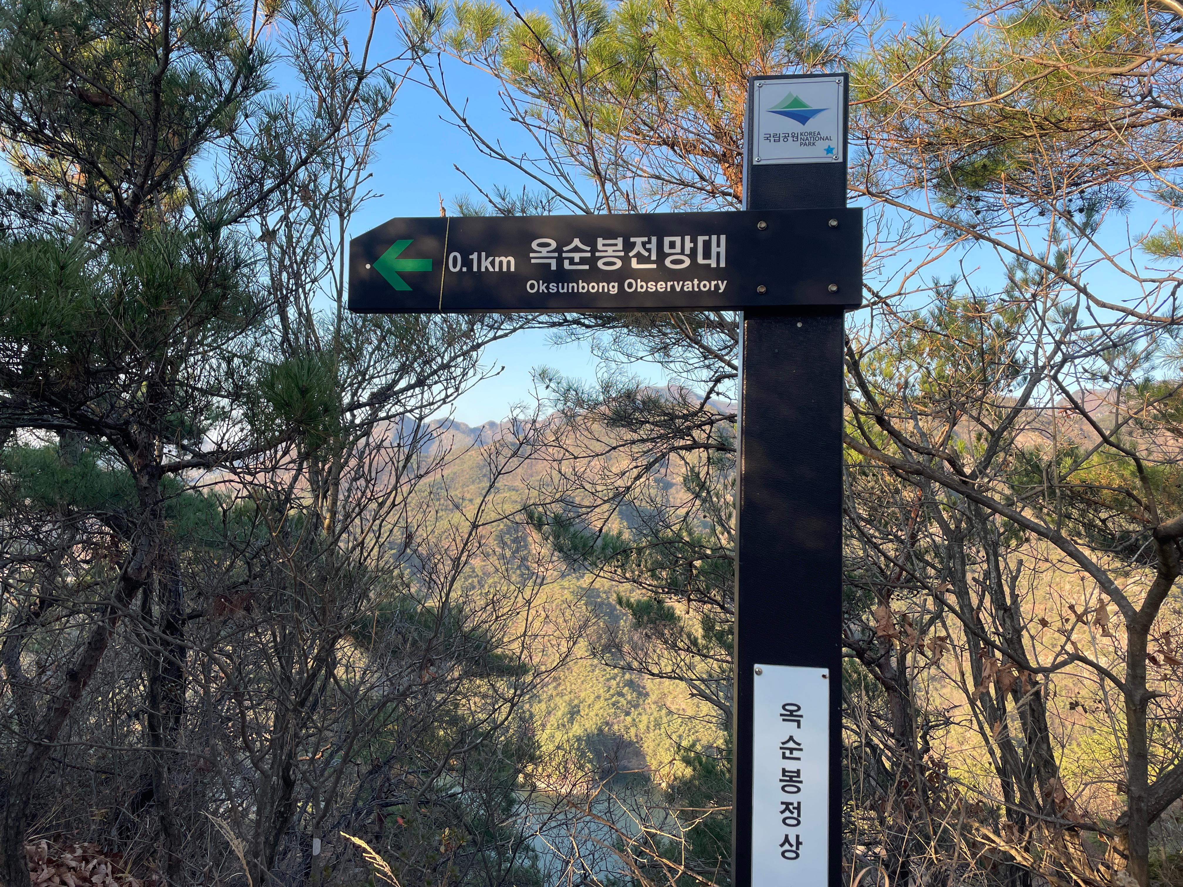 이제 산행을 마치고 차가 서있는 곳으로 돌아가려고 정상에서 막 내려오는 데 이정표 하나가 서있다. “옥순봉 전망대 0.1km”. 날도 저물어가는데 산길 100미터를 더 내려가야 한다는데 잠시 망설여진다. 하지만 예까지 와서 전망대를 그냥 지나치질 수는 없었다.