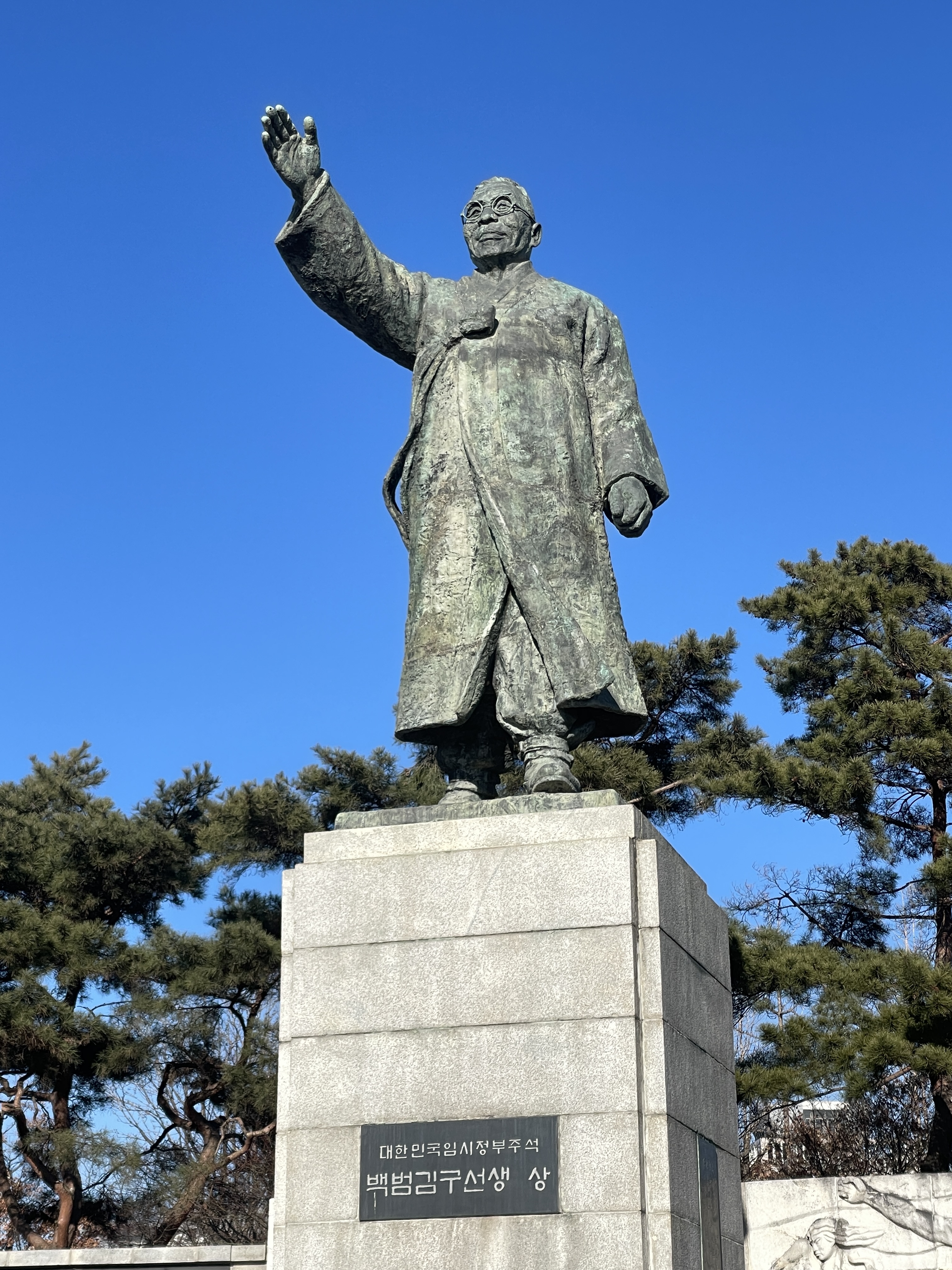 광장에 오르면 왼쪽에 호랑이가 지키고 있는 성재 이시영선생의 동상이 앉아있고, 그 오른편에 백범께서 왼손을 들어 어서 오라고 하신다. 백범이야 워낙 많은 영화나 교과과정 그리고 기념사업이 있어 너무 많이 알려져 있지만 성재 이시영선생은 오히려 많은 사람들에게 알려져 있지 않다. 가장 가슴 아픈 것은 성재선생의 6형제분 모두 가지고 있는 재산을 한 톨도 남기지 않고 몽땅 독립운동에 투입하였다고 한다. 명동일대의 땅을 판 600억원을 들고 만주로 가 절반은 신흥무관학교를 설립하여 독립군을 양성하는 데 사용하고 나머지는 임시정부에 보내졌다고 한다. 현재 가치로 대략 2조원에 이른다고 한다.