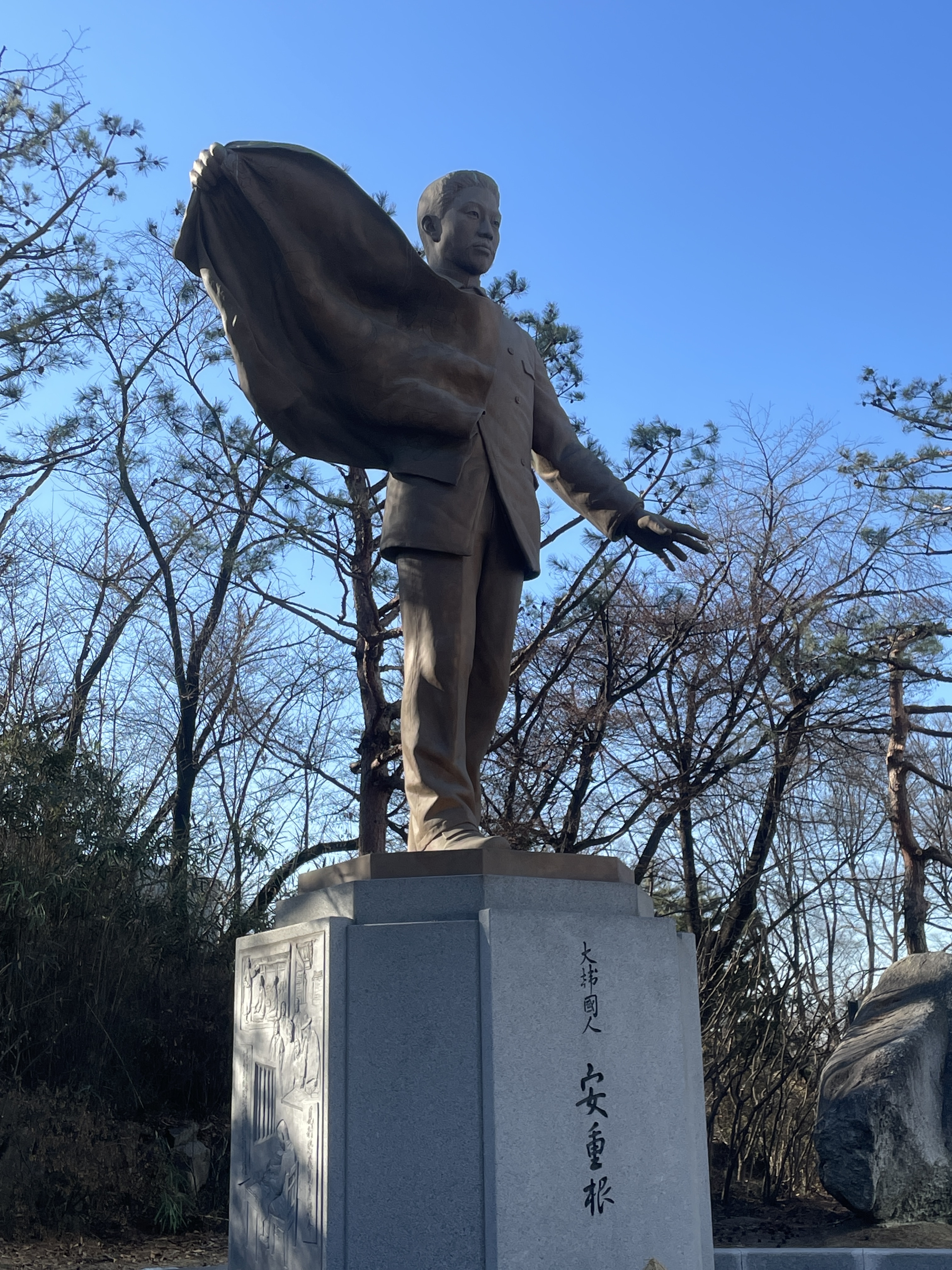 백범광장에서 남산도서관 쪽으로 발길을 옮기면 도마 안중근동상 그리고 그가 남긴 글을 바위에 새겨 마치 조각공원처럼 꾸민 광장이 나온다. 1909년 10월 26일 하얼빈역에서 이토 히로부미 가슴에 총탄을 쏜 안중근 그가 서있다. 얼마 전 소설가 김훈이 쓴 소설 하얼빈을 영화로 만들어 개봉되었다. 이토를 살해하는 숨막히는 과정을 영화화한 것으로 결말을 알고 있으면서도 보는 내내 가슴을 졸였던 기억이 난다. 이 영화가 인기리에 상여되지 일부 극우 내지는 극우성향을 띤 뉴라이트계열에서는 또다시 테러리스론을 들고 나온다. 그들은 과연 일제강점기에 다시 태어나길 원하는 걸까? 그래서 친일행위를 극렬히 함으로써 영원히 대한민국이 이 지구에서 사라지고 일본의 지배국으로 전락하길 고대하는 걸까??? 술자리에서 엔까를 즐겨 불렀던 박정희가 이토가 죽은 지 딱 70년이 지난 그날 부하의 총에 죽은 건 무슨 데자뷰...