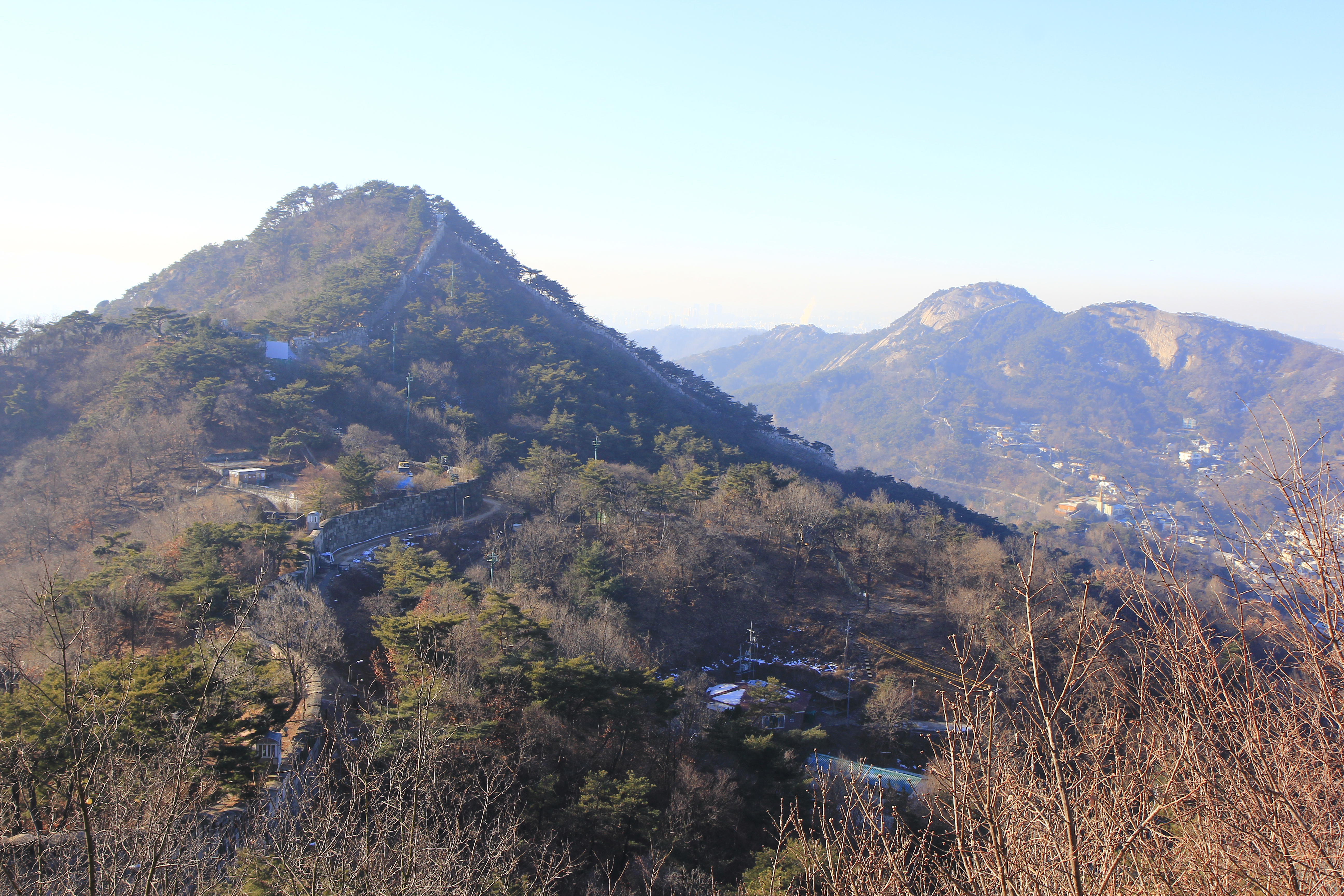 낙산공원에서 성밖길로 내려가는 데 멀리 북한산 비봉능선과 순성길 백악구간이 선명한 마루금을 드러낸 채 햇살이 흠뻑 받고 있다.