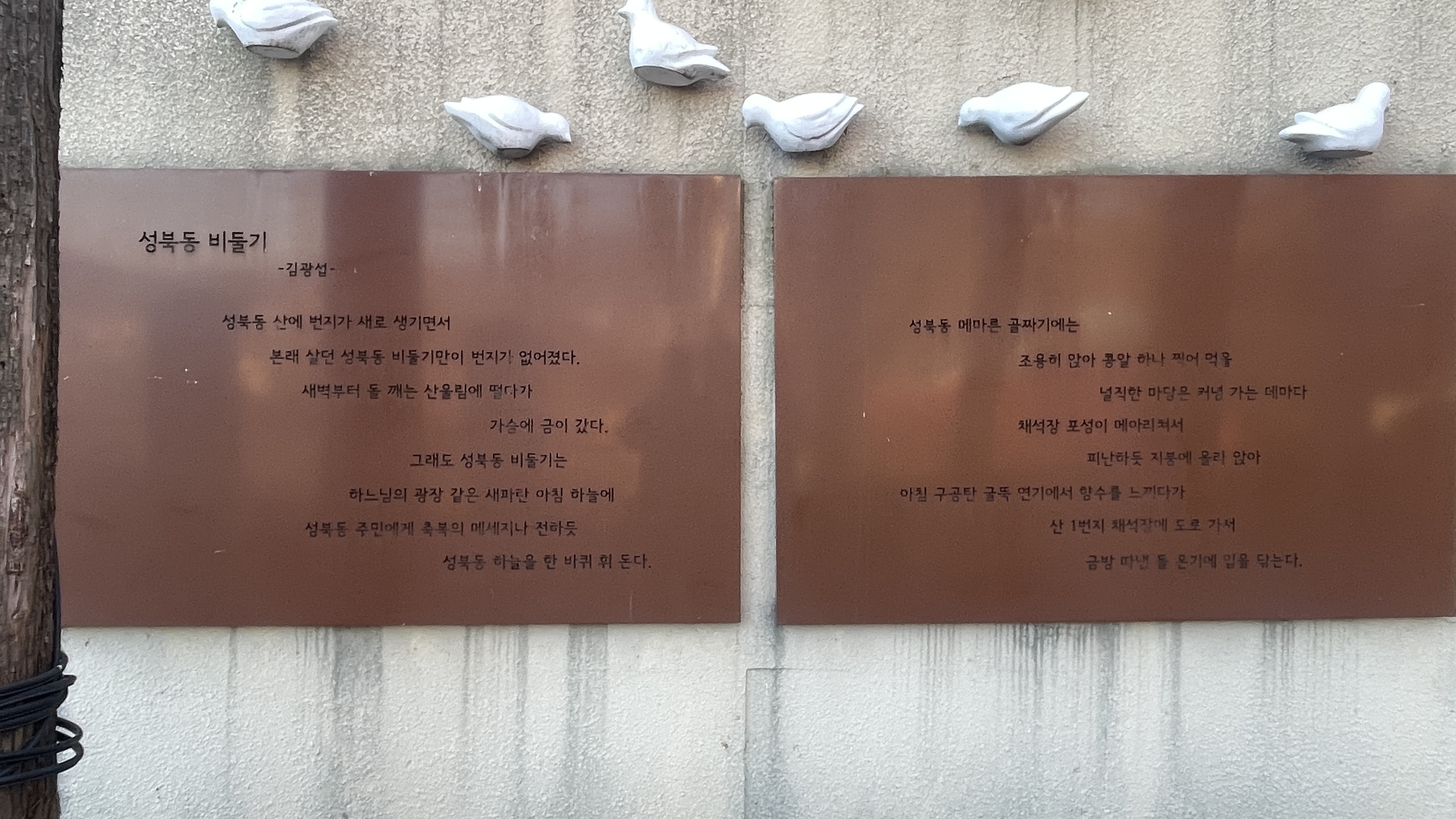 심우장에서 만해가 내리친 서슬퍼런 죽비를 맞고 다시 순성길을 이어간다. 심우장에서 시인 김광섭이 남긴 대표적 성북동비둘기 시가 걸린 비둘기공원을 돌아 와룡공원으로 오르면 대신고에서 시작하는 순성길이 다시 이어진다.